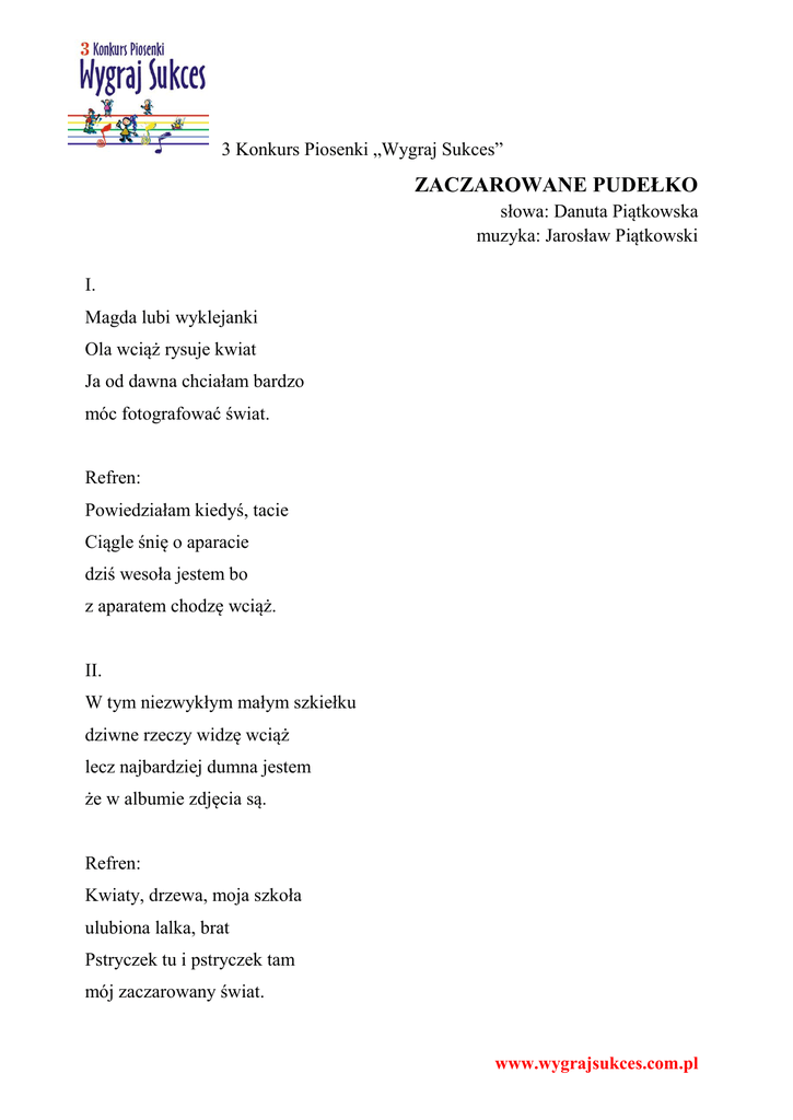 3 Konkurs Piosenki „Wygraj Sukces” ZACZAROWANE PUDEŁKO słowa: Danuta Piątkowska muzyka: Jarosław Piątkowski I. Magda lubi wyklejanki Ola wciąż rysuje kwiat Ja od dawna chciałam bardzo móc fotografować świat. Refren: Powiedziałam kiedyś, tacie Ciągle śnię o aparacie dziś wesoła jestem bo z aparatem chodzę wciąż. II. W tym niezwykłym małym szkiełku dziwne rzeczy widzę wciąż lecz najbardziej dumna jestem że w albumie zdjęcia są. Refren: Kwiaty, drzewa, moja szkoła ulubiona lalka, brat Pstryczek tu i pstryczek tam mój zaczarowany świat. www.wygrajsukces.com.pl