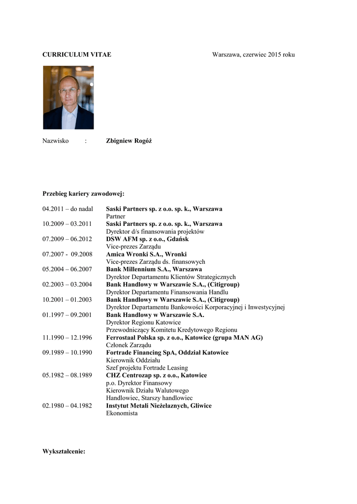 CURRICULUM VITAE Nazwisko : Warszawa, czerwiec 2015 roku Zbigniew Rogóż Przebieg kariery zawodowej: 04.2011 – do nadal 10.2009 – 03.2011 07.2009 – 06.2012 07.2007 - 09.2008 05.2004 – 06.2007 02.2003 – 03.2004 10.2001 – 01.2003 01.1997 – 09.2001 11.1990 – 12.1996 09.1989 – 10.1990 05.1982 – 08.1989 02.1980 – 04.1982 Wykształcenie: Saski Partners sp. z o.o. sp. k., Warszawa Partner Saski Partners sp. z o.o. sp. k., Warszawa Dyrektor d/s finansowania projektów DSW AFM sp. z o.o., Gdańsk Vice-prezes Zarządu Amica Wronki S.A., Wronki Vice-prezes Zarządu ds. finansowych Bank Millennium S.A., Warszawa Dyrektor Departamentu Klientów Strategicznych Bank Handlowy w Warszawie S.A., (Citigroup) Dyrektor Departamentu Finansowania Handlu Bank Handlowy w Warszawie S.A., (Citigroup) Dyrektor Departamentu Bankowości Korporacyjnej i Inwestycyjnej Bank Handlowy w Warszawie S.A. Dyrektor Regionu Katowice Przewodniczący Komitetu Kredytowego Regionu Ferrostaal Polska sp. z o.o., Katowice (grupa MAN AG) Członek Zarządu Fortrade Financing SpA, Oddział Katowice Kierownik Oddziału Szef projektu Fortrade Leasing CHZ Centrozap sp. z o.o., Katowice p.o. Dyrektor Finansowy Kierownik Działu Walutowego Handlowiec, Starszy handlowiec Instytut Metali Nieżelaznych, Gliwice Ekonomista 1975 – 1980 Akademia Ekonomiczna w Katowicach Wydział Przemysłu, Ekonometria i Statystyka Znajomość języków: polski rosyjski (biegle w mowie i w piśmie) angielski (biegle w mowie i w piśmie) francuski (średnio zaawansowany) Udział w Radach Nadzorczych: 2014 – nadal FERRO SA – Członek Rady Nadzorczej 2014 – nadal Lentex SA – Wiceprzewodniczący Rady Nadzorczej 2012 – 2015 Seco/Warwick SA – Członek RN, przewodniczący Komitetu Audytu RN 2008 – 2012 FOR-NET SA, Kraków – Przewodniczący Rady Nadzorczej 2007 – 2008 Gram A/S, Dania (Grupa Amica SA) – Przewodniczący Rady Nadzorczej 1997 – 2003 Zakłady Koksownicze „Przyjaźń” PP – Członek Rady Nadzorczej 1997 – 1998 Ferrostaal Polska sp. z o.o. – Członek Rady Nadzorczej 1991 – 1992 ACT Automation Construction Trade sp. z o.o. – Członek Rady Nadzorczej Posiadam dyplom nr 88/2004 Ministra Skarbu Państwa dla kandydatów na członków Rad Nadzorczych w spółkach Skarbu Państwa. Zbigniew Rogóż