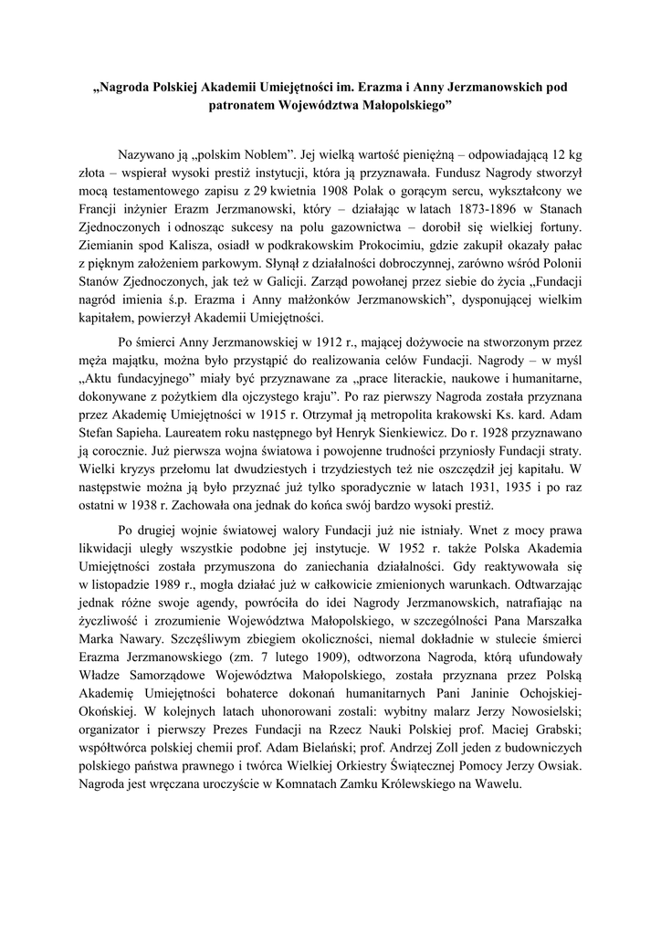 „Nagroda Polskiej Akademii Umiejętności im. Erazma i Anny Jerzmanowskich pod patronatem Województwa Małopolskiego” Nazywano ją „polskim Noblem”. Jej wielką wartość pieniężną – odpowiadającą 12 kg złota – wspierał wysoki prestiż instytucji, która ją przyznawała. Fundusz Nagrody stworzył mocą testamentowego zapisu z 29 kwietnia 1908 Polak o gorącym sercu, wykształcony we Francji inżynier Erazm Jerzmanowski, który – działając w latach 1873-1896 w Stanach Zjednoczonych i odnosząc sukcesy na polu gazownictwa – dorobił się wielkiej fortuny. Ziemianin spod Kalisza, osiadł w podkrakowskim Prokocimiu, gdzie zakupił okazały pałac z pięknym założeniem parkowym. Słynął z działalności dobroczynnej, zarówno wśród Polonii Stanów Zjednoczonych, jak też w Galicji. Zarząd powołanej przez siebie do życia „Fundacji nagród imienia ś.p. Erazma i Anny małżonków Jerzmanowskich”, dysponującej wielkim kapitałem, powierzył Akademii Umiejętności. Po śmierci Anny Jerzmanowskiej w 1912 r., mającej dożywocie na stworzonym przez męża majątku, można było przystąpić do realizowania celów Fundacji. Nagrody – w myśl „Aktu fundacyjnego” miały być przyznawane za „prace literackie, naukowe i humanitarne, dokonywane z pożytkiem dla ojczystego kraju”. Po raz pierwszy Nagroda została przyznana przez Akademię Umiejętności w 1915 r. Otrzymał ją metropolita krakowski Ks. kard. Adam Stefan Sapieha. Laureatem roku następnego był Henryk Sienkiewicz. Do r. 1928 przyznawano ją corocznie. Już pierwsza wojna światowa i powojenne trudności przyniosły Fundacji straty. Wielki kryzys przełomu lat dwudziestych i trzydziestych też nie oszczędził jej kapitału. W następstwie można ją było przyznać już tylko sporadycznie w latach 1931, 1935 i po raz ostatni w 1938 r. Zachowała ona jednak do końca swój bardzo wysoki prestiż. Po drugiej wojnie światowej walory Fundacji już nie istniały. Wnet z mocy prawa likwidacji uległy wszystkie podobne jej instytucje. W 1952 r. także Polska Akademia Umiejętności została przymuszona do zaniechania działalności. Gdy reaktywowała się w listopadzie 1989 r., mogła działać już w całkowicie zmienionych warunkach. Odtwarzając jednak różne swoje agendy, powróciła do idei Nagrody Jerzmanowskich, natrafiając na życzliwość i zrozumienie Województwa Małopolskiego, w szczególności Pana Marszałka Marka Nawary. Szczęśliwym zbiegiem okoliczności, niemal dokładnie w stulecie śmierci Erazma Jerzmanowskiego (zm. 7 lutego 1909), odtworzona Nagroda, którą ufundowały Władze Samorządowe Województwa Małopolskiego, została przyznana przez Polską Akademię Umiejętności bohaterce dokonań humanitarnych Pani Janinie OchojskiejOkońskiej. W kolejnych latach uhonorowani zostali: wybitny malarz Jerzy Nowosielski; organizator i pierwszy Prezes Fundacji na Rzecz Nauki Polskiej prof. Maciej Grabski; współtwórca polskiej chemii prof. Adam Bielański; prof. Andrzej Zoll jeden z budowniczych polskiego państwa prawnego i twórca Wielkiej Orkiestry Świątecznej Pomocy Jerzy Owsiak. Nagroda jest wręczana uroczyście w Komnatach Zamku Królewskiego na Wawelu.
