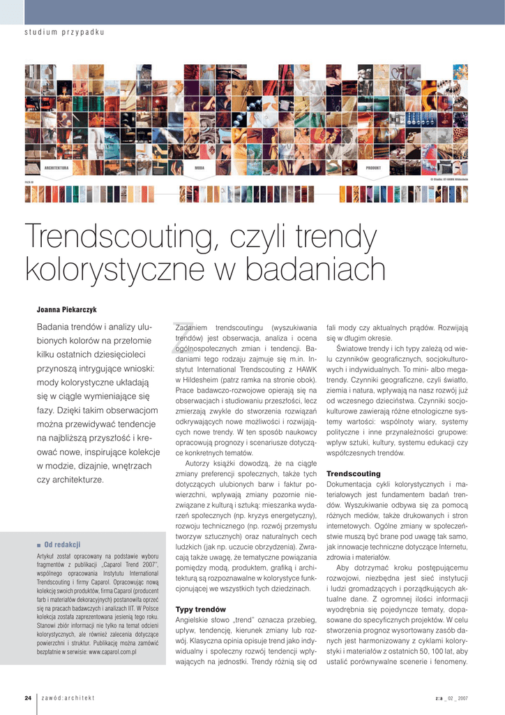 studium przypadku Trendscouting, czyli trendy kolorystyczne w badaniach Joanna Piekarczyk Badania trendów i analizy ulubionych kolorów na przełomie kilku ostatnich dziesięcioleci przynoszą intrygujące wnioski: mody kolorystyczne układają się w ciągle wymieniające się fazy. Dzięki takim obserwacjom można przewidywać tendencje na najbliższą przyszłość i kreować nowe, inspirujące kolekcje w modzie, dizajnie, wnętrzach czy architekturze. Od redakcji Artykuł został opracowany na podstawie wyboru fragmentów z publikacji „Caparol Trend 2007”, wspólnego opracowania Instytutu International Trendscouting i firmy Caparol. Opracowując nową kolekcję swoich produktów, firma Caparol (producent farb i materiałów dekoracyjnych) postanowiła oprzeć się na pracach badawczych i analizach IIT. W Polsce kolekcja została zaprezentowana jesienią tego roku. Stanowi zbiór informacji nie tylko na temat odcieni kolorystycznych, ale również zalecenia dotyczące powierzchni i struktur. Publikację można zamówić bezpłatnie w serwisie: www.caparol.com.pl 24 zawód:architekt Z Zadaniem trendscoutingu (wyszukiwania trendów) jest obserwacja, analiza i ocena ogólnospołecznych zmian i tendencji. Badaniami tego rodzaju zajmuje się m.in. Instytut International Trendscouting z HAWK w Hildesheim (patrz ramka na stronie obok). Prace badawczo-rozwojowe opierają się na obserwacjach i studiowaniu przeszłości, lecz zmierzają zwykle do stworzenia rozwiązań odkrywających nowe możliwości i rozwijających nowe trendy. W ten sposób naukowcy opracowują prognozy i scenariusze dotyczące konkretnych tematów. Autorzy książki dowodzą, że na ciągłe zmiany preferencji społecznych, także tych dotyczących ulubionych barw i faktur powierzchni, wpływają zmiany pozornie niezwiązane z kulturą i sztuką: mieszanka wydarzeń społecznych (np. kryzys energetyczny), rozwoju technicznego (np. rozwój przemysłu tworzyw sztucznych) oraz naturalnych cech ludzkich (jak np. uczucie obrzydzenia). Zwracają także uwagę, że tematyczne powiązania pomiędzy modą, produktem, grafiką i architekturą są rozpoznawalne w kolorystyce funkcjonującej we wszystkich tych dziedzinach. Typy trendów Angielskie słowo „trend” oznacza przebieg, upływ, tendencję, kierunek zmiany lub rozwój. Klasyczna opinia opisuje trend jako indywidualny i społeczny rozwój tendencji wpływających na jednostki. Trendy różnią się od fali mody czy aktualnych prądów. Rozwijają się w długim okresie. Światowe trendy i ich typy zależą od wielu czynników geograficznych, socjokulturowych i indywidualnych. To mini- albo megatrendy. Czynniki geograficzne, czyli światło, ziemia i natura, wpływają na nasz rozwój już od wczesnego dzieciństwa. Czynniki socjokulturowe zawierają różne etnologiczne systemy wartości: wspólnoty wiary, systemy polityczne i inne przynależności grupowe: wpływ sztuki, kultury, systemu edukacji czy współczesnych trendów. Trendscouting Dokumentacja cykli kolorystycznych i materiałowych jest fundamentem badań trendów. Wyszukiwanie odbywa się za pomocą różnych mediów, także drukowanych i stron internetowych. Ogólne zmiany w społeczeństwie muszą być brane pod uwagę tak samo, jak innowacje techniczne dotyczące Internetu, zdrowia i materiałów. Aby dotrzymać kroku postępującemu rozwojowi, niezbędna jest sieć instytucji i ludzi gromadzących i porządkujących aktualne dane. Z ogromnej ilości informacji wyodrębnia się pojedyncze tematy, dopasowane do specyfi cznych projektów. W celu stworzenia prognoz wysortowany zasób danych jest harmonizowany z cyklami kolorystyki i materiałów z ostatnich 50, 100 lat, aby ustalić porównywalne scenerie i fenomeny. z : a _ 02 _ 2007 studium przypadku Do tych informacji należy włączyć przykładowe wpływy produktowe i kulturowe w każdym z regionów geografi cznych. Cykle kolorystyczne i materiałowe Typologia kolorów i materiałów pochodzi od trendów i składa się w obrębie danej fazy z kolorystyki, różnych struktur powierzchniowych i form. Każdy cykl obejmuje różne fazy w aranżacji wnętrz, gdyż wiele kierunków designerskich – słabszych lub silniejszych – występuje równolegle. Czas danej fazy, cyklu zależy od tematu. Cykle kolorystyczne i materiałowe dokumentują rozwój poprzednich trendów po to, aby można było do nich powracać w przyszłości. W ostatnich 50 latach funkcja, forma, kolor i materiały w aranżacji wnętrz napędzane przez rozwój, potrzeby społeczne i techniczne rozwijały się wyjątkowo szybko. Poszukiwanie kolorów i materiałów w latach 1955-2005 Na potrzeby badania „Cykle kolorystyczne i materiałowe od 1955 do 2005”, przeprowadzonego przez Instytut International Trendscouting, udokumentowano i oceniono 5000 zdjęć dotyczących aranżowania wnętrz. Badanie opisuje różne fazy w obrębie cykli, które wynikają z trendów, względnie ze zbiorowych preferencji kolorystycznych i materiałowych. Uwzględniono nie tylko przejścia z faz kolorowych do monochromatycznych: ciemnych i jasnych, ale także pojawianie się w ostatnich 50 latach typowych, powracających co jakiś czas kombinacji kolorów. Zauważone tendencje są porównywane i dokumentowane. Już w 1997 roku wkradły się do świata wnętrz pojedyncze, intensywne, kolorowe powierzchnie będące niejako kreatywnym protestem przeciwko ascetycznej i jednobarwnej aranżacji wnętrz lat 1995-2000. Kolorystyka na początku ograniczała się do kombinacji pomarańczowego i srebrnego. Techniki aplikacji po raz pierwszy dały możliwość pomalowania wnętrz (bez użycia lakierów w formie sprejów) w kolorze RAL 9006 – odcieniu srebrnometalicznym. Prawie równolegle pojawiły się kombinacje pomarańczowego z niebieskim lub zielonym. Za tym poszła także technika oświetleniowa rozwijająca się w kierunku lepszego dostosowania do aranżacji wnętrz. W sezonie jesienno-zimowym 2001 kombinacja 
