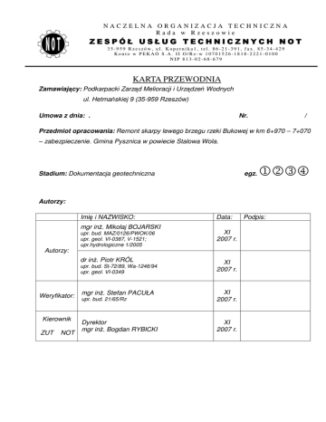 NACZELNA ORGANIZACJA TECHNICZNA Rada w Rzeszowie ZESPÓŁ USŁUG TECHNICZNYCH NOT 35-959 Rzeszów, ul. Kopernika1, tel. 86-21-391, fax. 85-34-429 Konto w PEKAO S.A. II O/Rz-w 10701526-1818-2221-0100 NIP 813-02-68-679 KARTA PRZEWODNIA Zamawiający: Podkarpacki Zarząd Melioracji i Urządzeń Wodnych ul. Hetmańskiej 9 (35-959 Rzeszów) Umowa z dnia: . Nr. / Przedmiot opracowania: Remont skarpy lewego brzegu rzeki Bukowej w km 6+970 – 7+070 – zabezpieczenie. Gmina Pysznica w powiecie Stalowa Wola. Stadium: Dokumentacja geotechniczna egz. 1234 Autorzy: Imię i NAZWISKO: mgr inż. Mikołaj BOJARSKI Autorzy: upr. bud. MAZ/0126/PWOK/06 upr. geol. VI-0387, V-1521; upr.hydrologiczne 1/2005 XI 2007 r. dr inż. Piotr KRÓL XI 2007 r. upr. bud. St-72/89, Wa-1246/94 upr. geol. VI-0349 Weryfikator: Kierownik ZUT NOT Data: upr. bud. 21/65/Rz XI 2007 r. Dyrektor mgr inż. Bogdan RYBICKI XI 2007 r. mgr inż. Stefan PACUŁA Podpis: ZESPÓŁ USŁUG TECHNICZNYCH NOT – Grupa SITWiM w Rzeszowie Spis treści 1 WSTĘP................................................................................................................................................ 2 1.1 Podstawa i przedmiot opracowania............................................................................................. 2 1.2 Wykaz wykorzystanych materiałów ........................................................................................... 2 1.2.1 Akty prawne 2 1.2.2 Normy i podręczniki 3 1.3 Ustalenie kategorii geotechnicznej inwestycji ............................................................................ 3 2 LOKALIZACJA OBIEKTU ............................................................................................................... 3 3 METODYKA PRAC........................................................................................................................... 4 3.1 Materiały archiwalne................................................................................................................... 4 3.2 Prace terenowe ............................................................................................................................ 4 3.3 Badania laboratoryjne ................................................................................................................. 4 4 WARUNKI GEOLOGICZNE ............................................................................................................ 4 4.1 Morfologia terenu........................................................................................................................ 4 4.2 Budowa geologiczna ................................................................................................................... 5 4.3 Warunki hydrogeologiczne ......................................................................................................... 5 4.4 Złoża surowców .......................................................................................................................... 6 5 CHARAKTERYSTYKA GEOTECHNICZNA ................................................................................. 6 6 WNIOSKI............................................................................................................................................ 7 Spis rysunków 1 – Wycinek Mapy Topograficznej Polski; Skala 1:25 000; Arkusza 155.23 Stalowa Wola, skala 1:25 000, 1:100 000 2 – Wycinek ze Szczegółowej Mapy Geologicznej Polski; Skala 1:50 000; Arkusza 890 Nisko; B. Kwapisz 1985 r., skala 1:10 000 3 – Lokalizacja otworów badawczych geologicznych i przekrojów geodezyjnych, skala 1:1 000 4 – Przekrój geologiczny i profile otworów badawczych, skala 1:100 Spis załączników 1 – Krzywa uziarnienia pisków średnich Remont skarpy lewego brzegu rzeki Bukowej w km 6+970 – 7+070 – zabezpieczenie Dokumentacja geotechniczna. Opracowanie dr inż. Piotr Król, mgr inż. Mikołaj Bojarski, weryfikacja mgr inż. Stefan Pacuła -1- ZESPÓŁ USŁUG TECHNICZNYCH NOT – Grupa SITWiM w Rzeszowie 1 WSTĘP 1.1 Podstawa i przedmiot opracowania Niniejsze opracowanie zostało wykonane przez Naczelną Organizację Techniczną Stowarzyszenie Naukowo-Techniczne z siedzibą przy ul. Kopernika 1 w Rzeszowie, na zlecenie Podkarpackiego Zarządu Melioracji i Urządzeń Wodnych Oddziału Tarnobrzeg z siedzibą ul. Sienkiewicza 86 (39-400 Tarnobrzeg). Przedmiotem opracowania jest remont skarpy lewego brzegu rzeki Bukowej w km 6+970 – 7+070 – zabezpieczenie osuwiska. Obiekt znajduje się w gminie Pysznica w powiecie Stalowa Wola. Opracowanie stanowi kompletną dokumentację projektową. Składa się on z następujących części: - Dokumentacja geotechniczna - Opracowanie hydrologiczne - Projekt architektoniczno-budowlany - Przedmiar robót - Kosztorys inwestorski - Szczegółowa specyfikacja techniczna wykonania i odbioru robót - Informacja o planie BIOZ Niniejsza część stanowi dokumentację geotechniczną wykonaną na potrzeby projektu remontu skarpy. 1.2 Wykaz wykorzystanych materiałów 1.2.1 • Akty prawne Ustawa z dnia 4 lutego1994 r. - Prawo geologiczne i górnicze (jedn. tekst: Dz.U. 2005 r. Nr 228, poz. 1947 z późn. zm.) • Ustawa z dnia 18 lipca 2001 r. - Prawo wodne (jedn. tekst: Dz.U. 2005 r. Nr 239, poz. 2019 z późn. zm.); • Ustawa z dnia 7 lipca 1994 r. - Prawo budowlane (jedn. tekst: Dz.U. 2006 r. Nr 156, poz. 1118); • Rozporządzenie Ministra Środowiska z dnia 20 kwietnia 2007 r. w sprawie warunków, jakim powinny odpowiadać budowle hydrotechniczne i ich usytuowanie (Dz.U. 2007 Nr 86, poz. 579); Remont skarpy lewego brzegu rzeki Bukowej w km 6+970 – 7+070 – zabezpieczenie Dokumentacja geotechniczna. Opracowanie dr inż. Piotr Król, mgr inż. Mikołaj Bojarski, weryfikacja mgr inż. Stefan Pacuła -2- ZESPÓŁ USŁUG TECHNICZNYCH NOT – Grupa SITWiM w Rzeszowie Rozporządzenie MSWiA z dnia 24 września 1998 r. w sprawie ustalania • geotechnicznych warunków posadowienia obiektów budowla