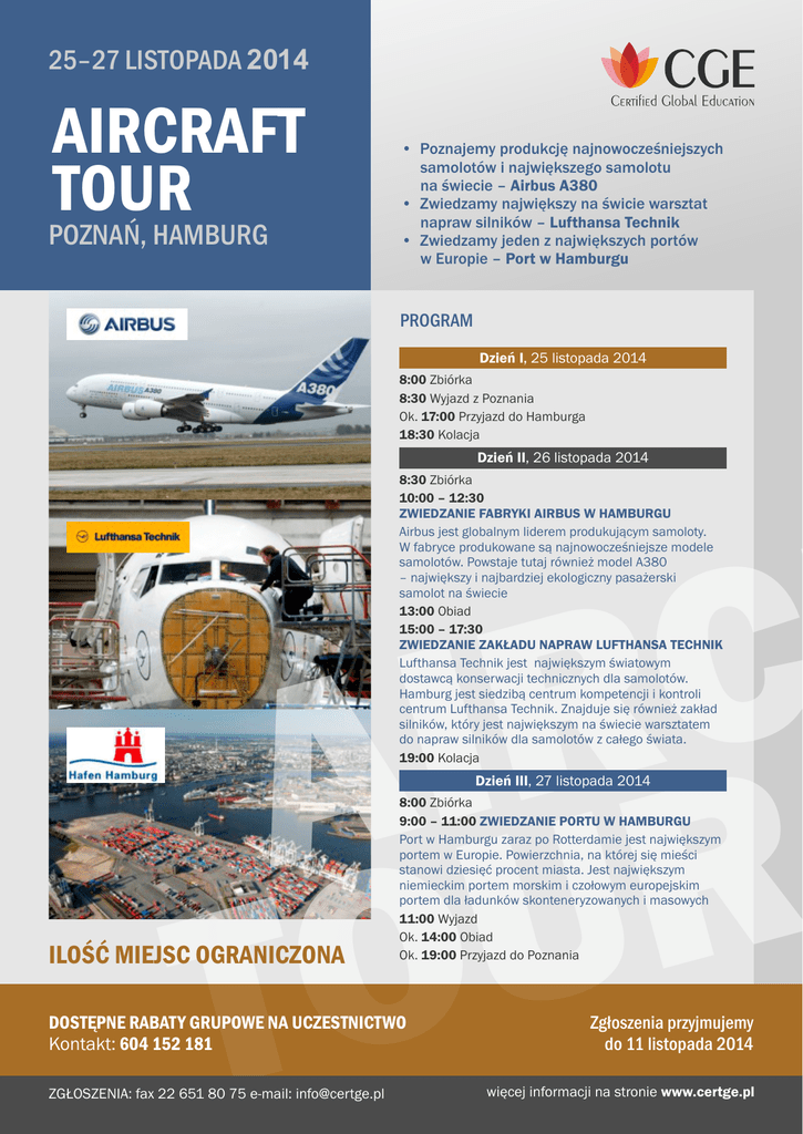 25–27 LISTOPADA 2014 AIRCRAFT TOUR POZNAŃ, HAMBURG • Poznajemy produkcję najnowocześniejszych samolotów i największego samolotu na świecie – Airbus A380 • Zwiedzamy największy na świcie warsztat napraw silników – Lufthansa Technik • Zwiedzamy jeden z największych portów w Europie – Port w Hamburgu PROGRAM Dzień I, 25 listopada 2014 8:00 Zbiórka 8:30 Wyjazd z Poznania Ok. 17:00 Przyjazd do Hamburga 18:30 Kolacja Dzień II, 26 listopada 2014 8:30 Zbiórka 10:00 – 12:30 ZWIEDZANIE FABRYKI AIRBUS W HAMBURGU Airbus jest globalnym liderem produkującym samoloty. W fabryce produkowane są najnowocześniejsze modele samolotów. Powstaje tutaj również model A380 – największy i najbardziej ekologiczny pasażerski samolot na świecie 13:00 Obiad 15:00 – 17:30 ZWIEDZANIE ZAKŁADU NAPRAW LUFTHANSA TECHNIK Lufthansa Technik jest największym światowym dostawcą konserwacji technicznych dla samolotów. Hamburg jest siedzibą centrum kompetencji i kontroli centrum Lufthansa Technik. Znajduje się również zakład silników, który jest największym na świecie warsztatem do napraw silników dla samolotów z całego świata. 19:00 Kolacja C R I A R U O T Dzień III, 27 listopada 2014 ILOŚĆ MIEJSC OGRANICZONA 8:00 Zbiórka 9:00 – 11:00 ZWIEDZANIE PORTU W HAMBURGU Port w Hamburgu zaraz po Rotterdamie jest największym portem w Europie. Powierzchnia, na której się mieści stanowi dziesięć procent miasta. Jest największym niemieckim portem morskim i czołowym europejskim portem dla ładunków skonteneryzowanych i masowych 11:00 Wyjazd Ok. 14:00 Obiad Ok. 19:00 Przyjazd do Poznania DOSTĘPNE RABATY GRUPOWE NA UCZESTNICTWO Kontakt: 604 152 181 ZGŁOSZENIA: fax 22 651 80 75 e-mail: [email protected] Zgłoszenia przyjmujemy do 11 listopada 2014 więcej informacji na stronie www.certge.pl AIRCRAFT TOUR PROGRAM 25–27 LISTOPADA 2014 POZNAŃ, HAMBURG Dzień I, 25 listopada 2014, Poznań 8:00 Zbiórka WYDARZENIE PRZEZNACZONE JEST DO KADRY ZARZĄDZAJĄCEJ PRODUKCJĄ, W SZCZEGÓLNOŚCI: • • • • • Dyrektorów zakładów produkcyjnych Dyrektorów produkcji Kierowników produkcji Dyrektorów operacyjnych Menedżerów, Specjalistów ds. optymalizacji produkcji i służb utrzymania ruchu • Menedżerów, Specjalistów ds. Lean 8:30 Wyjazd spod hotelu w Poznaniu Ok. 17:00 Przyjazd do Hamburga 18:30 Wspólna kolacja Dzień II, 26 listopada 2014, Hamburg 8:30 Zbiórka 10:00 – 12:30 ZWIEDZANIE FABRYKI AIRBUSA, (język angielski) DLACZEGO WARTO WZIĄĆ UDZIAŁ: zwiedzamy dwa nowoczesne zakłady z branży lotniczej w Niemczech oraz zwiedzamy największy port w Europie. Zwiedzamy fabrykę Airbusa w Hamburgu, w której produkowane są najnowocześniejsze modele samolotów tej marki wśród nich powstaje A380 – najnowocześniejszy i największy pasażerski samolot na świecie. Zwiedzamy zakład napraw Lufthansa Technik który jest największym światowym dostawcą konserwacji technicznych dla samolotów. Hamburg jest siedzibą centrum kompetencji i kontroli centrum Lufthansa Technik. Znajduje się również zakład silników, który jest największym na świecie warsztatem do napraw silników dla samolotów z całego świata. Fabryka Airbusa w Hamburgu - Airbus jest globalnym liderem produkującym samoloty. Fabryka jest drugim co do wielkości oddziałem Airbusa w Europie w, której zatrudnionych jest ponad 13000 pracowników. Powstają tu najnowocześniejsze modele z serii A320 – A318, A319, A321. Firma rocznie inwestuje około 250 mln w ulepszanie modeli i zachowanie pozycji lidera. Znajdują one zastosowanie we wszystkich liniach lotniczych. W Hamburgu powstaje również model A380 – największy i najbardziej ekologiczny samolot na świecie. Prowadzone są tu finalne prace nad A380. Fabryka odpowiada za montaż struktury i wyposazenia, kompletne wyposazenie kabin pasażerów, wyposazenie pomieszczeń towarowych i lakierowanie. Jako lider w branży Airbus stara się być ekologicznym przedsiębiorstwem. Firma jako pierwsza z lotniczych na świecie otrzymała normę środowiska ISO 14001. C R I A R U O T Zwiedzamy port w Hamburgu - jest on największym niemieckim portem morskim i czołowym europejskim portem dla ładunków skonteneryzowanych i masowych. Port w Hamburgu położony jest 120 km od linii morza. Mimo to może on przyjmować jedne z największych kontenerowców świata. Wolumen ładunków morskich obsłużonych w największym niemieckim porcie morskim przekracza 120 milionów ton rocznie. Wymiana doświadczeń z praktykami umożliwi Państwu poprawę i unowocześnienie produkcji. 13:00 Obiad W CENĘ 2495 pln WLICZONE JEST: • Zwiedzanie 2 zakładów i portu • Całodzienne wyżywienie • 2 kolacje • Transport: Poznań – Hamburg – Poznań Dodatkowa dopłata do 2 noclegów w Hamburgu wynosi 700 pln ZGŁOSZENIA: fax 22 651 80 75 e-mail: [email protected] więcej informacji na stronie www.certge.pl AIRCRAFT TOUR 15:00 – 17:30 ZWIEDZANIE LUFTHANSA TECHNIK (język angielski) PROGRAM 25–27 LISTOPADA 2014 Dzień III, 27 listopada 2014, Hamburg 8:00 Zbiórka 9:00 – 11:00 ZWIEDZANIE PORTU W HAMBURGU, (język polski) Lufthansa Technik - jest największym światowym dostawcą konserwacji technicznych dla samolotów. Hamburg jest siedzibą centrum kompetencji i kontroli centrum Lufthansa Technik. Około 7500 pracowników jest zatrudnionych na obszarze ponad 750 tyś metrów. Znajduje się tu również zakład silników, który jest największym na świecie warsztatem do napraw silników dla samolotów z całego świata. Oferowane są usługi w zakresie napraw i remontów silników różnych producentów, modułów, poszczególnych elementów oraz urządzeń pomocniczych. Kompleksowe wykorzystanie zasad leanu skraca czas ich realizacji. Lufthansa Technik może przeprowadzać naprawy w imieniu producentów dla wszystkich głównych typów silników. W sumie zatrudnionych jest ponad 500 inżynierów, którzy remontują m.in. samoloty Airbusa i Lufthansy. 