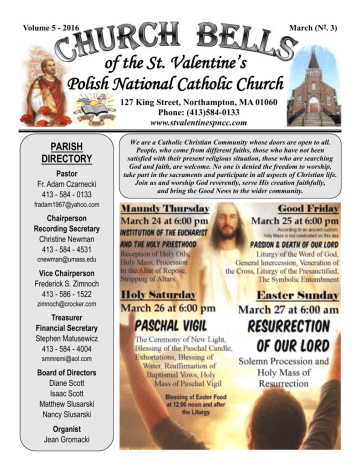 March (No. 3) Volume 5 - 2016 of the St. Valentine’s Polish National Catholic Church 127 King Street, Northampton, MA 01060 Phone: (413)584-0133 www.stvalentinespncc.com PARISH DIRECTORY Pastor Fr. Adam Czarnecki 413 - 584 - 0133 [email protected] Chairperson Recording Secretary Christine Newman 413 - 584 - 4531 [email protected] Vice Chairperson Frederick S. Zimnoch 413 - 586 - 1522 [email protected] Treasurer Financial Secretary Stephen Matusewicz 413 - 584 - 4004 [email protected] Board of Directors Diane Scott Isaac Scott Matthew Slusarski Nancy Slusarski Organist Jean Gromacki We are a Catholic Christian Community whose doors are open to all. People, who come from different faiths, those who have not been satisfied with their present religious situation, those who are searching God and faith, are welcome. No one is denied the freedom to worship, take part in the sacraments and participate in all aspects of Christian life. Join us and worship God reverently, serve His creation faithfully, and bring the Good News to the wider community. The Paschal Mystery The Lenten season is the prelude of the Paschal Mystery of our salvation. The Paschal Mystery is the suffering, death and resurrection of Jesus. And this is the mystery of our Christian faith that we always proclaim. Our Lord Jesus, the Christ who has died and is risen, and will come again. Jesus, the son of Joseph and Mary, from the House of David, from Abraham’s ancestry. He is the Son of God who was incarnated thru the power of the Holy Spirit. Jesus is the promised messiah, the chosen One who lived among us and had immersed with us in our day-to-day lives. The historical Jesus is the master of the disciples who walked on this earth like us, and journeyed with His people in a particular given time of our history. He is the one whom we are remembering and commemorating in His paschal mysteries. Even before Jesus’ coming and living with us, God has been always with us. All along, He is our Emmanuel, the God who is always with us. Christians remember and celebrate the life and works of Jesus, the Nazarene thru the accounts of the evangelists and his disciples. Jesus the son of a carpenter from Nazareth who obeyed the will of His Father, preached and taught about the coming of the Kingdom, when the reign of God is realized. The Son of God and Son of Man is named JESUS (Hebrew, Jeshua), CHRIST (from Greek, Christos – the anointed). The chosen One by the Father, his only begotten Son to come down and tell the story of the great love of the Father to humankind and to all of creation. The Christ who was confirmed in his Transfiguration on Mt. Thabor, began his public ministry in the following years. Jesus in his public ministry had worked wonders as he preached about the coming of the Kingdom, taught many lessons on how to live a good life with God, he cured and healed those who are sick, cast the demons out from the possessed, brought life to the dead, had forgiven sins, and had performed a number of miracles that are signs of God’s goodness and compassion. In summary, the major sins committed by people are mostly of infidelity and injustice. As one sinned, the absence of God in one’s life would cause him/her effects. People then become unfaithful to follow God’s laws and commands, they become unfaithful in observing their commitments with one another. Lest do they know, that they have made themselves masters of their own and had created false concepts of themselves as “little gods.” These people think and feel that as if they will never die and can just do what they want in their lives and other peoples’ lives. And because people just do what they want, injustice and unjust practices and habits have become natural, and later will cause and inflict injustice to others. To forgive is difficult because of one’s pride and the pain that one had experienced from painful events in life. To forgive is hardly considered by people especially when the gravity of the offense committed is too much. But to forgive is to identify and accept one’s limitation and the other people’s situations, and with contrite hearts take pity on him/ her. Forgive then, it’s a favor you do to yourself and to others. “So will my heavenly Father do to you unless each of you forgive your brother from your heart. (Matt. 18: 21-35) There is an urgent need to return to God, to go back to the covenant with God. Hence, reconciliation is needed. Reconciliation is to restore the relationship after it was broken and cut. The call to reconcile and reconnect with God is an invitation to reckon with. When one is reconciled, one is received back and accepted as someone who is coming back. To reconcile is to forgive and be forgiven for our God is full of gentleness and compassion and love. The Pascal Mystery is the apex of Lent. The forty days of repentance and renewal will soon come an end. The suffering of Jesus had led Him to Golgotha in Mt. Calvary to die as what was told to those who believed and followed Him. On the third day, He rose from the dead. Jesus’ resurrection is the victory of all victories. Jesus conquered death. God who lives forever indeed is the God of Life who gave life himself to us. Jesus gave us the real meaning of life, that to live is to rise with Christ and live life to fullest in Easter blessings. Ask yourself: The followers of the Christ are called Am I ready share in the Christians (followers of Christ). They were passion of Jesus? the apostles from Jewish roots, there were Am I reconciled with Jews, Romans, Greeks converts, gentiles, God today? Have I pagans who became believers and His forgiven myself and disciples. Family friends and strangers likewise followed “the Way.” They became forgiven others as well? followers of “the Way, the Truth and the Life.” This a How do I make the paschal mystery of My Lord be powerful metaphor of God, as Jesus is the truth and the only mine? way that gives life, and we are also 