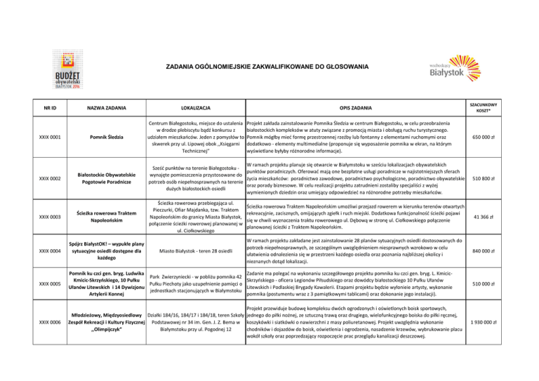 ZADANIA OGÓLNOMIEJSKIE ZAKWALIFIKOWANE DO GŁOSOWANIA NR ID XXIX 0001 XXIX 0002 XXIX 0003 XXIX 0004 XXIX 0005 XXIX 0006 u z OPIS ZADANIA u n Centrum Białegostoku, miejsce do ustalenia Projekt zakłada zainstalowanie Pomnika Śledzia w centrum Białegostoku, w celu przeobrażenia i w drodze plebiscytu bądź konkursu z białostockich kompleksów w atuty związane z promocją miasta i obsługą ruchu turystycznego. e Pomnik Śledzia udziałem mieszkańców. Jeden z pomysłów to Pomnik mógłby mieć formę przestrzennej rzeźby lub fontanny z elementami ruchomymi oraz d skwerek przy ul. Lipowej obok ,,Księgarni dodatkowo - elementy multimedialne (proponuje się wyposażenie pomnika w ekran, na którym o Technicznej” wyświetlane byłyby różnorodne informacje). t n iW ramach projektu planuje się otwarcie w Białymstoku w sześciu lokalizacjach obywatelskich Sześć punktów na terenie Białegostoku epunktów poradniczych. Oferować mają one bezpłatne usługi poradnicze w najistotniejszych sferach Białostockie Obywatelskie wynajęte pomieszczenia przystosowane do dżycia mieszkańców: poradnictwo zawodowe, poradnictwo psychologiczne, poradnictwo obywatelskie Pogotowie Poradnicze potrzeb osób niepełnosprawnych na terenie ooraz porady biznesowe. W celu realizacji projektu zatrudnieni zostaliby specjaliści z wyżej dużych białostockich osiedli twymienionych dziedzin oraz umiejący odpowiedzieć na różnorodne potrzeby mieszkańców. ny Ścieżka rowerowa przebiegająca ul. iŚcieżka rowerowa Traktem Napoleońskim umożliwi przejazd rowerem w kierunku terenów otwartych Pieczurki, Ofiar Majdanka, tzw. Traktem Ścieżka rowerowa Traktem erekreacyjnie, zacisznych, omijających zgiełk i ruch miejski. Dodatkowa funkcjonalność ścieżki pojawi Napoleońskim do granicy Miasta Białystok, Napoleońskim dsię w chwili wyznaczenia traktu rowerowego ul. Dębową w stronę ul. Ciołkowskiego połączenie połączenie ścieżki rowerowej planowanej w oplanowanej ścieżki z Traktem Napoleońskim. ul. Ciołkowskiego t n W ramach projektu zakładane jest zainstalowanie 28 planów sytuacyjnych osiedli dostosowanych do Spójrz BiałystOK! – wypukłe plany i potrzeb niepełnosprawnych, ze szczególnym uwzględnieniem niesprawnych wzrokowo w celu sytuacyjne osiedli dostępne dla Miasto Białystok - teren 28 osiedli e ułatwienia odnalezienia się w przestrzeni każdego osiedla oraz poznania najbliższej okolicy i każdego d nieznanych dotąd lokalizacji. o NAZWA ZADANIA LOKALIZACJA Pomnik ku czci gen. bryg. Ludwika Park Zwierzyniecki - w pobliżu pomnika 42 Kmicic-Skrzyńskiego, 10 Pułku Pułku Piechoty jako uzupełnienie pamięci o Ułanów Litewskich i 14 Dywizjonu jednostkach stacjonujących w Białymstoku Artylerii Konnej Zadanie ma polegać na wykonaniu szczegółowego projektu pomnika ku czci gen. bryg. L. KmicicSkrzyńskiego - oficera Legionów Piłsudskiego oraz dowódcy białostockiego 10 Pułku Ułanów Litewskich i Podlaskiej Brygady Kawalerii. Etapami projektu będzie wyłonieie artysty, wykonanie pomnika (postumentu wraz z 3 pamiątkowymi tablicami) oraz dokonanie jego instalacji). n iProjekt przewiduje budowę kompleksu dwóch ogrodzonych i oświetlonych boisk sportowych, Młodzieżowy, Międzyosiedlowy Działki 184/16, 184/17 i 184/18, teren Szkoły ejednego do piłki nożnej, ze sztuczną trawą oraz drugiego, wielofunkcyjnego boiska do piłki ręcznej, Zespół Rekreacji i Kultury Fizycznej Podstawowej nr 34 im. Gen. J. Z. Bema w dkoszykówki i siatkówki o nawierzchni z masy poliuretanowej. Projekt uwzględnia wykonanie ,,Olimpijczyk” Białymstoku przy ul. Pogodnej 12 ochodników i dojazdów do boisk, oświetlenia i ogrodzenia, nasadzenie krzewów, wybrukowanie placu twokół szkoły oraz poprzedzający rozpoczęcie prac przeglądu kanalizacji deszczowej. y SZACUNKOWY KOSZT* 650 000 zł 510 800 zł 41 366 zł 840 000 zł 510 000 zł 1 930 000 zł XXIX 0007 XXIX 0008 Białostocki Ośrodek Wschodnich Sztuk Walki Rowerzysto! Bezpieczniej z kamizelką XXIX 0009 Centrum Animacji Kultury ,,Wierzbowa” XXIX 0010 Wykonanie i ustawienie ,,Krzyża Katyńskiego” w bliskości istniejącego Pomnika Katyńskiego na skraju Parku Zwierzynieckiego XXIX 0011 XXIX 0012 XXIX 0013 XXIX 0014 Magazyn nr 10 lub magazyn nr 12 (piętro i piwnica), ul. Węglowa Miasto Białystok Projekt zakłada zmianę sposobu użytkowania części jednego z magazynów wojskowych przez stworzenie 4-5 sal treningowych oraz zaplecza sanitarno-technicznego - szatnia, prysznice, sanitariaty, pomieszczenia administracji, magazyny. n iProjekt zadania polega na zakupie i bezpłatnej dystrybucji 10 000 kamizelek odblaskowych z logo eBiałegostoku. Kamizelki przeznaczone będą dla przedkszkolaków, uczniów szkół podstawowych, dgimnazjalnych, ponadgimnazjalnych i innych, a także rowerzystów, uczestników ruchu drogowego. o W ramach projektu zrealizowana ma zostać dobudowa sali widowiskowo-teatralnej do VII LO, która ma być miejscem koncertów młodzieżowych, warsztatów i spektakli teatralnych, konkursów i VII Liceum Ogólnokształcące w Białymstoku festiwali. Dodatkowo powstać ma uliczna galeria zdjęć i prac plastycznych, która ma uatrakcyjnić przy ulicy Wierzbowej 7 przestrzeń miejską wzdłuż odcinka ulicy Wierzbowej. Ponadto wyremontowana ma zostać istniejąca sala lustrzana, która wymaga wymiany podłogi, montażu wentylacji oraz wyposażenia w pianino. W sąsiedztwie istniejącego Pomnika Katyńskiego - na terenie zielonym między posadzonymi 3 dębami pamięci Projekt polega na wykonaniu i ustawieniu krzyża, wkomponowanie go w otoczenie, by powstał kompleks pamięci Katynia. Krzyż miałby zostać wykonany z granitu z wkomponowanym krzyżem wykonanym z mosiądzu. n Projekt polega na wykonaniu około 400 metrów bieżących jezdni z polbruku wraz z chodnikami po ul. Nowosielska na odcinku od ul. Zbigniewa i Remont ulic na osiedlu Starosielce obu stronach ulicy w ciągu ul. Nowosielskiej 