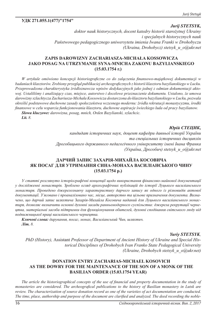 Jurij Stetsyk УДК 271.055.1(477)"1754" Jurij STETSYK, doktor nauk historycznych, docent katedry historii starożytnej Ukrainy i specjalnych historycznych nauk Państwowego pedagogicznego uniwersytetu imienia Iwana Franki w Drohobyczu (Ukraina, Drohobycz) [email protected] ZAPIS DAROWIZNY ZACHARIASZA-MICHAŁA KOSSOWICZA JAKO POSAG NA UTRZYMANIE SYNA-MNICHA ZAKONU BAZYLIANSKIEGO (15.03.1754 r.) W artykule omówiono koncepcji historiograficzne co do zalączenia finansowo-majątkowej dokumentacji w badaniach klasztorów. Zrobiony przegląd publikaciej archeograficznych z historii klasztoru bazylianskiego w Lucku. Przeprowadzona charakterystyka żródloznawcza wpisów dedykacyjnych jako jednej z odmian dokumentacji aktowoj. Ustaliliśmy i analizujący czas, miejsce, autorstwo i docelowe przeznaczenie dokumentu. Ustalono, że umowa darowizny szlachtycza Zachariusza-Michała Kossowicza dostarczona do klasztoru bazylianskiego w Lucku, pozwala określić podstawowe duchowne zasady społeczeństwa wczesnego modernu: źródła rekrutacji monastycyzmu, środki finansowe w celu wsparcia funkcjonowania klasztoru, duchowne aspiracje świeckiego luda od pracy bazylianow. Słowa kluczowe: darowizna, posag, mnich, Orden Bazylianski, szlachcic. Lit. 8. Юрій СТЕЦИК, кандидат історичних наук, доцент кафедри давньої історії України та спеціальних історичних дисциплін Дрогобицького державного педагогічного університету імені Івана Франкa (Україна, Дрогобич) [email protected] ДАРЧИЙ ЗАПИС ЗАХАРІЯ-МИХАЙЛА КОСОВИЧА ЯК ПОСАГ ДЛЯ УТРИМАННЯ СИНА-МОНАХА ВАСИЛІАНСЬКОГО ЧИНУ (15.03.1754 р.) У статті розглянуто історіографічні концепції щодо використання фінансово-майнової документації у дослідженні монастирів. Зроблено огляд археографічних публікацій до історії Луцького василіанського монастиря. Проведено джерелознавчу характеристику дарчого запису як одного із різновидів актової документації. З’ясовано і проаналізовано час, місце, авторство та цільове призначення документа. Визначено, що дарчий запис шляхтича Захарія-Михайла Косовича наданий для Луцького василіанського монастиря, дозволяє визначити основні духовні засади ранньомодерного суспільства: джерела рекрутації чернецтва, матеріальні засоби підтримки для функціонування обителей, духовні сподівання світського люду від подвижницької праці василіанського чернецтва. Ключові слова: дарування, посаг, монах, Василіанський Чин, шляхтич. Літ. 8. Yuriy STETSYK, PhD (History), Assistant Professor of Department of Ancient History of Ukraine and Special Historical Disciplines of Drohobych Ivan Franko State Pedagogical University (Ukraine, Drohobych [email protected]) DONATION ENTRY ZACHARIAS-MICHAEL KOSOVICH AS THE DOWRY FOR THE MAINTENANCE OF THE SON OF A MONK OF THE BASILIAN ORDER (15.03.1754 YEAR) The article the historiographical concepts of the use of financial and property documentation in the study of monasteries are considered. The archeografical publications to the history of Basilian monastery in Lutsk are review. The characterization of source donation record as one of the varieties of act documentation are conducted. The time, place, authorship and purpose of the document are clarified and analyzed. The deed recording the noble16 Східноєвропейський історичний вісник. Вип. 2, 2017 Zapis darowizny Zachariasza-Michała Kossowicza jako posag na utrzymanie syna-mnicha... man Zacharias-Michael Kosovich provided for Lutsk Basilian monastery, allows to determine the basic spiritual principles randomizing society are determined: the sources of recruitment of monasticism, material resources to support the operation of the monastery, spiritual aspirations of the secular folk from the dedicated work of the Basilian monasticism. Key words: donation, dowry, monk, Basilian Order, nobilitate. Ref. 8. Inscenizacja problemy. Pytanie o sposobach rekrutacji i podstawy wejścia do Ordenu Bazylianow dziśiaj pozostają praktycznie nie badany. Przecież do naszych czasów zachowała się głównie finansowomajetkowa dokumentacja klasztorów, która nie ujawnia pytaniach motywacji i procedury duchowej formacji kandydatów, którzy byli chętnimi mnichami. Według jednego ze źródeł, ujawniając niektóre aspekty tego problemu jest darowizna wpisów krewnych kandydatów, angażują się w życie zakonne. Analiza badań. Przy badaniych historii Ordenu Bazylianow naukowcy korzystają z darowizn wpisów do klasztorów tylko jednostronnie, koncetrująn swoją uwagę na rozmiarach i zyskach gruntow. W tym czasie, jak w finansowo-majątkowej częścią dokumentu są ukryte motywy i cele jego znalezienia. Uwzględnienie szerszego kontekstu tworzenia źródła pozwala zauważyć nie tylko okoliczności, ale przyczyny i cel jego wydania. Większość badań zarówno kościelnej, jak i świeckiej historiografii powiązane z rozwojem instytucjonalnym klasztorów [2; 5; 8]. W tym czasie jak nie znaczną uwagę przywiązuje się do postaci mnicha, w szczególności jego przejścia od świeckiego do zakonnego ż
