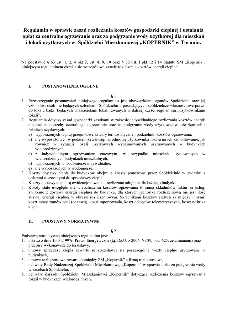 Regulamin w sprawie zasad rozliczania kosztów gospodarki cieplnej i ustalania opłat za centralne ogrzewanie oraz za podgrzanie wody użytkowej dla mieszkań i lokali użytkowych w Spółdzielni Mieszkaniowej „KOPERNIK” w Toruniu. Na podstawie § 63 ust. 1, 2, 4 pkt 2, ust. 8, 9, 10 oraz § 80 ust. l pkt 12 i 14 Statutu SM „Kopernik”, niniejszym regulaminem określa się szczegółowe zasady rozliczania kosztów energii cieplnej. I. POSTANOWIENIA OGÓLNE §1 1. Przestrzeganie postanowień niniejszego regulaminu jest obowiązkiem organów Spółdzielni oraz jej członków, osób nie będących członkami Spółdzielni a posiadających spółdzielcze własnościowe prawo do lokalu bądź będących właścicielami lokali, zwanych w dalszej części regulaminu „użytkownikami lokali”. 2. Regulamin dotyczy zasad gospodarki zasobami w zakresie indywidualnego rozliczania kosztów energii cieplnej na potrzeby centralnego ogrzewania oraz na podgrzanie wody użytkowej w mieszkaniach i lokalach użytkowych: a) wyposażonych w przygrzejnikowe zawory termostatyczne i podzielniki kosztów ogrzewania, b) nie wyposażonych w podzielniki z uwagi na odmowę użytkownika lokalu na ich zamontowanie, jak również w sytuacji lokali użytkowych wynajmowanych usytuowanych w budynkach wielorodzinnych, c) z indywidualnym ogrzewaniem etażowym, w przypadku mieszkań usytuowanych w wielorodzinnych budynkach mieszkalnych, d) wyposażonych w wodomierze indywidualne, e) nie wyposażonych w wodomierze. 3. Koszty dostawy ciepła do budynków obejmują koszty ponoszone przez Spółdzielnię w związku z opłatami uiszczanymi do sprzedawcy ciepła. 4. Koszty dostawy ciepła są ewidencjonowane i rozliczane odrębnie dla każdego budynku. 5. Koszty stałe uwzględniane w rozliczeniu kosztów ogrzewania to suma składników faktur za usługi związane z dostawą energii cieplnej do budynku, dla których jednostką rozliczeniową nie jest ilość zużytej energii cieplnej w okresie rozliczeniowym. Składnikami kosztów stałych są między innymi: koszt mocy zamówionej (co+cwu), koszt raportowania, koszt odczytów telemetrycznych, koszt nośnika ciepła. II. PODSTAWY NORMATYWNE §2 Podstawą normatywną niniejszego regulaminu jest: 1. ustawa z dnia 10.04.1997r. Prawo Energetyczne (t.j. Dz.U. z 2006, Nr 89, poz. 625, ze zmianami) oraz przepisy wykonawcze do tej ustawy, 2. umowy sprzedaży ciepła zawarte ze sprzedawcą na poszczególne węzły cieplne usytuowane w budynkach, 3. umowa rozliczeniowa zawarta pomiędzy SM „Kopernik” a firmą rozliczeniową, 4. uchwały Rady Nadzorczej Spółdzielni Mieszkaniowej „Kopernik” w sprawie opłat za podgrzanie wody w zasobach Spółdzielni, 5. uchwały Zarządu Spółdzielni Mieszkaniowej „Kopernik” dotyczące rozliczenia kosztów ogrzewania lokali w budynkach wielorodzinnych. 2 III. POSTANOWIENIA SZCZEGÓŁOWE Koszty dostawy ciepła do budynków obejmują wydatki ponoszone przez Spółdzielnię w związku z opłatami regulowanymi do sprzedawcy ciepła wg comiesięcznych faktur VAT. Koszty ciepła są ewidencjonowane i rozliczane na budynki, z uwzględnieniem wskazań urządzeń pomiarowych dla poszczególnych obiektów oraz kosztów stałych. Spółdzielnia dokonuje podziału kosztów ciepła na koszty ogrzewania i podgrzania wody dla każdego z budynków. Koszty energii cieplnej uwzględniają wszystkie elementy zgodnie z taryfą ciepła aktualnie obowiązującą. A. ROZLICZANIE KOSZTÓW OGRZEWANIA I USTALANIE OPŁAT §3 1. Rozliczanie kosztów ogrzewania dokonywane jest raz w roku po zakończeniu okresu rozliczeniowego, odrębnie dla każdego budynku, z uwzględnieniem zamówionej mocy cieplnej oraz kosztów zużytego ciepła na potrzeby ogrzewania. 2. Pierwszego rozliczenia dokonuje się po tzw. okresie bazowym, tj. po 12-stu miesiącach licząc od pierwszego dnia miesiąca następującego po miesiącu, w którym nastąpił montaż podzielników. 3. Okres rozliczeniowy wynosi 12 miesięcy. 4. Koszty ciepła zużytego przez budynek w okresie rozliczeniowym stanowią sumę: kosztów stałych opisanych w § 1 ust. 5, nierozliczonych kosztów ogrzewania z poprzedniego sezonu rozliczeniowego, kosztów zużytej energii cieplnej w okresie rozliczeniowym. Koszty ogrzewania budynku w okresie rozliczeniowym, które podlegają rozliczeniu pomiędzy poszczególnymi lokalami, stanowią sumę: kosztów stałych opisanych w § 1 ust. 5 pomniejszonych o szacowany, przypadający na lokale użytkowe bez podzielników, udział w kosztach mocy zamówionej według ust.5 niniejszego paragrafu, nierozliczonych kosztów ogrzewania z poprzedniego sezonu rozliczeniowego pomniejszonych o szacowany, przypadający na lokale użytkowe bez podzielników, udział w kosztach nierozliczonych według ust. 5 niniejszego paragrafu, kosztów zużytej energii cieplnej w okresie rozliczeniowym pomniejszonych o sumę wszystkich wpływów z naliczeń opłat za podgrzanie ciepłej wody oraz o szacowany, przypadający na lokale użytkowe bez podzielników, udział w kosztach zużytej energii cieplnej według ust.5 niniejszego paragrafu. 5. Koszty ogrzewania lokali użytkowych, których nie wyposażono w podzielniki kosztów, położonych w budynku mieszkalnym wylicza się jako sumę: a) przypadającej na lokale użytkowe części kosztów stałych opisanych w § 1 ust. 5, liczonej na podstawie obliczeniowej mocy cieplnej (według opracowania projektowego) oraz powierzchni lokalu, b) kosztu zużytej energii cieplnej przez lokal liczonej proporcją powierzchni lokalu względem powierzchni całkowitej. Wyliczone tak koszty ogrzewania lokali użytkowych nie wyposażonych w podzielniki, pomniejszają poszczególne składniki całkowitych kosztów ogrzewania, które podlegają rozliczeniu pomiędzy pozostałe lokale w budynku. §4 1. Odczyty stanowiące podstawę rozliczenia dokonuje się ze wskazań podzielników kosztów ogrzewania zainstalowanych na grzejnikach w lokalu /mieszkalnym bądź użytkowym/