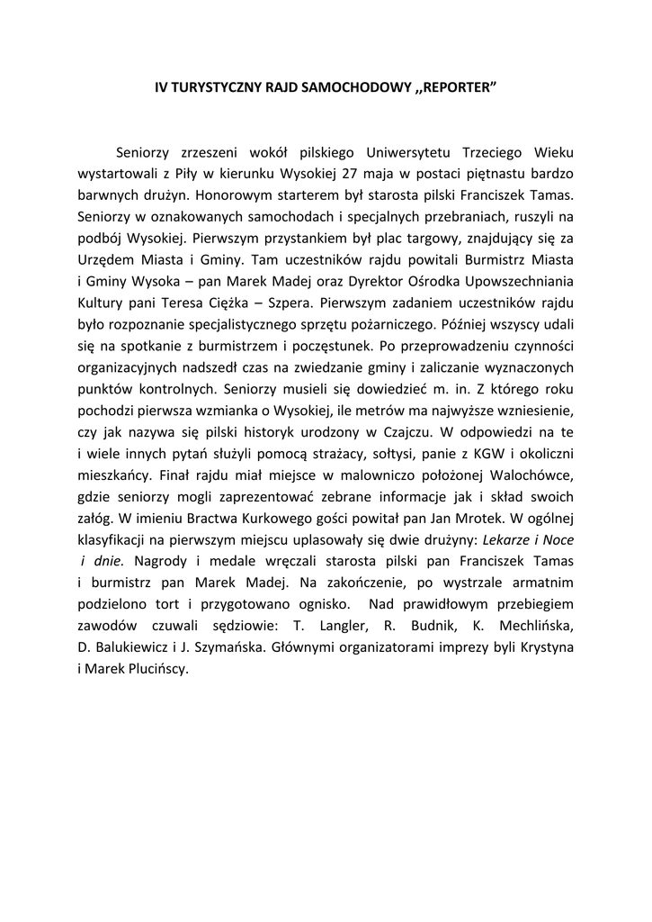 IV TURYSTYCZNY RAJD SAMOCHODOWY ,,REPORTER” Seniorzy zrzeszeni wokół pilskiego Uniwersytetu Trzeciego Wieku wystartowali z Piły w kierunku Wysokiej 27 maja w postaci piętnastu bardzo barwnych drużyn. Honorowym starterem był starosta pilski Franciszek Tamas. Seniorzy w oznakowanych samochodach i specjalnych przebraniach, ruszyli na podbój Wysokiej. Pierwszym przystankiem był plac targowy, znajdujący się za Urzędem Miasta i Gminy. Tam uczestników rajdu powitali Burmistrz Miasta i Gminy Wysoka – pan Marek Madej oraz Dyrektor Ośrodka Upowszechniania Kultury pani Teresa Ciężka – Szpera. Pierwszym zadaniem uczestników rajdu było rozpoznanie specjalistycznego sprzętu pożarniczego. Później wszyscy udali się na spotkanie z burmistrzem i poczęstunek. Po przeprowadzeniu czynności organizacyjnych nadszedł czas na zwiedzanie gminy i zaliczanie wyznaczonych punktów kontrolnych. Seniorzy musieli się dowiedzieć m. in. Z którego roku pochodzi pierwsza wzmianka o Wysokiej, ile metrów ma najwyższe wzniesienie, czy jak nazywa się pilski historyk urodzony w Czajczu. W odpowiedzi na te i wiele innych pytań służyli pomocą strażacy, sołtysi, panie z KGW i okoliczni mieszkańcy. Finał rajdu miał miejsce w malowniczo położonej Walochówce, gdzie seniorzy mogli zaprezentować zebrane informacje jak i skład swoich załóg. W imieniu Bractwa Kurkowego gości powitał pan Jan Mrotek. W ogólnej klasyfikacji na pierwszym miejscu uplasowały się dwie drużyny: Lekarze i Noce i dnie. Nagrody i medale wręczali starosta pilski pan Franciszek Tamas i burmistrz pan Marek Madej. Na zakończenie, po wystrzale armatnim podzielono tort i przygotowano ognisko. Nad prawidłowym przebiegiem zawodów czuwali sędziowie: T. Langler, R. Budnik, K. Mechlińska, D. Balukiewicz i J. Szymańska. Głównymi organizatorami imprezy byli Krystyna i Marek Plucińscy.