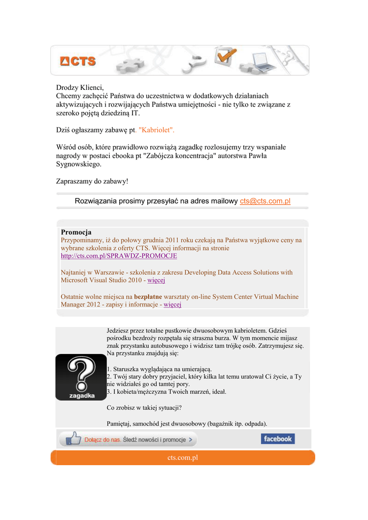 Drodzy Klienci, Chcemy zachęcić Państwa do uczestnictwa w dodatkowych działaniach aktywizujących i rozwijających Państwa umiejętności - nie tylko te związane z szeroko pojętą dziedziną IT. Dziś ogłaszamy zabawę pt. "Kabriolet". Wśród osób, które prawidłowo rozwiążą zagadkę rozlosujemy trzy wspaniałe nagrody w postaci ebooka pt "Zabójcza koncentracja" autorstwa Pawła Sygnowskiego. Zapraszamy do zabawy! Rozwiązania prosimy przesyłać na adres mailowy [email protected] Promocja Przypominamy, iż do połowy grudnia 2011 roku czekają na Państwa wyjątkowe ceny na wybrane szkolenia z oferty CTS. Więcej informacji na stronie http://cts.com.pl/SPRAWDZ-PROMOCJE Najtaniej w Warszawie - szkolenia z zakresu Developing Data Access Solutions with Microsoft Visual Studio 2010 - więcej Ostatnie wolne miejsca na bezpłatne warsztaty on-line System Center Virtual Machine Manager 2012 - zapisy i informacje - więcej Jedziesz przez totalne pustkowie dwuosobowym kabrioletem. Gdzieś pośrodku bezdroży rozpętała się straszna burza. W tym momencie mijasz znak przystanku autobusowego i widzisz tam trójkę osób. Zatrzymujesz się. Na przystanku znajdują się: 1. Staruszka wyglądająca na umierającą. 2. Twój stary dobry przyjaciel, który kilka lat temu uratował Ci życie, a Ty nie widziałeś go od tamtej pory. 3. I kobieta/mężczyzna Twoich marzeń, ideał. Co zrobisz w takiej sytuacji? Pamiętaj, samochód jest dwuosobowy (bagażnik itp. odpada). cts.com.pl