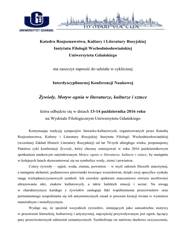 Katedra Rosjoznawstwa, Kultury i Literatury Rosyjskiej Instytutu Filologii Wschodniosłowiańskiej Uniwersytetu Gdańskiego ma zaszczyt zaprosić do udziału w cyklicznej Interdyscyplinarnej Konferencji Naukowej Żywioły. Motyw ognia w literaturze, kulturze i sztuce która odbędzie się w dniach 13-14 października 2016 roku na Wydziale Filologicznym Uniwersytetu Gdańskiego Kontynuując tradycję sympozjów literacko-kulturowych, organizowanych przez Katedrę Rosjoznawstwa, Kultury i Literatury Rosyjskiej Instytutu Filologii Wschodniosłowiańskiej (wcześniej Zakład Historii Literatury Rosyjskiej) od lat 70-tych ubiegłego wieku, proponujemy Państwu cykl konferencji Żywioły, który chcemy zainicjować w roku 2016 październikowym spotkaniem naukowym zatytułowanym Motyw ognia w literaturze, kulturze i sztuce, by następnie w kolejnych latach skoncentrować się na symbolice wody, ziemi i powietrza. Cztery żywioły – ogień, woda, ziemia, powietrze – w myśl założeń filozofii starożytnej, a następnie alchemii, podstawowe pierwiastki tworzące wszechświat, dzięki swej specyfice zyskały rangę wielopłaszczyznowych symboli. Ich szerokie spektrum znaczeniowe otwiera możliwości obrazowania idei, znaków kulturowych, a także ludzkich emocji i uczuć. Na uwagę w charakterystyce każdego z żywiołów zasługuje fakt współistnienia przeciwieństw oraz permanentnego uzupełniania się ich antynomicznych zasad w procesie kreacji świata w wymiarze materialnym i metafizycznym. Wydaje się, że spośród wszystkich żywiołów, istniejących jako samodzielne motywy w przestrzeni literackiej, kulturowej i artystycznej, najczęściej przywoływanym jest ogień, łączący pary przeciwstawnych odniesień semantycznych. Symbolizuje on zarówno duchowe oczyszczenie, wewnętrzną siłę człowieka, zjednoczenie z Absolutem, jak i dezintegrację, moc niszczycielską, męki piekielne. Jest on emblematem niebiańskiego światła oraz płomieni w przestrzeni chtonicznej. Pozytywne konotacje symbolu ognia odżywają w obrazie ogniska domowego czy świecy ołtarnej, których antynomię stanowią pożar czy stos ofiarny. Symbolika ognia pojawia się w literackich i artystycznych opisach miłości i nienawiści, uczuć w równym stopniu wykluczających się, co wzajemnie dopełniających. Ogień istnieje w różnych aspektach ludzkiej egzystencji, nie wyłączając sfery komunikacji językowej. „Bać się jak ognia”, „igrać z ogniem”, „skoczyć za kimś w ogień”, „upiec dwie pieczenie przy jednym ogniu” to kilka z licznych przykładów związków frazeologicznych, odwołujących się do semantyki ognia. Motyw ognia będzie więc, jak się zdaje, doskonałym tematem do interdyscyplinarnej dyskusji na temat jego realizacji w dziełach literackich, wytworach kultury, sztuki, komunikacji językowej i międzykulturowej. Mamy nadzieję, że temat konferencji zachęci Państwa do uczestnictwa w naszym sympozjum oraz, wyjątkowo nie burzliwych, lecz „ognistych” dyskusji. Język konferencji: język polski. Forma wystąpienia: referat (czas wystąpienia 20 minut, wystąpienie plenarne – 25 minut). Zgłoszenia zawierające wypełnioną kartę zgłoszeniową należy przesyłać do 31 maja 2016 roku na adres: [email protected] Informacja o zakwalifikowaniu referatu zostanie podana do 30 czerwca 2016 roku. Teksty referatów, które otrzymają pozytywną recenzję, zostaną opublikowane w tomie konferencyjnym. Opłata konferencyjna wynosi 400 PLN (numer konta zostanie podany po zakwalifikowaniu referatu). W ramach opłaty konferencyjnej organizatorzy zapewniają opublikowanie referatów konferencyjnych (monografia wieloautorska). Organizatorzy konferencji: dr Katarzyna Arciszewska dr Urszula Patocka-Sigłowy