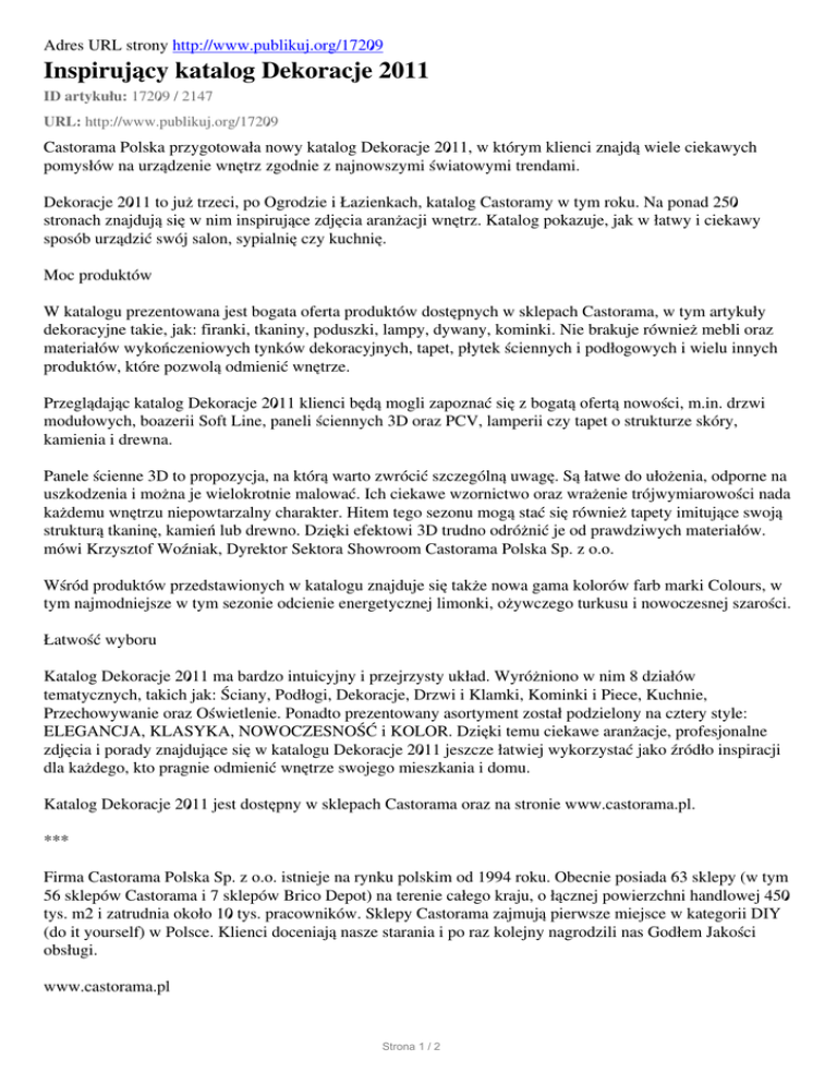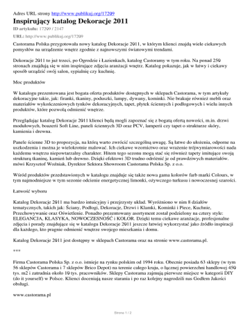 Adres URL strony http://www.publikuj.org/17209 Inspirujący katalog Dekoracje 2011 ID artykułu: 17209 / 2147 URL: http://www.publikuj.org/17209 Castorama Polska przygotowała nowy katalog Dekoracje 2011, w którym klienci znajdą wiele ciekawych pomysłów na urządzenie wnętrz zgodnie z najnowszymi światowymi trendami. Dekoracje 2011 to już trzeci, po Ogrodzie i Łazienkach, katalog Castoramy w tym roku. Na ponad 250 stronach znajdują się w nim inspirujące zdjęcia aranżacji wnętrz. Katalog pokazuje, jak w łatwy i ciekawy sposób urządzić swój salon, sypialnię czy kuchnię. Moc produktów W katalogu prezentowana jest bogata oferta produktów dostępnych w sklepach Castorama, w tym artykuły dekoracyjne takie, jak: firanki, tkaniny, poduszki, lampy, dywany, kominki. Nie brakuje również mebli oraz materiałów wykończeniowych tynków dekoracyjnych, tapet, płytek ściennych i podłogowych i wielu innych produktów, które pozwolą odmienić wnętrze. Przeglądając katalog Dekoracje 2011 klienci będą mogli zapoznać się z bogatą ofertą nowości, m.in. drzwi modułowych, boazerii Soft Line, paneli ściennych 3D oraz PCV, lamperii czy tapet o strukturze skóry, kamienia i drewna. Panele ścienne 3D to propozycja, na którą warto zwrócić szczególną uwagę. Są łatwe do ułożenia, odporne na uszkodzenia i można je wielokrotnie malować. Ich ciekawe wzornictwo oraz wrażenie trójwymiarowości nada każdemu wnętrzu niepowtarzalny charakter. Hitem tego sezonu mogą stać się również tapety imitujące swoją strukturą tkaninę, kamień lub drewno. Dzięki efektowi 3D trudno odróżnić je od prawdziwych materiałów. mówi Krzysztof Woźniak, Dyrektor Sektora Showroom Castorama Polska Sp. z o.o. Wśród produktów przedstawionych w katalogu znajduje się także nowa gama kolorów farb marki Colours, w tym najmodniejsze w tym sezonie odcienie energetycznej limonki, ożywczego turkusu i nowoczesnej szarości. Łatwość wyboru Katalog Dekoracje 2011 ma bardzo intuicyjny i przejrzysty układ. Wyróżniono w nim 8 działów tematycznych, takich jak: Ściany, Podłogi, Dekoracje, Drzwi i Klamki, Kominki i Piece, Kuchnie, Przechowywanie oraz Oświetlenie. Ponadto prezentowany asortyment został podzielony na cztery style: ELEGANCJA, KLASYKA, NOWOCZESNOŚĆ i KOLOR. Dzięki temu ciekawe aranżacje, profesjonalne zdjęcia i porady znajdujące się w katalogu Dekoracje 2011 jeszcze łatwiej wykorzystać jako źródło inspiracji dla każdego, kto pragnie odmienić wnętrze swojego mieszkania i domu. Katalog Dekoracje 2011 jest dostępny w sklepach Castorama oraz na stronie www.castorama.pl. *** Firma Castorama Polska Sp. z o.o. istnieje na rynku polskim od 1994 roku. Obecnie posiada 63 sklepy (w tym 56 sklepów Castorama i 7 sklepów Brico Depot) na terenie całego kraju, o łącznej powierzchni handlowej 450 tys. m2 i zatrudnia około 10 tys. pracowników. Sklepy Castorama zajmują pierwsze miejsce w kategorii DIY (do it yourself) w Polsce. Klienci doceniają nasze starania i po raz kolejny nagrodzili nas Godłem Jakości obsługi. www.castorama.pl Strona 1 / 2 Więcej informacji udziela: Paweł Tabaka Made in PR e-mail: [email protected] Tel. ( 48) 603 185 005 Tel/fax.( 48 22) 646 00 10. Made in PR ul. Naruszewicza 10 lok. 1 02-627 Warszawa Tel/fax.( 48 22) 646 00 10 Aktywacja: 13/09/11 11:29, edycja: 13/09/11 11:40, odsłony: 785 Strona 2 / 2