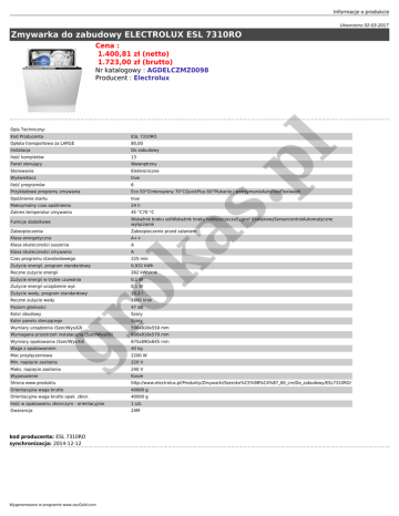 Informacje o produkcie Utworzono 02-03-2017 Zmywarka do zabudowy ELECTROLUX ESL 7310RO Cena : 1.400,81 zł (netto) 1.723,00 zł (brutto) Nr katalogowy : AGDELCZMZ0098 Producent : Electrolux Opis Techniczny: ESL 7310RO Opłata transportowa za LARGE 80,00 Instalacja Do zabudowy Ilość kompletów 13 Panel sterujący Wewnętrzny Sterowanie Elektroniczne Wyświetlacz true Ilość programów 6 Przykładowe programy zmywania Eco 50°CIntensywny 70°CQuickPlus 60°Płukanie i wstrzymanieAutoFlexFlexiwash Opóźnienie startu true Maksymalny czas opóźnienia 24 h Zakres temperatur zmywania 45 °C70 °C Funkcje dodatkowe Wskaźnik braku soliWskaźnik braku nabłyszczaczaSygnał dźwiękowySensorcontrolAutomatyczne wyłączanie Zabezpieczenia Zabezpieczenie przed zalaniem Klasa energetyczna A++ Klasa skuteczności suszenia A Klasa skuteczności zmywania A Czas programu standardowego 225 min as ok Zużycie energii, program standardowy 0,932 kWh Roczne zużycie energii 262 kWh/rok Zużycie energii w trybie czuwania Zużycie energii urządzenie wył. 0,1 W 0,1 W Zużycie wody, program standardowy 10,2 l Roczne zużycie wody 2860 l/rok Poziom głośności 47 dB Szary gr Kolor obudowy .p l Kod Producenta Kolor panelu sterującego Szary Wymiary urządzenia (Szer/Wys/Gł) 596x818x550 mm Wymagana przestrzeń instalacyjna (Szer/Wys/Gł) 600x818x570 mm Wymiary opakowania (Szer/Wys/Gł) 675x890x645 mm Waga z opakowaniem 40 kg Moc przyłączeniowa 2200 W Min. napięcie zasilania 220 V Maks. napięcie zasilania 240 V Wyposażenie Kosze Strona www produktu http://www.electrolux.pl/Produkty/Zmywarki/Szeroko%C5%9B%C4%87_60_cm/Do_zabudowy/ESL7310RO/ Orientacyjna waga brutto 40000 g Orientacyjna waga brutto opak. zbior. 40000 g Ilość w opakowaniu zbiorczym - orientacyjnie 1 szt. Gwarancja 24M kod producenta: ESL 7310RO synchronizacja: 2014-12-12 Wygenerowano w programie www.oscGold.com