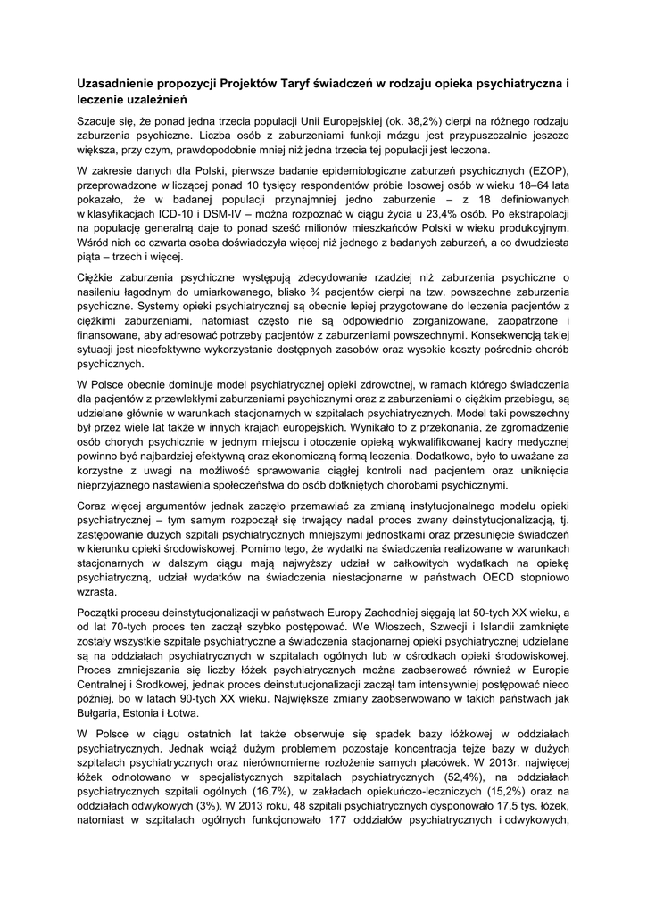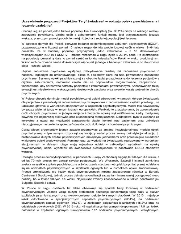 Uzasadnienie propozycji Projektów Taryf świadczeń w rodzaju opieka psychiatryczna i leczenie uzależnień Szacuje się, że ponad jedna trzecia populacji Unii Europejskiej (ok. 38,2%) cierpi na różnego rodzaju zaburzenia psychiczne. Liczba osób z zaburzeniami funkcji mózgu jest przypuszczalnie jeszcze większa, przy czym, prawdopodobnie mniej niż jedna trzecia tej populacji jest leczona. W zakresie danych dla Polski, pierwsze badanie epidemiologiczne zaburzeń psychicznych (EZOP), przeprowadzone w liczącej ponad 10 tysięcy respondentów próbie losowej osób w wieku 18–64 lata pokazało, że w badanej populacji przynajmniej jedno zaburzenie – z 18 definiowanych w klasyfikacjach ICD-10 i DSM-IV – można rozpoznać w ciągu życia u 23,4% osób. Po ekstrapolacji na populację generalną daje to ponad sześć milionów mieszkańców Polski w wieku produkcyjnym. Wśród nich co czwarta osoba doświadczyła więcej niż jednego z badanych zaburzeń, a co dwudziesta piąta – trzech i więcej. Ciężkie zaburzenia psychiczne występują zdecydowanie rzadziej niż zaburzenia psychiczne o nasileniu łagodnym do umiarkowanego, blisko ¾ pacjentów cierpi na tzw. powszechne zaburzenia psychiczne. Systemy opieki psychiatrycznej są obecnie lepiej przygotowane do leczenia pacjentów z ciężkimi zaburzeniami, natomiast często nie są odpowiednio zorganizowane, zaopatrzone i finansowane, aby adresować potrzeby pacjentów z zaburzeniami powszechnymi. Konsekwencją takiej sytuacji jest nieefektywne wykorzystanie dostępnych zasobów oraz wysokie koszty pośrednie chorób psychicznych. W Polsce obecnie dominuje model psychiatrycznej opieki zdrowotnej, w ramach którego świadczenia dla pacjentów z przewlekłymi zaburzeniami psychicznymi oraz z zaburzeniami o ciężkim przebiegu, są udzielane głównie w warunkach stacjonarnych w szpitalach psychiatrycznych. Model taki powszechny był przez wiele lat także w innych krajach europejskich. Wynikało to z przekonania, że zgromadzenie osób chorych psychicznie w jednym miejscu i otoczenie opieką wykwalifikowanej kadry medycznej powinno być najbardziej efektywną oraz ekonomiczną formą leczenia. Dodatkowo, było to uważane za korzystne z uwagi na możliwość sprawowania ciągłej kontroli nad pacjentem oraz uniknięcia nieprzyjaznego nastawienia społeczeństwa do osób dotkniętych chorobami psychicznymi. Coraz więcej argumentów jednak zaczęło przemawiać za zmianą instytucjonalnego modelu opieki psychiatrycznej – tym samym rozpoczął się trwający nadal proces zwany deinstytucjonalizacją, tj. zastępowanie dużych szpitali psychiatrycznych mniejszymi jednostkami oraz przesunięcie świadczeń w kierunku opieki środowiskowej. Pomimo tego, że wydatki na świadczenia realizowane w warunkach stacjonarnych w dalszym ciągu mają najwyższy udział w całkowitych wydatkach na opiekę psychiatryczną, udział wydatków na świadczenia niestacjonarne w państwach OECD stopniowo wzrasta. Początki procesu deinstytucjonalizacji w państwach Europy Zachodniej sięgają lat 50-tych XX wieku, a od lat 70-tych proces ten zaczął szybko postępować. We Włoszech, Szwecji i Islandii zamknięte zostały wszystkie szpitale psychiatryczne a świadczenia stacjonarnej opieki psychiatrycznej udzielane są na oddziałach psychiatrycznych w szpitalach ogólnych lub w ośrodkach opieki środowiskowej. Proces zmniejszania się liczby łóżek psychiatrycznych można zaobserować również w Europie Centralnej i Środkowej, jednak proces deinstutucjonalizacji zaczął tam intensywniej postępować nieco później, bo w latach 90-tych XX wieku. Największe zmiany zaobserwowano w takich państwach jak Bułgaria, Estonia i Łotwa. W Polsce w ciągu ostatnich lat także obserwuje się spadek bazy łóżkowej w oddziałach psychiatrycznych. Jednak wciąż dużym problemem pozostaje koncentracja tejże bazy w dużych szpitalach psychiatrycznych oraz nierównomierne rozłożenie samych placówek. W 2013r. najwięcej łóżek odnotowano w specjalistycznych szpitalach psychiatrycznych (52,4%), na oddziałach psychiatrycznych szpitali ogólnych (16,7%), w zakładach opiekuńczo-leczniczych (15,2%) oraz na oddziałach odwykowych (3%). W 2013 roku, 48 szpitali psychiatrycznych dysponowało 17,5 tys. łóżek, natomiast w szpitalach ogólnych funkcjonowało 177 oddziałów psychiatrycznych i odwykowych, liczących łącznie 6,6 tys. łóżek. Zakłady MONAR i ośrodki rehabilitacyjne dla uzależnionych od substancji psychoaktywnych stanowiły 7,3% ogółu dostępnych łóżek całodobowej opieki psychiatrycznej, co stanowiło ok. 2,5 tys. łóżek. Podobnie jak w latach ubiegłych na terenie kraju działały 4 regionalne ośrodki psychiatrii sądowej dysponujące 245 łóżkami oraz 22 ośrodki leczenia odwykowego alkoholowego, w których zarejestrowano 1,1 tys. łóżek i było to więcej o 3,3% porównaniu z rokiem 2012. Zgodnie z raportem GUS w 2013 r. średni pobyt pacjenta w szpitalu psychiatrycznym wynosił 30,3 dni i był o 2 dni dłuższy niż pobyt pacjenta na oddziale psychiatrycznym szpitali ogólnych (ok. 27,9 dnia). Najdłuższe pobyty, także na tle krajów Unii Europejskiej, związane są ze schizofrenią, zaburzeniami schizotypowymi i urojeniowymi i wynoszą aż 61,37 dni (średnia UE - 38,50 dni). Wskaźnik hospitalizacji lokuje się nieco powyżej średniej – 145 na 100 tys. (średnia UE to 137 na 100 tys.). Pobyt w szpitalu jest tylko jedną z form opieki. Większość osób z zaburzeniami psychicznymi nie jest i nigdy nie musi być leczona w warunkach stacjonarnych. Dlatego tak istotne znaczenie ma rozwój pozaszpitalnych form ochrony zdrowia psychicznego. W opiece pozaszpitalnej wyróżnia się: poradnie zdrowia psychicznego, poradnie zdrowia psychicznego dla dzieci i młodzieży, poradnie odwykowe dla uzależnionych alkoholu oraz od substancji psychoaktywnych, poradnie psychologiczne oraz zespoły leczenia środowiskowego (domowego