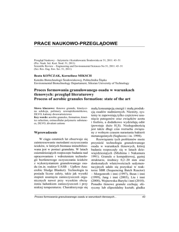 PRACE NAUKOWO-PRZEGLĄDOWE Przegląd Naukowy – Inżynieria i Kształtowanie Środowiska nr 51, 2011: 43–51 (Prz. Nauk. Inż. Kszt. Środ. 51, 2011) Scientific Review – Engineering and Environmental Sciences No 51, 2011: 43–51 (Sci. Rev. Eng. Env. Sci. 51, 2011) Beata KOŃCZAK, Korneliusz MIKSCH Katedra Biotechnologii Środowiskowej, Politechnika Śląska Environmental Biotechnology Departament, Silesian University of Technology Proces formowania granulowanego osadu w warunkach tlenowych: przegląd literaturowy Process of aerobic granules formation: state of the art Słowa kluczowe: tlenowe granule, kinetyczna selekcja, polimery zewnątrzkomórkowe, DLVO, kationy dwuwartościowe Key words: aerobic granules, formation, kinetics selection, extracellular polymeric substances, DLVO, divalent cations Wprowadzenie W ciągu ostatnich lat obserwuje się zainteresowanie metodami oczyszczania ścieków, w których biomasa immobilizowana jest w postaci granulatu. W latach osiemdziesiątych rozpoczęto badania nad opracowaniem i wdrożeniem technologii beztlenowego oczyszczania ścieków z wykorzystaniem granulowanego osadu (m.in. reaktor UASB – Upflow Anaerobic Sludge Blanket). Technologia ta posiada liczne zalety, takie jak wysoki stopień usunięcia zanieczyszczeń organicznych nawet przy wysokim obciążeniu ładunkiem zanieczyszczeń i przy niskiej temperaturze. Charakteryzuje się małą konsumpcją energii i małą produkcją osadów nadmiernych. Niestety, systemy te zapewniają tylko częściowe usunięcie patogenów oraz związków azotu i fosforu, a dodatkowo wydzielają odór (powstaje dużo H2S). Niedogodnością jest także długi czas rozruchu związany z wolnym czasem narastania bakterii metanogennych (Seghezzo i in. 1998). Rozwiązanie tych problemów może przynieść technologia granulowanego osadu w warunkach tlenowych, której badania rozpoczęły się w latach dziewięćdziesiątych (Mishima i Nakamura 1991). Granule o kompaktowej, gęstej strukturze, średnicy 0,2–20 mm oraz doskonałych właściwościach sedymentacyjnych udało się pozyskać w reaktorze SBR (Sequencing Batch Reactor) – Morgenroth i inni (1997), Beun i inni (1999), Jang i inni (2003), Liu i inni (2008), Wojnowska-Baryła i inni (2010). Ponadto tlenowe granule cechują: sferyczny lub elipsoidalny kształt; gładka Proces formowania granulowanego osadu w warunkach tlenowych... 43 (skóropodobna) bądź postrzępiona powierzchnia (w przypadku gdy dominują bakterie nitkowate i grzyby), przeważnie cechująca się właściwościami hydrofobowymi; warstwowa budowa – każda warstwa utworzona jest przez mikroagregaty specyficznych grup mikroorganizmów, natomiast wnętrze przypomina żel, czasami w centrum dużych granul obserwuje się czarną, obumarłą materię organiczną bądź pęcherzyk gazu; obecność kanałów i porów, dzięki czemu możliwy jest transport masy i powietrza do wnętrza granuli; inkluzje kationów. Cechy te sprawiają, iż technologia granulowanego osadu w warunkach tlenowych może znaleźć zastosowanie do oczyszczania ścieków zarówno o małym, jak i dużym obciążeniu ładunkiem zanieczyszczeń, usuwania związków azotu i fosforu, a także toksycznych substancji. Jednakże wprowadzenie technologii na rynek przemysłowy wymaga żmudnych badań, dotyczących samego procesu formowania granulowanego osadu. Uformowanie granul osadu o zwartej, jednorodnej strukturze, które będą zachowywały długo swoją stabilność, niezależnie od obciążenia reaktora ładunkiem zanieczyszczeń biogennych czy obecności substancji toksycznych w dopływających ściekach, stanowi wyzwanie dla badaczy. W niniejszym artykule zgromadzono najważniejsze informacje, dotyczące procesu formowania granulowanego osadu w warunkach tlenowych z ostatnich 19 lat. Zebrana i usystematyzowana wiedza pozwala uwydatnić problemy, które wymagają jeszcze rozwiązania i stanowi podstawę dla przyszłych badań. Praca została sfinansowana z grantu Ministerstwa Nauki i Szkolnictwa Wyższego (nr N N523 453936). 44 Formowanie granul Kompozycja pożywki Formowanie tlenowych granul i ich struktura wydają się zależeć od rodzaju substancji obecnych w dopływających ściekach. Badania z ostatnich lat pokazały, iż tlenowe granule można pozyskać, stosując różnorodne substraty, takie jak: glukoza, skrobia, octan sodu, etanol, metanol, fenol, fruktoza, maltoza, przy czym proces granulacji przebiega najintensywniej w obecności prostych, niezłożonych substratów (Villaseńor i in. 2000, Tay i in. 2002, Adav i Lee 2008, Adav i in. 2008, Konczak i Miksch 2009). W literaturze odnaleźć można także informacje o formowaniu się granul w obecności ścieków bytowo-gospodarczych oraz przemysłowych (Arrojo i in. 2004, Schwarzenbeck i in. 2005). Villaseńor i inni (2000) podają, iż rodzaj substratu wpływa na szybkość wzrostu mikroorganizmów, a jednocześnie na strukturę i gęstość utworzonych biofilmów (rys. 1). Octan sodu sprzyja formowaniu bardzo stabilnych granul, natomiast substraty, takie jak węglowodany, powodują rozwój mikroorganizmów nitkowatych, które z kolei pogarszają stabilność utworzonych granul. Mikroorganizmy nitkowate można było także zaobserwować w granulach utworzonych na pożywce zawierającej fenol, a także w ściekach z przemysłu mleczarskiego (Schwarzenbeck i Wilderer 2005). Liu i Lin (2006) podają, że gdy obciążenie ładunkiem zanieczyszczeń jest zbyt duże, to niezależnie od rodzaju substratu obserwuje się intensywny rozwój bakterii nitkowatych. B. Kończak, K. Miksch RYSUNEK 1. Wpływ substratu na szybkość wzrostu mikroorganizmów i gęstość biofilmu (Villaseńor i in. 2000) FIGURE 1. Influence of substrate on bacterial growth yield and biofilm density Warunki „uczta-głód” Mikroorganizmy granulowanego osadu do wzrostu w postaci agregatów potrzebują cyklicznie następujących po sobie dwóch faz: fazy „uczty”, w czasie której substrat 