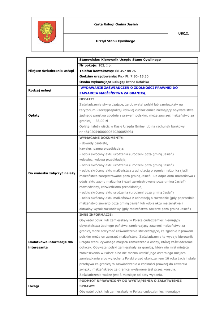 Karta Usługi Gmina Jasień USC.I. Urząd Stanu Cywilnego Stanowisko: Kierownik Urzędu Stanu Cywilnego Nr pokoju: 102, I p. Miejsce świadczenia usługi Telefon kontaktowy: 68 457 88 76 Godziny urzędowania: Pn.- Pt. 7.30- 15.30 Osoba wykonująca usługę: Iwona Rafalska Rodzaj usługi WYDAWANIE ZAŚWIADCZEŃ O ZDOLNOŚCI PRAWNEJ DO ZAWARCIA MAŁśEŃSTWA ZA GRANICĄ OPŁATY: Zaświadczenie stwierdzające, Ŝe obywatel polski lub zamieszkały na terytorium Rzeczypospolitej Polskiej cudzoziemiec niemający obywatelstwa Opłaty Ŝadnego państwa zgodnie z prawem polskim, moŜe zawrzeć małŜeństwo za granicą – 38,00 zł Opłatę naleŜy uiścić w Kasie Urzędu Gminy lub na rachunek bankowy nr 48102054600000570200059931 WYMAGANE DOKUMENTY: - dowody osobiste, kawaler, panna przedkładają: - odpis skrócony aktu urodzenia (urodzeni poza gminą Jasień) wdowiec, wdowa przedkładają: - odpis skrócony aktu urodzenia (urodzeni poza gminą Jasień) Do wniosku załączyć naleŜy - odpis skrócony aktu małŜeństwa z adnotacją o zgonie małŜonka (jeśli małŜeństwo zarejestrowane poza gminą Jasień lub odpis aktu małŜeństwa i odpis aktu zgonu małŜonka (jeŜeli zarejestrowane poza gminą Jasień) rozwiedziony, rozwiedziona przedkładają: - odpis skrócony aktu urodzenia (urodzeni poza gminą Jasień) - odpis skrócony aktu małŜeństwa z adnotacją o rozwodzie (gdy poprzednie małŜeństwo zawarto poza gminą Jasień lub odpis aktu małŜeństwa i aktualny wyrok rozwodowy (gdy małŜeństwo zawarte poza gmina Jasień) INNE INFORMACJE: Obywatel polski lub zamieszkały w Polsce cudzoziemiec niemający obywatelstwa Ŝadnego państwa zamierzający zawrzeć małŜeństwo za granicą moŜe otrzymać zaświadczenie stwierdzające, Ŝe zgodnie z prawem polskim moŜe on zawrzeć małŜeństwo. Zaświadczenie to wydaje kierownik Dodatkowe informacje dla urzędu stanu cywilnego miejsca zamieszkania osoby, której zaświadczenie interesanta dotyczy. Obywatel polski zamieszkały za granicą, który nie miał miejsca zamieszkania w Polsce albo nie moŜna ustalić jego ostatniego miejsca zamieszkania albo wyjechał z Polski przed ukończeniem 16 roku Ŝycia i stale przebywa za granicą to zaświadczenie o zdolności prawnej do zawarcia związku małŜeńskiego za granicą wydawane jest przez konsula. Zaświadczenie waŜne jest 3 miesiące od daty wydania. PODMIOT UPRAWNIONY DO WYSTĄPIENIA O ZAŁATWIENIE Uwagi SPRAWY: Obywatel polski lub zamieszkały w Polsce cudzoziemiec niemający obywatelstwa Ŝadnego państwa zamierzający zawrzeć małŜeństwo za granicą - kobieta: ukończone 18 lat - męŜczyzna: ukończone 18 lat