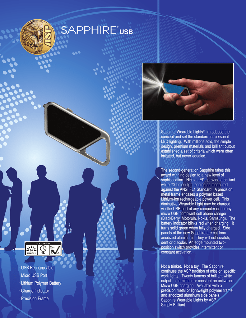 ® USB Sapphire Wearable Lights® introduced the concept and set the standard for personal LED lighting. With millions sold, the simple design, premium materials and brilliant output established a set of criteria which were often imitated, but never equaled. The second generation Sapphire takes this award winning design to a new level of sophistication. Nichia LEDs provide a brilliant white 20 lumen light engine as measured against the ANSI FL1 Standard. A precision metal frame encases a polymer based Lithium-Ion rechargeable power cell. This diminutive Wearable Light may be charged via the USB port of any computer or on any micro USB compliant cell phone charger (BlackBerry, Motorola, Nokia, Samsung). The battery indicator blinks red when charging. It turns solid green when fully charged. Side panels of the new Sapphire are cut from anodized aluminum. They will not scratch, dent or discolor. An edge mounted twoposition switch provides intermittent or constant activation. • USB Rechargeable • Micro USB Port • Lithium Polymer Battery • Charge Indicator • Precision Frame Not a trinket. Not a toy. The Sapphire continues the ASP tradition of mission specific work lights. Twenty lumens of brilliant white output. Intermittent or constant on activation. Micro USB charging. Available with a precision metal or lightweight polymer frame and anodized aluminum side panels. Sapphire Wearable Lights by ASP. Simply Brilliant. Sapphire USB . . . Simply Brilliant Piano Wire Coil Spring Intermittent/Constant Slide Switch Black Tri-Ring® Clip features a coil spring for smooth opening and automatic closing. Retaining Bar Precision Frame Frame Assembly Nichia LED Blue Circuit Board Lithium Polymer Battery Sapphire AL Poly Sapphire Background Designed to professional standards Extremely bright Polymer or metal frame Integral retention clip Specifications Length 2.88" Width 1.10" Thickness .43" Weight 1.5 ounces System 3.7 volt Output 20 lumens Run Time 1 hour Charge Time 45 minutes Impact Resistance 2 meters Produced to aerospace tolerances Gold Anodized Aluminum Side Panel Frame Precision polymer or metal Micro USB port No sharp edges 73.2 mm 27.9 mm 10.9 mm 42.5 gram Panels High strength aluminum alloy Bright dip industrial anodizing Brushed aluminum Polished aluminum 180° viewing radius Solid state Minimal power requirements Minimal heat generation Non-deteriorating light Shockproof Vibration proof Impact resistant Water clear acrylic lens Even light distribution (no hot spots) Battery 3.7 volt Lithium polymer Rechargeable Low temperature certified Leak proof Vibration resistant Fitted battery compartment Retention Clip Triangular profile Coil spring tensioned Wide mouth Automatic attachment Switch Edge mounted Intermittent Constant One hand operation Available Custom Options Laser engraveable Diamond cut Rubberized Die struck Color fill Lamp Nichia LED High luminous intensity High efficiency Visible over one mile 100,000 hour rating Semiconductor based Green Pewter Pink Warranty Limited Lifetime Genuine ASP Look for the colored panels and contrasting frame. The Micro Plug and Micro Flex provide a compact connection for USB charging. Red Violet USB Car Chargers are ideal for travel. USB Wall Chargers are flat, compact and easily carried. Retractable USB Cords are compact, convenient and dependable. ® “Simply Brilliant” Sapphire USB ASP, INC . Box 1794 . Appleton, WI 54912 . (920) 735-6242 . asp-usa.com © 2011 ASP