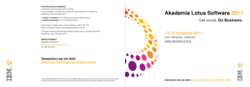 Konferencja jest bezpłatna! Uczestnicy ponoszą tylko koszt noclegu. Ceny noclegów w Hotelu Dom Zdrojowy dla uczestników konferencji Akademia Lotus Software 2011: • pokój 1-osobowy: 185 zł/doba (ilość pokoi ograniczona) • pokój 2-osobowy: 174,70 zł/doba/osoba Rezerwacja noclegu pod numerem telefonu: 58 67 99 100 lub pod adresem email: [email protected] Podczas rezerwowania pokoju proszę powołać się na nazwę konferencji: Akademia Lotus Software 2011. MASZ PYTANIA? Magdalena Kwiecień [email protected] tel. 693 93 56 04 13-15 kwietnia 2011 Dom Zdrojowy, Jastarnia www.zdrojowy.com.pl ® ® Zarejestruj się już dziś! ibm.com/software/pl/events/lotus ©Copyright IBM Corporation 2011. Nazwa IBM, logo IBM są znakami towarowymi lub zastrzeżonymi znakami towarowymi firmy International Business Machines Corporation w Stanach Zjednoczonych i/lub innych krajach. Wszelkie prawa zastrzeżone. Zarejestruj się już dziś! ibm.com/software/pl/events/lotus Agenda Partner Z³oty: Środa, 13.04.2011 14:00-16:00 16:00-17:00 17:00-18:00 18:00-18:30 18:30-19:30 19:30 13-15 kwietnia 2011 Partner Srebrny: Rejestracja i obiad Otwarcie konferencji Plany rozwoju produktów IBM Lotus Wdrożenie Portal NOW w Volkswagen Poznań Czas wolny Kolacja z niespodzianką Czwartek, 14.04.2011 Dom Zdrojowy, Jastarnia www.zdrojowy.com.pl 8:00-10:00 8:30-9:30 Śniadanie Śniadanie biznesowe dla Partnerów Handlowych 10:00-12:00 12:00-12:30 12:30-13:15 Szanowni Państwo, Akademia Lotus Software 2011 jest największym dorocznym spotkaniem dla obecnych i przyszłych klientów oraz Partnerów IBM Lotus. Celem spotkania jest prezentacja aktualnej oferty IBM w dziedzinie systemów pracy grupowej, zbudowanych w oparciu o produkty z grupy IBM Lotus. W programie między innymi: krótkie podsumowanie międzynarodowej konferencji Lotusphere, wyróżnienie najciekawszych projektów Lotus w 2010 roku i wiele sesji biznesowych. W tym roku po raz pierwszy zorganizowane zostaną warsztaty techniczne, w trakcie których przeprowadzimy ciekawe demonstracje i pokażemy na żywo funkcjonalności wybranych produktów. Akademia będzie świetną okazją do wymiany doświadczeń i pomysłów pomiędzy uczestnikami. Kolejnym atutem konferencji będzie możliwość dyskusji ze specjalistami w zakresie konkretnych produktów z rodziny IBM Lotus. Uczestnicy spotkania otrzymają certyfikat potwierdzający ukończenie Akademii. Ze względu na zróżnicowanie spotkania pod kątem technicznym i biznesowym, prosimy o delegowanie po jednej osobie z każdych z tych działów. 13:15-14:00 14:00-15:00 15:00-15:45 15:45-16:30 16:30-17:00 17:00-18:00 18:00-19:00 19:00-20:00 20:00 Zespół IBM Lotus Śniadanie Przegląd aktualnych rozwiązań IBM Lotus – konkurs filmowy! Przerwa na kawę Plan biznesowy dotyczący platformy IBM Lotus Notes/Domino. Dysant Software Gotowi na zmiany – Domino Application Transformer. Dr Notes Obiad Migracja z MS Exchange do Lotus Notes Domino oraz integracja z Active Directory – studium przypadku. IT. EXPERT Słońce w obłokach – rozwiązania firmy T-MATIC dla platform IBM Lotus Software Przerwa na kawę Budowanie aplikacji webowych, portalowych i mobilnych z wykorzystaniem Portlet Factory Integracja zdarzeń i komunikatów – IBM Social Business Toolkit Czas wolny Uroczysta kolacja 12:00-12:30 12:30-14:30 Przerwa na kawę Warsztaty Lotus Domino (DAOS) 14:30-15:00 Obiad 16:30-17:00 17:00-19:00 Przerwa na kawę Ewolucja Aplikacji na platformie Lotus Notes/ Domino. Dysant Software 20:00 Uroczysta kolacja 8:00-10:00 Śniadanie 17:00-19:00 Warsztaty Lotus Protector for Mail Security 10:00-12:00 Warsztaty IBM Xpages Piątek, 15.04.2011 8:00-10:00 8:30-9:30 Śniadanie Śniadanie z Ekspertem IBM Lotus Prezentacje ® Do zobaczenia już wkrótce! 8:00-10:00 Warsztaty Prezentacje Partner Br¹zowy: Zarejestruj się już dziś! ibm.com/software/pl/events/lotus 10:00-11:30 11:30-12:00 12:00-13:00 13:00-13:30 13:30-14:30 Warsztaty Praktyczne wskazówki dla administratorów Lotus Notes Domino Przerwa na kawę Integracja z IBM Cognos Podsumowanie i wręczenie certyfikatów Obiad 10:00-12:00 11:30-12:00 Warsztaty Social Business w akcji Przerwa na kawę 13:30-14:30 Obiad Ilość miejsc na warsztaty ograniczona!