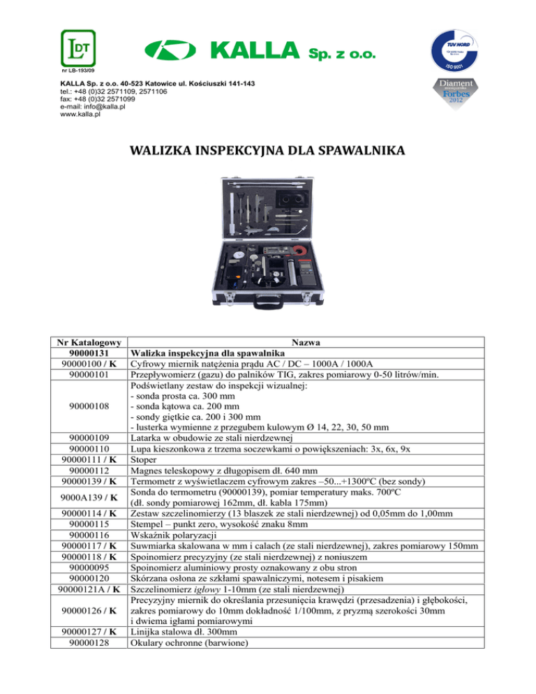 KALLA Sp. z o.o. 40-523 Katowice ul. Kościuszki 141-143 tel.: +48 (0)32 2571109, 2571106 fax: +48 (0)32 2571099 e-mail: [email protected] www.kalla.pl WALIZKA INSPEKCYJNA DLA SPAWALNIKA Nr Katalogowy Nazwa 90000131 Walizka inspekcyjna dla spawalnika 90000100 / K Cyfrowy miernik natężenia prądu AC / DC – 1000A / 1000A 90000101 Przepływomierz (gazu) do palników TIG, zakres pomiarowy 0-50 litrów/min. Podświetlany zestaw do inspekcji wizualnej: - sonda prosta ca. 300 mm 90000108 - sonda kątowa ca. 200 mm - sondy giętkie ca. 200 i 300 mm - lusterka wymienne z przegubem kulowym Ø 14, 22, 30, 50 mm 90000109 Latarka w obudowie ze stali nierdzewnej 90000110 Lupa kieszonkowa z trzema soczewkami o powiększeniach: 3x, 6x, 9x 90000111 / K Stoper 90000112 Magnes teleskopowy z długopisem dł. 640 mm 90000139 / K Termometr z wyświetlaczem cyfrowym zakres –50...+1300ºC (bez sondy) Sonda do termometru (90000139), pomiar temperatury maks. 700ºC 9000A139 / K (dł. sondy pomiarowej 162mm, dł. kabla 175mm) 90000114 / K Zestaw szczelinomierzy (13 blaszek ze stali nierdzewnej) od 0,05mm do 1,00mm 90000115 Stempel – punkt zero, wysokość znaku 8mm 90000116 Wskaźnik polaryzacji 90000117 / K Suwmiarka skalowana w mm i calach (ze stali nierdzewnej), zakres pomiarowy 150mm 90000118 / K Spoinomierz precyzyjny (ze stali nierdzewnej) z noniuszem 90000095 Spoinomierz aluminiowy prosty oznakowany z obu stron 90000120 Skórzana osłona ze szkłami spawalniczymi, notesem i pisakiem 90000121A / K Szczelinomierz igłowy 1-10mm (ze stali nierdzewnej) Precyzyjny miernik do określania przesunięcia krawędzi (przesadzenia) i głębokości, 90000126 / K zakres pomiarowy do 10mm dokładność 1/100mm, z pryzmą szerokości 30mm i dwiema igłami pomiarowymi 90000127 / K Linijka stalowa dł. 300mm 90000128 Okulary ochronne (barwione) KALLA Sp. z o.o. 40-523 Katowice ul. Kościuszki 141-143 tel.: +48 (0)32 2571109, 2571106 fax: +48 (0)32 2571099 e-mail: [email protected] www.kalla.pl 90000129 / K 90000138 / K 9000A138 / K 9000B138 / K J0410400 90000130 Taśma miernicza 3m z poziomicą i funkcją cyrkla Przymiar do określania przesunięcia krawędzi (przesadzenia) okrągły bez podpory Przymiar do określania przesunięcia krawędzi (przesadzenia) odczyt z dokładnością 1/10mm do rur o grubości ścianki do 35mm Przymiar do określania przesunięcia krawędzi (przesadzenia) odczyt z dokładnością 1/10mm i 1/128” (dwie skale) do rur o grubości ścianki do 100mm Poziomica aluminiowa dł. 400mm z dwoma uchwytami do pozycjonowania kołnierzy o otworach montażowych 11/14/16/18/28,5 mm JA-Walizka transportowa na przyrządy Dodatkowe akcesoria (w które można doposażyć walizkę inspekcyjną dla spawalnika) Przymiar do określania przesunięcia krawędzi (przesadzenia) odczyt z dokładnością 9000C138 / K 1/10mm i 1/128” (dwie skale) do rur o grubości ścianki do 150mm Spoinomierz trójskalowy do spoin pachwinowych 90000094 / K odczyt z dokładnością ± 0,1mm 90000140 Lusterko teleskopowe Ø 22,5mm; długość ca 640mm 90000141 Lusterko teleskopowe Ø 30,5mm; długość ca 640mm 90000142 Lusterko teleskopowe Ø 39,0mm; długość ca 640mm K- do tych przyrządów na życzenie klienta może być wystawione świadectwo kalibracji.