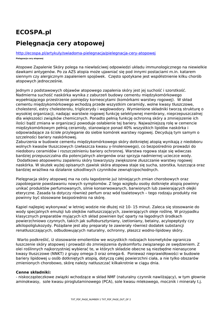 ECOSPA.pl Pielęgnacja cery atopowej http://ecospa.pl/artykuly/swiadoma-pielegnacja/pielegnacja-cery-atopowej Pielęgnacja cery atopowej Atopowe Zapalenie Skóry polega na niewłaściwej odpowiedzi układu immunologicznego na niewielkie dawkami antygenów. Po za AZS atopia może ujawniać się pod innymi postaciami m.in. katarem siennym czy alergicznym zapaleniem spojówek. Często spotykane jest współistnienie kilku chorób atopowych jednocześnie. Jednym z podstawowych objawów atopowego zapalenia skóry jest jej suchość i szorstkość. Nadmierna suchość naskórka wynika z zaburzeń budowy cementu międzykomórkowego wypełniającego przestrzenie pomiędzy korneocytami (komórkami warstwy rogowej). W skład cementu międzykomórkowego wchodzą przede wszystkim ceramidy, wolne kwasy tłuszczowe, cholesterol, estry cholesterolu, triglicerydy i węglowodory. Wymienione składniki tworzą strukturę o wysokiej organizacji, nadając warstwie rogowej funkcję selektywnej membrany, nieprzepuszczalnej dla większości związków chemicznych. Ponadto pełnią funkcję ochronną skóry a zmniejszenie ich ilości bądź zmiana w organizacji powoduje osłabienie tej bariery. Najważniejszą rolę w cemencie międzykomórkowym pełnią ceramidy, stanowiące ponad 40% wszystkich lipidów naskórka i odpowiadające za ścisłe przyleganie do siebie komórek warstwy rogowej. Decydują tym samym o szczelności bariery naskórkowej. Zaburzenia w budowie cementu międzykomórkowego skóry dotkniętej atopią wynikają z niedoboru wolnych kwasów tłuszczowych (zwłaszcza kwasu γ-linolenowego), co bezpośrednio prowadzi do niedoboru ceramidów i rozszczelnieniu bariery ochronnej. Warstwa rogowa staje się wówczas bardziej przepuszczalna dla potencjalnych alergenów oraz sprzyja nadmiernej ucieczce wody. Dodatkowo atopowemu zapaleniu skóry towarzyszy zwiększone złuszczanie warstwy rogowej naskórka. W skutek wyżej opisanych zjawisk skóra atopowa staje się sucha, szorstka, łuszcząca oraz bardziej wrażliwa na działanie szkodliwych czynników zewnątrzpochodnych. Pielęgnacja skóry atopowej ma na celu łagodzenie już istniejących zmian chorobowych oraz zapobieganie powstawaniu nowych symptomów. Z tego względu osoby dotknięte atopią powinny unikać produktów perfumowanych, silnie konserwowanych, barwionych lub zawierających olejki eteryczne. Zasada ta dotyczy również perfum oraz wód toaletowych – tego rodzaju produkty nie powinny być stosowane bezpośrednio na skórę. Kąpiel najlepiej wykonywać w letniej wodzie nie dłużej niż 10- 15 minut. Zaleca się stosowanie do wody specjalnych emulsji lub olejków natłuszczających, zawierających oleje roślinę. W przypadku klasycznych preparatów myjących ich skład powinien być oparty na łagodnych środkach powierzchniowo czynnych, takich jak sulfobursztyniany, izetioniany, betainy, acylopeptydy czy alkilopoliglukozydy. Pożądane jest aby preparaty te zawierały również dodatek substancji renatłuszczających, odbudowujących naturalny, ochronny, płaszcz wodno-lipidowy skóry. Warto podkreślić, iż stosowanie emolientów we wszystkich rodzajach kosmetyków ogranicza łuszczenie skóry atopowej i prowadzi do zmniejszenia dyskomfortu związanego ze swędzeniem. Z olei roślinnych najkorzystniej wybierać te, w których składzie obecne są niezbędne nienasycone kwasy tłuszczowe (NNKT) z grupy omega-3 oraz omega-6. Ponieważ nieprawidłowości w budowie bariery lipidowej u osób dotkniętych atopią, dotyczą całej powierzchni ciała, a nie tylko obszarów zmienionych chorobowo, skórę należy natłuszczać kilkakrotnie w ciągu dnia. Cenne składniki: - niskocząsteczkowe związki wchodzące w skład NMF (naturalny czynnik nawilżający), w tym głownie aminokwasy, sole kwasu piroglutaminowego (PCA), sole kwasu mlekowego, mocznik i minerały t.j. TXT_PDF_PAGE_NUMBER 1 TXT_PDF_PAGE_OUT_OF 2 sód, wapń, potas, magnez; - substancje przyspieszające gojenie, przeciwzapalne i łagodzące: alantoina, pantenol, związki cynku, wysokiej jakości wyciągi i ekstrakty roślinne: hydrolat rumianku rzymskiego, z lipy, aloe vera żel, ekstrakt glicerynowy ze spiruliny. - emolienty i oleje roślinne bogate w NNKT: masło karite shea i nilotica, olej arganowy, olej jojoba, olej konopny (z nasion konopi), olej palmowy czerwony, olej z awokado, olej z czarnego kminku (czarnuszki), olej z pestek winogron. TXT_PDF_PAGE_NUMBER 2 TXT_PDF_PAGE_OUT_OF 2