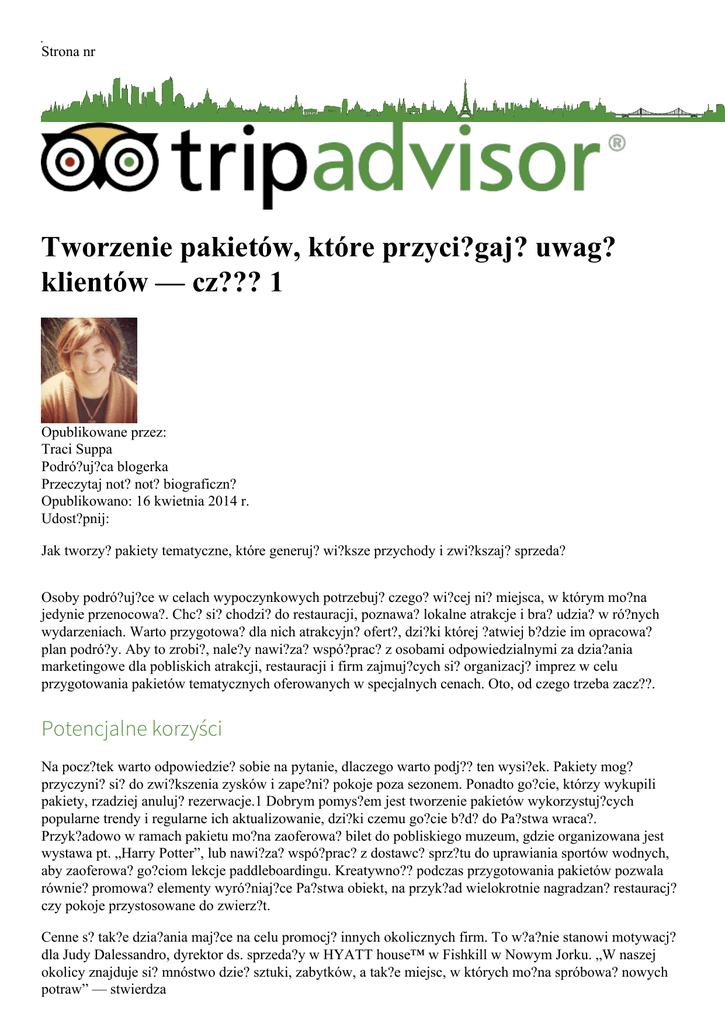 Strona nr Tworzenie pakietów, które przyci?gaj? uwag? klientów — cz??? 1 Opublikowane przez: Traci Suppa Podró?uj?ca blogerka Przeczytaj not? not? biograficzn? Opublikowano: 16 kwietnia 2014 r. Udost?pnij: Jak tworzy? pakiety tematyczne, które generuj? wi?ksze przychody i zwi?kszaj? sprzeda? Osoby podró?uj?ce w celach wypoczynkowych potrzebuj? czego? wi?cej ni? miejsca, w którym mo?na jedynie przenocowa?. Chc? si? chodzi? do restauracji, poznawa? lokalne atrakcje i bra? udzia? w ró?nych wydarzeniach. Warto przygotowa? dla nich atrakcyjn? ofert?, dzi?ki której ?atwiej b?dzie im opracowa? plan podró?y. Aby to zrobi?, nale?y nawi?za? wspó?prac? z osobami odpowiedzialnymi za dzia?ania marketingowe dla pobliskich atrakcji, restauracji i firm zajmuj?cych si? organizacj? imprez w celu przygotowania pakietów tematycznych oferowanych w specjalnych cenach. Oto, od czego trzeba zacz??. Potencjalne korzyści Na pocz?tek warto odpowiedzie? sobie na pytanie, dlaczego warto podj?? ten wysi?ek. Pakiety mog? przyczyni? si? do zwi?kszenia zysków i zape?ni? pokoje poza sezonem. Ponadto go?cie, którzy wykupili pakiety, rzadziej anuluj? rezerwacje.1 Dobrym pomys?em jest tworzenie pakietów wykorzystuj?cych popularne trendy i regularne ich aktualizowanie, dzi?ki czemu go?cie b?d? do Pa?stwa wraca?. Przyk?adowo w ramach pakietu mo?na zaoferowa? bilet do pobliskiego muzeum, gdzie organizowana jest wystawa pt. „Harry Potter”, lub nawi?za? wspó?prac? z dostawc? sprz?tu do uprawiania sportów wodnych, aby zaoferowa? go?ciom lekcje paddleboardingu. Kreatywno?? podczas przygotowania pakietów pozwala równie? promowa? elementy wyró?niaj?ce Pa?stwa obiekt, na przyk?ad wielokrotnie nagradzan? restauracj? czy pokoje przystosowane do zwierz?t. Cenne s? tak?e dzia?ania maj?ce na celu promocj? innych okolicznych firm. To w?a?nie stanowi motywacj? dla Judy Dalessandro, dyrektor ds. sprzeda?y w HYATT house™ w Fishkill w Nowym Jorku. „W naszej okolicy znajduje si? mnóstwo dzie? sztuki, zabytków, a tak?e miejsc, w których mo?na spróbowa? nowych potraw” — stwierdza Dalessandro. „Wspó?praca z przedstawicielami lokalnych atrakcji przy promocji turystyki w dolinie Hudson jest wa?na dla naszego hotelu”. Analiza marki Je?li Pa?stwa obiekt jest z kategorii luksusowych, nie nale?y traktowa? pakietu jako zni?ki, a raczej jako warto?? dodan?. Go?cie nie s? zainteresowani oszcz?dzaniem pieni?dzy, ale chc? wi?cej za t? sam? kwot?. Sytuacja wygl?da inaczej w przypadku tanich hoteli. Wówczas warto promowa? oszcz?dno?ci, które przyniesie skorzystanie z pakietu. Określenie rynku docelowego W nast?pnej kolejno?ci nale?y ustali?, do kogo b?dzie kierowana promocja. W przypadku obiektu przyjaznego dla rodzin wart rozwa?y? nawi?zanie wspó?pracy z przedstawicielami parków tematycznych i muzeów. W?a?ciciele ma?ych luksusowych obiektów nastawionych na pary powinni skierowa? swoje kroki w stron? instytucji kulturalnych i firm organizuj?cych zwiedzanie winiarni. Wybór partnerów Przedstawiciele Aruba Marriott Resort & Stellaris Casino na Arubie oferuj? swoim go?ciom to, czego potrzebuj?: atrakcje organizowane poza obiektem, na przyk?ad rejsy o zachodzie s?o?ca czy bilety upowa?niaj?ce do zwiedzania hodowli motyli. Keirsin Tjon Pian Gi, kierownik ds. marketingu w Internecie, przyznaje, ?e wspó?pracuj?ce firmy s? wybierane w przemy?lany sposób. „Wspó?pracujemy z wybranymi firmami, a decyzje o wspó?pracy podejmujemy na podstawie popularno?ci organizowanych przez nich wycieczek oraz oferowanych zaj??”. Przygotowanie dodatków Wi?kszo?? pakietów obejmuje zakwaterowanie oraz jedno z zaj??, jednak nie wolno zapomina? o dodatkowych us?ugach oferowanych w obiekcie. Warto?? pakietu mo?na podnie??, oferuj?c takie us?ugi jak posi?ek, mo?liwo?? ogl?dania filmów w pokoju czy zabiegi spa. Us?ug? mo?na w ca?o?ci doda? do pakietu lub zaoferowa? j? oddzielnie ze zni?k?. Zach?ci to go?ci do wypróbowania dodatkowych us?ug i zwi?kszy przychody. Wybór właściwego terminu Pakiety powinny by? na tyle atrakcyjne, aby zach?ci? go?ci do korzystania z nich w okresach przej?ciowych. Hotele w miastach obs?uguj?ce go?ci podró?uj?cych w interesach zape?niaj? w ten sposób pokoje w weekendy. Je?eli w okolicy jest organizowane interesuj?ce wydarzenie lub festiwal, warto si? zwróci? do organizatorów z pytaniem o mo?liwo?? przygotowania ofert specjalnych. Aby wyd?u?y? okres, na który s? dokonywane rezerwacje, mo?na te? okre?li? minimaln? dopuszczaln? d?ugo?? pobytu. Metoda ma?ych kroków Na pocz?tek zach?camy do wypróbowania dwóch lub trzech pakietów i ?ledzenia ich skuteczno?ci. Wspó?prac? z ka?dym partnerem nale?y podj?? na okres minimum sze?ciu miesi?cy. Warto oferowa? maksymalnie pi?? ró?nych pakietów jednocze?nie, aby nie zmniejsza? atrakcyjno?ci ofert. Mimo ?e optymalnym rozwi?zaniem jest sprzeda? pakietu przez hotel, w rzeczywisto?ci mo?e go sprzedawa? ka?da wspó?pracuj?ca firma, która akceptuje p?atno?ci kartami kredytowymi. Po oficjalnym udost?pnieniu pakietu nale?y zadba? o to, aby wszyscy partnerzy zamie?cili informacje na jej temat w swoich witrynach i serwisach spo?eczno?ciowych, takich jak Facebook, Twitter i Instagram. 1. ?ród?o: Matt Zito, Travel Business Academy, www.mattzito.com/2010/06/16/how-to-createvacation-packages-for-your-travel-business/ Informacje o stronie TripAdvisor TripAdvisor® to najwi?ksza na ?wiecie strona turystyczna**, która pozwala podró?nym w pe?ni wykorzysta? ka?d? podró?. Mo?na na niej znale?? sprawdzone porady milionów podró?nych, szeroki wachlarz us?ug u?atwiaj?cych planowanie wyjazdu, a tak?e zintegrowane narz?dzia pozwalaj?ce dokonywa? rezerwacji i przeszukiwa? setki witryn w celu znalezienia najlepszych cen obowi?zuj?cych w hotelach. Witryny wspó?pracuj?ce ze stron? TripAdvisor tworz? najwi?ksz? spo?eczno?? podró?nych na ?wiecie. S? one odwiedzane ?rednio 390 milionów razy miesi?cznie* i mo?na na nich znale?? 435 milionów recenzji oraz opinii na temat 6,8 milio