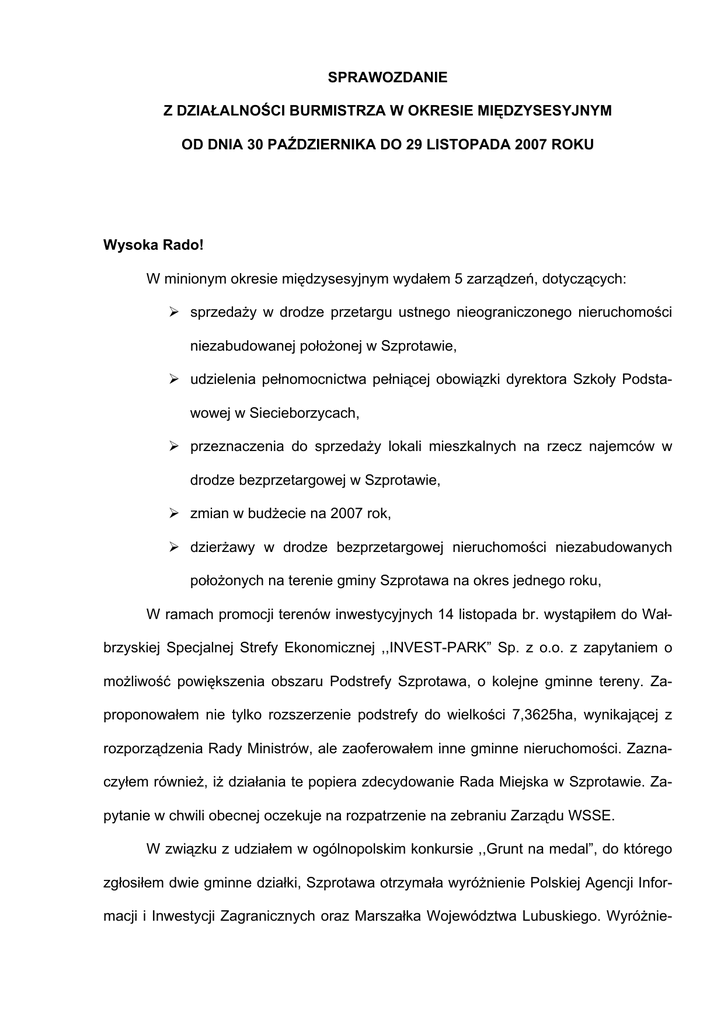 SPRAWOZDANIE Z DZIAŁALNOŚCI BURMISTRZA W OKRESIE MIĘDZYSESYJNYM OD DNIA 30 PAŹDZIERNIKA DO 29 LISTOPADA 2007 ROKU Wysoka Rado! W minionym okresie międzysesyjnym wydałem 5 zarządzeń, dotyczących: sprzedaży w drodze przetargu ustnego nieograniczonego nieruchomości niezabudowanej położonej w Szprotawie, udzielenia pełnomocnictwa pełniącej obowiązki dyrektora Szkoły Podstawowej w Siecieborzycach, przeznaczenia do sprzedaży lokali mieszkalnych na rzecz najemców w drodze bezprzetargowej w Szprotawie, zmian w budżecie na 2007 rok, dzierżawy w drodze bezprzetargowej nieruchomości niezabudowanych położonych na terenie gminy Szprotawa na okres jednego roku, W ramach promocji terenów inwestycyjnych 14 listopada br. wystąpiłem do Wałbrzyskiej Specjalnej Strefy Ekonomicznej ,,INVEST-PARK” Sp. z o.o. z zapytaniem o możliwość powiększenia obszaru Podstrefy Szprotawa, o kolejne gminne tereny. Zaproponowałem nie tylko rozszerzenie podstrefy do wielkości 7,3625ha, wynikającej z rozporządzenia Rady Ministrów, ale zaoferowałem inne gminne nieruchomości. Zaznaczyłem również, iż działania te popiera zdecydowanie Rada Miejska w Szprotawie. Zapytanie w chwili obecnej oczekuje na rozpatrzenie na zebraniu Zarządu WSSE. W związku z udziałem w ogólnopolskim konkursie ,,Grunt na medal”, do którego zgłosiłem dwie gminne działki, Szprotawa otrzymała wyróżnienie Polskiej Agencji Informacji i Inwestycji Zagranicznych oraz Marszałka Województwa Lubuskiego. Wyróżnie- nie to przyznano gminom, które zakwalifikowały się do II etapu konkursu. Szprotawa znalazła się wśród pięciu, innych wyróżnionych gmin z terenu województwa lubuskiego. Zgodnie z zasadami konkursu laureaci otrzymują szansę promocji swojej gminy, jako najlepszego miejsca lokalizacji dla inwestycji produkcyjnych. Wyróżnione w konkursie działki będą rekomendowane w pierwszej kolejności inwestorom zagranicznym, zarówno przez pracowników PAIZ, jak również Regionalne Centra Obsługi Inwestora. Zakończono prace związane z przygotowaniem projektu uchwały w sprawie Wieloletniego Planu Inwestycyjnego Gminy Szprotawa na lata 2008-2013. W projekcie WPI ujęte zostały 24 zadania w układzie rzeczowo - finansowym i w rozbiciu na poszczególne lata oraz z zachowaniem podziału klasyfikacji budżetowej. Przy grupowaniu zadań w obszary tematyczne oraz przy wskazywaniu źródeł ich finansowania kierowano się m.in. wytycznymi wynikającymi z Narodowej Strategii Spójności. Projekt WPI został opracowany przez Zespół Koordynacyjny. 27 września zostało ogłoszone postępowanie o udzielenie zamówienia publicznego w trybie przetargu nieograniczonego na zadanie: Termomodernizacja budynków Szkoły Podstawowej i Gimnazjum w Wiechlinach – Etap I wymiana pokrycia papowego. Termin składania ofert upłynął 19 października. W wyniku postępowania podpisano umowę z firmą Zakład Ogólnobudowlany „Profil” Jarosław Konior z Żagania na kwotę 150.934,43 zł z terminem realizacji 2 miesiące od momentu podpisania umowy. Ogłoszone postępowania: I. 11 października zostało ogłoszone postępowanie o udzielenie zamówienia publicznego w trybie przetargu nieograniczonego na zadanie: Wykonanie następujących dokumentacji technicznych” : a) Wykonanie dokumentacji technicznej budowy drogi gminnej w miejscowości Leszno Górne – jako część I zamówienia, 2 b) Wykonanie dokumentacji technicznej budowy drogi gminnej w miejscowości Długie – jako część II zamówienia, c) Wykonanie dokumentacji technicznej budowy kablowej linii oświetleniowej w miejscowości Długie – jako część III zamówienia. Termin składania ofert upłynął 31 października. Zostały złożone trzy oferty następujących oferentów: 1. BUDMAR s. c. Mariola Adamska, Andrzej Adamski z Leszna, część III zamówienia na kwotę 24949 zł, 4 miesiące od momentu podpisania umowy 2. Profil Bis Sp. z o.o. z Zielonej Góry – część I zamówienia 22.143 zł, część II zamówienia 7.991 zł, część III zamówienia 8.003 zł, 4 miesiące od momentu podpisania umowy 3. Biuro Opracowań Projektów Drogowych i Wyceny Nieruchomości z Zielonej Góry, część I zamówienia 36.800 zł, część II zamówienia 12.000 zł, 4 miesiące od momentu podpisania umowy Trwają prace Komisji Przetargowej. II. 20 listopada zostało ogłoszone postępowanie o udzielenie zamówienia publicznego w trybie przetargu nieograniczonego na usługę: „Dowozy młodzieży szkolnej z terenu gminy Szprotawa do szkół w roku 2008” Termin składania ofert upływa 10.12.2007r o godz. 12:00. III. 19 listopada zostało ogłoszone postępowanie o udzielenie zamówienia publicznego w trybie przetargu nieograniczonego na usługę: „Usługi utrzymania zieleni, gospodarki leśnej i zadrzewieniowej dla potrzeb Urzędu Miejskiego w Szprotawie na lata 2008-2010” Termin składania ofert upływa 05.12.2007r o godz. 12:00. Dobiegły końca prace przy budowie dwóch mostów w Lesznie Górnym. Obiekty w dniu 13 listopada zostały zgłoszone do odbioru. Odbiór prac ustalony na dzień 27 3 listopada nie doszedł do skutku ze względu na konieczność dokonania poprawek. Termin usunięcia usterek i ostatecznego odbioru ustalono na 3 grudnia. Wykonawcą prac jest: Przedsiębiorstwo Robót Mostowych „MOSTAR” Sp. z o.o. ze Stargardu Szczecińskiego. Wartość zamówienia: 3.272.040,00 zł Zakończono prace przy realizacji II etapu zadania „Sieć wodociągowa w miejscowości Cieciszów”. Odbiór prac odbył się 31 października. Wykonawcą zadania była: „Firma Tyliszczak – Antoni Tyliszczak” z Zielonej Góry. Koszt wykonania zadania wyniósł 329 464,98 zł. W sposób sprawny przebiegają prace modernizacyjne przy Stadionie Miejskim w Szprotawie przy ul. Sobieskiego. Na początek grudnia przewidziane jest zakończenie dwóch pierwszych etapów inwestycji tj.: roboty ziemne i podbudowy pod nawierzchnię boiska i bieżni, jak równ