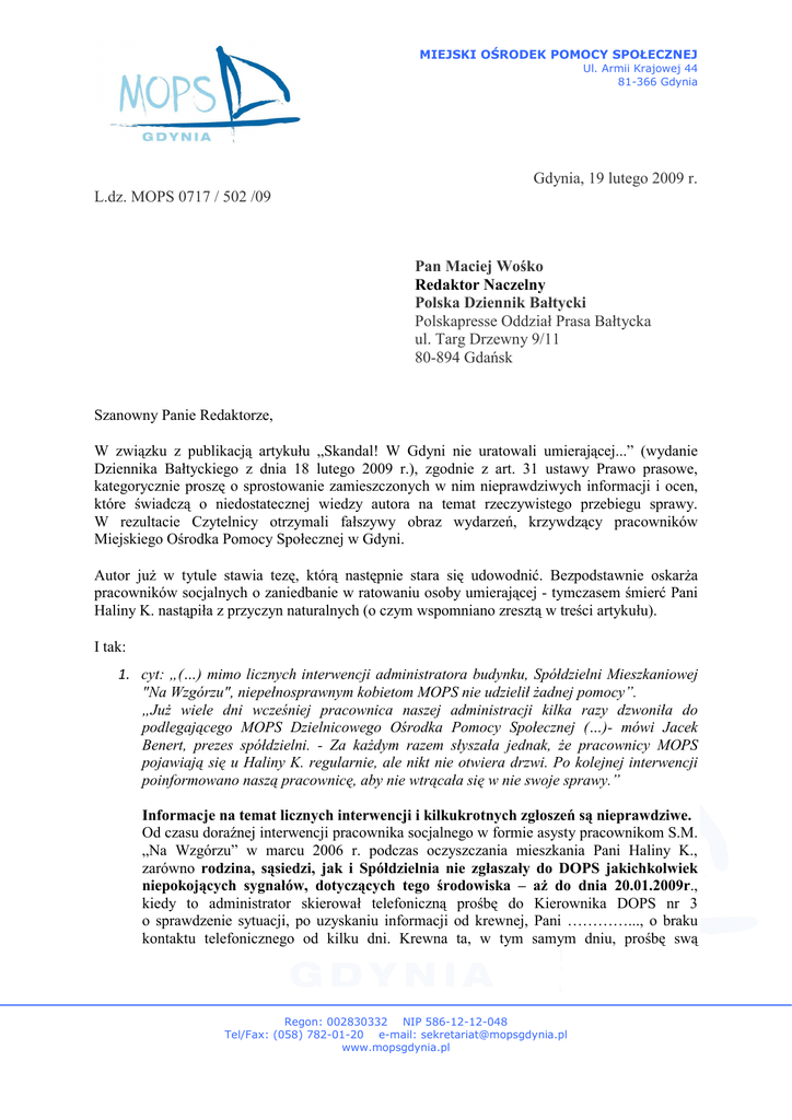 MIEJSKI OŚRODEK POMOCY SPOŁECZNEJ Ul. Armii Krajowej 44 81-366 Gdynia Gdynia, 19 lutego 2009 r. L.dz. MOPS 0717 / 502 /09 Pan Maciej Wośko Redaktor Naczelny Polska Dziennik Bałtycki Polskapresse Oddział Prasa Bałtycka ul. Targ Drzewny 9/11 80-894 Gdańsk Szanowny Panie Redaktorze, W związku z publikacją artykułu „Skandal! W Gdyni nie uratowali umierającej...” (wydanie Dziennika Bałtyckiego z dnia 18 lutego 2009 r.), zgodnie z art. 31 ustawy Prawo prasowe, kategorycznie proszę o sprostowanie zamieszczonych w nim nieprawdziwych informacji i ocen, które świadczą o niedostatecznej wiedzy autora na temat rzeczywistego przebiegu sprawy. W rezultacie Czytelnicy otrzymali fałszywy obraz wydarzeń, krzywdzący pracowników Miejskiego Ośrodka Pomocy Społecznej w Gdyni. Autor juŜ w tytule stawia tezę, którą następnie stara się udowodnić. Bezpodstawnie oskarŜa pracowników socjalnych o zaniedbanie w ratowaniu osoby umierającej - tymczasem śmierć Pani Haliny K. nastąpiła z przyczyn naturalnych (o czym wspomniano zresztą w treści artykułu). I tak: 1. cyt: „(…) mimo licznych interwencji administratora budynku, Spółdzielni Mieszkaniowej "Na Wzgórzu", niepełnosprawnym kobietom MOPS nie udzielił Ŝadnej pomocy”. „JuŜ wiele dni wcześniej pracownica naszej administracji kilka razy dzwoniła do podlegającego MOPS Dzielnicowego Ośrodka Pomocy Społecznej (…)- mówi Jacek Benert, prezes spółdzielni. - Za kaŜdym razem słyszała jednak, Ŝe pracownicy MOPS pojawiają się u Haliny K. regularnie, ale nikt nie otwiera drzwi. Po kolejnej interwencji poinformowano naszą pracownicę, aby nie wtrącała się w nie swoje sprawy.” Informacje na temat licznych interwencji i kilkukrotnych zgłoszeń są nieprawdziwe. Od czasu doraźnej interwencji pracownika socjalnego w formie asysty pracownikom S.M. „Na Wzgórzu” w marcu 2006 r. podczas oczyszczania mieszkania Pani Haliny K., zarówno rodzina, sąsiedzi, jak i Spółdzielnia nie zgłaszały do DOPS jakichkolwiek niepokojących sygnałów, dotyczących tego środowiska – aŜ do dnia 20.01.2009r., kiedy to administrator skierował telefoniczną prośbę do Kierownika DOPS nr 3 o sprawdzenie sytuacji, po uzyskaniu informacji od krewnej, Pani …………..., o braku kontaktu telefonicznego od kilku dni. Krewna ta, w tym samym dniu, prośbę swą Regon: 002830332 NIP 586-12-12-048 Tel/Fax: (058) 782-01-20 e-mail: [email protected] www.mopsgdynia.pl skierowała równieŜ do DOPS (zgłoszenie przyjęto i umówiono się z krewną na wizytę w środowisku w dniu następnym, tj. 21.01.2009r.). Potwierdzenia nie znajduje równieŜ informacja opisana w ostatnim zdaniu wypowiedzi. 2. cyt: „W MOPS zainteresowali się sprawą dopiero wtedy, gdy zainterweniowaliśmy u dyrektor ośrodka, szeregowi pracownicy wcześniej zupełnie zlekcewaŜyli tak powaŜną sytuację”. „Przedstawiciele spółdzielni mówią jednak, Ŝe nastawienie przedstawicieli MOPS wobec chorych kobiet nawet po tak dramatycznej akcji w ogóle się nie zmieniło.” Nie było Ŝadnej interwencji administracji SM u dyrektora MOPS! Po interwencyjnym porządkowaniu mieszkania Pani Barbary T. i Haliny K. w 2006 roku o sytuacji w tej rodzinie pracownik socjalny powiadomił Centrum Zdrowia Psychicznego przy ul. Traugutta 9 w Gdyni oraz pielęgniarkę środowiskową z Przychodni Lekarskiej „Grabówek”. Po tym wydarzeniu, po powrocie w/w osób ze szpitala, pracownik socjalny kilkakrotnie wizytował środowisko, pozostawiając informacje o moŜliwości udzielenia wsparcia. Obie Panie odmówiły, ponadto Pani Barbara T. złoŜyła pisemne oświadczenie o rezygnacji z zaproponowanego wsparcia (oświadczenie znajduje się w aktach DOPS Nr 3). Natomiast w związku ze zgłoszeniem od krewnej obu pań, w dniu 20.01.2009 r. skierowanym do DOPS, pracownik socjalny podjął działania z policją w następnym dniu (opis w punkcie 3). 3. cyt: „Policję i straŜ poŜarną wezwali /…/ zaniepokojeni przedstawiciele spółdzielni (…)” „To paradoks, Ŝe ostatecznie nasz administrator wezwał pomoc do tych kobiet.” Policja poproszona została o asystę przy wejściu w środowisko przez pracownika socjalnego w związku z rezygnacją krewnej, Pani ………….., z udziału w zaplanowanej wizycie w dniu 21.01.2009r. - wezwano patrol Policji o godz. 9.03, a następnie o godz. 9.05 potwierdzono wyjazd (dane z billingu telefonicznego DOPS Nr 3), natomiast zgłoszenie od administratora Policja przyjęła o godz. 9.20. StaŜ poŜarna włączona została do akcji na miejscu, kiedy okazało się, Ŝe nikt nie otwiera drzwi. 4. cyt: „Policja, straŜ poŜarna i przedstawiciele SM "Na Wzgórzu" wkroczyli do mieszkania 21 stycznia” Administrator Spółdzielni Mieszkaniowej, Pani ………………., poinformowana została telefonicznie w dniu 21.01.2009r. przez Kierownika DOPS Nr 3, Panią ……………….., o wyjeździe pracowników socjalnych z Policją na interwencję w tej sprawie. Na miejsce Pani administrator przybyła juŜ po ujawnieniu zwłok i nie weszła do pomieszczenia. Po opisanych wydarzeniach, w godzinach popołudniowych, zadzwoniła do Kierownika DOPS Nr 3 z podziękowaniami dla pracowników socjalnych za szybką i sprawną interwencję w środowisku. 5. cyt: „(…) od opiekowania się osobami w trudnej sytuacji Ŝyciowej jest MOPS.” Zgodnie z art. 102 ustawy o pomocy społecznej świadczenia udzielanie są za zgodą osoby zainteresowanej lub jej przedstawiciela ustawowego. Nie jest moŜliwe podjęcie działań ingerujących w sprawy osobiste wbrew woli danej osoby. Losem Pani Barbary T. i Haliny K. interesowała się rodzina zamieszkała w Wejherowie (Pani ……………….), która była z nimi w regularnym kontakcie. 6. cyt: „Jak się teŜ okazuje, obie kobiety w lokalu przy ul. Zamenhofa wegetowały od trzech lat niczym zwierzęta, w warunkach urągających ludzkiej godności”. Podczas interwencji przeprowadzonej w 2006 roku w mi