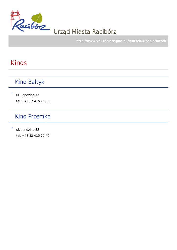 Urząd Miasta Racibórz http://www.xn--racibrz-p0a.pl/deutsch/kinos/printpdf Kinos Kino Bałtyk ul. Londzina 13 tel. +48 32 415 20 33 Kino Przemko ul. Londzina 38 tel. +48 32 415 25 40