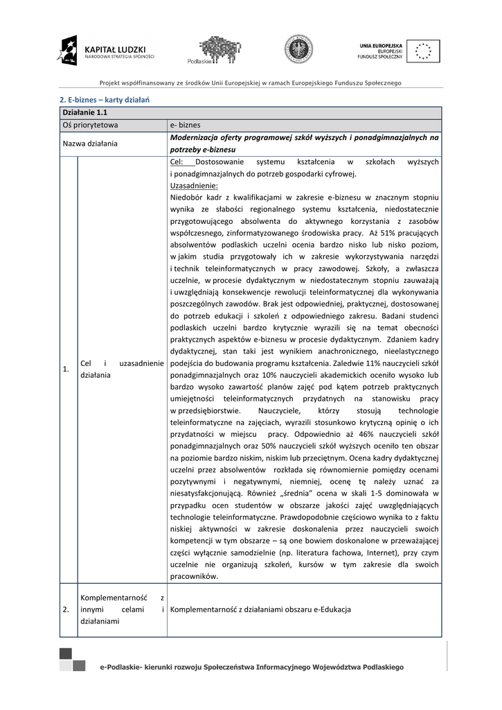 Projekt współfinansowany ze środków Unii Europejskiej w ramach Europejskiego Funduszu Społecznego 2. E-biznes – karty działań Działanie 1.1 Oś priorytetowa Nazwa działania e- biznes Modernizacja oferty programowej szkół wyższych i ponadgimnazjalnych na potrzeby e-biznesu Cel: Dostosowanie systemu kształcenia w szkołach wyższych i ponadgimnazjalnych do potrzeb gospodarki cyfrowej. Uzasadnienie: Niedobór kadr z kwalifikacjami w zakresie e-biznesu w znacznym stopniu wynika ze słabości regionalnego systemu kształcenia, niedostatecznie przygotowującego absolwenta do aktywnego korzystania z zasobów współczesnego, zinformatyzowanego środowiska pracy. Aż 51% pracujących absolwentów podlaskich uczelni ocenia bardzo nisko lub nisko poziom, w jakim studia przygotowały ich w zakresie wykorzystywania narzędzi i technik teleinformatycznych w pracy zawodowej. Szkoły, a zwłaszcza uczelnie, w procesie dydaktycznym w niedostatecznym stopniu zauważają i uwzględniają konsekwencje rewolucji teleinformatycznej dla wykonywania poszczególnych zawodów. Brak jest odpowiedniej, praktycznej, dostosowanej do potrzeb edukacji i szkoleń z odpowiedniego zakresu. Badani studenci podlaskich uczelni bardzo krytycznie wyrazili się na temat obecności praktycznych aspektów e-biznesu w procesie dydaktycznym. Zdaniem kadry dydaktycznej, stan taki jest wynikiem anachronicznego, nieelastycznego uzasadnienie podejścia do budowania programu kształcenia. Zaledwie 11% nauczycieli szkół ponadgimnazjalnych oraz 10% nauczycieli akademickich oceniło wysoko lub bardzo wysoko zawartość planów zajęć pod kątem potrzeb praktycznych umiejętności teleinformatycznych przydatnych na stanowisku pracy w przedsiębiorstwie. Nauczyciele, którzy stosują technologie teleinformatyczne na zajęciach, wyrazili stosunkowo krytyczną opinię o ich przydatności w miejscu pracy. Odpowiednio aż 46% nauczycieli szkół ponadgimnazjalnych oraz 50% nauczycieli szkół wyższych oceniło ten obszar na poziomie bardzo niskim, niskim lub przeciętnym. Ocena kadry dydaktycznej uczelni przez absolwentów rozkłada się równomiernie pomiędzy ocenami pozytywnymi i negatywnymi, niemniej, ocenę tę należy uznać za niesatysfakcjonującą. Również „średnia” ocena w skali 1-5 dominowała w przypadku ocen studentów w obszarze jakości zajęć uwzględniających technologie teleinformatyczne. Prawdopodobnie częściowo wynika to z faktu niskiej aktywności w zakresie doskonalenia przez nauczycieli swoich kompetencji w tym obszarze – są one bowiem doskonalone w przeważającej części wyłącznie samodzielnie (np. literatura fachowa, Internet), przy czym uczelnie nie organizują szkoleń, kursów w tym zakresie dla swoich pracowników. 1. Cel i działania 2. Komplementarność innymi celami działaniami z i Komplementarność z działaniami obszaru e-Edukacja e-Podlaskie- kierunki rozwoju Społeczeństwa Informacyjnego Województwa Podlaskiego Projekt współfinansowany ze środków Unii Europejskiej w ramach Europejskiego Funduszu Społecznego 3. 4. 5. 6. 7. Interesariusze Przedsięwzięcia wykonania Budżet i sposób finansowania oraz inne niezbędne zasoby Termin realizacji Poziom priorytetu: 1- najwyższy, 2-wysoki, 3- średni Działanie 1.2 Oś priorytetowa Nazwa działania 1. do Cel i działania uczelnie wyższe szkoły ponadgimnazjalne i ich jednostki prowadzące instytucje szkoleniowe organizacje pracodawców nauczyciele akademiccy nauczyciele szkół ponadgimnazjalnych uczniowie i studenci audyt programów nauczania przedmiotów informatycznych, badanie potrzeb pracodawców badanie kompetencji uczniów i studentów z zakresu wiedzy informatycznej, dostosowanie programów nauczania do potrzeb regionalnych przedsiębiorstw, szkolenia kadr szkolnych i akademickich z narzędzi informatycznych stosowanych w przedsiębiorstwach, dofinansowania kosztów zajęć dodatkowych w formie warsztatów specjalistycznych dla uczniów szkół ponadgimnazjalnych i studentów, organizacja dodatkowych zajęć, specjalistycznych warsztatów, praktyk dla uczniów i studentów w regionalnych przedsiębiorstwach indykatywnie: 8% środków przeznaczonych na oś 2012-2020 1 e- biznes Uruchomienie nowych kierunków studiów, w tym studiów podyplomowych Cel: Podniesienie kompetencji cyfrowych absolwentów podlaskich uczelni wyższych. Uzasadnienie: Podlaskie uczelnie w zasadzie nie posiadają w swojej ofercie kierunków i specjalności studiów kształcących absolwentów przygotowanych do uzasadnienie wdrażania nowoczesnych rozwiązań teleinformatycznych w przedsiębiorstwach. Również proces edukacyjny na kierunkach informatycznych regionalnych uczelni jest skoncentrowany raczej na zagadnieniach technicznych i narzędziowych niż biznesowo-aplikacyjnych. W efekcie absolwenci tych kierunków posiadają niedostateczną wiedzę w zakresie projektowania, budowania, wdrażania i eksploatowania systemów informatycznych na potrzeby e-biznesu. e-Podlaskie- kierunki rozwoju Społeczeństwa Informacyjnego Województwa Podlaskiego Projekt współfinansowany ze środków Unii Europejskiej w ramach Europejskiego Funduszu Społecznego 2. 3. Komplementarność innymi celami działaniami z i Komplementarność z działaniami obszaru e-Edukacja Interesariusze uczelnie wyższe organizacje pracodawców organizacje zawodowe kadra dydaktyczna studenci opracowanie programów studiów dopasowanych do potrzeb regionalnej gospodarki cyfrowej, uwzględniających praktyki zawodowe w przedsiębiorstwach przygotowanie kadry dydaktycznej do prowadzenia zajęć na nowych kierunkach studiów, w tym podyplomowych, dofinansowanie kosztów udziału specjalistów z przedsiębiorstw w procesie kształcenia wyposażenie uczelni w specjalistyczny sprzęt i oprogramowanie cyfrowe promocja nowych kierunków studiów, w tym podyplomowych dofinansowanie kosztów prowadzenia studiów podyplomowych. 4. Przedsięwzięcia wykonania do 5. 6. 7. Budżet i spos