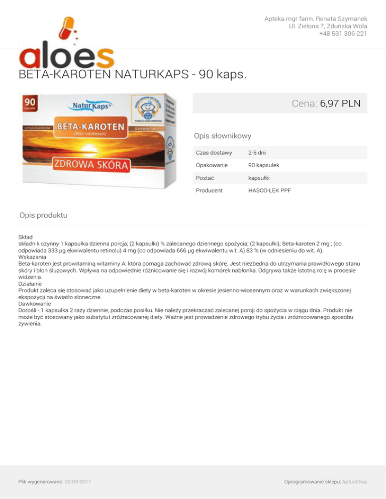 Apteka mgr farm. Renata Szymanek Ul. Zielona 7, Zduńska Wola +48 531 306 221 BETA-KAROTEN NATURKAPS - 90 kaps. Cena: 6,97 PLN Opis słownikowy Czas dostawy 2-5 dni Opakowanie 90 kapsułek Postać kapsułki Producent HASCO-LEK PPF Opis produktu Skład składnik czynny 1 kapsułka dzienna porcja; (2 kapsułki) % zalecanego dziennego spożycia; (2 kapsułki); Beta-karoten 2 mg ; (co odpowiada 333 µg ekwiwalentu retinolu) 4 mg (co odpowiada 666 µg ekwiwalentu wit. A) 83 % (w odniesieniu do wit. A). Wskazania Beta-karoten jest prowitaminą witaminy A, która pomaga zachować zdrową skórę. Jest niezbędna do utrzymania prawidłowego stanu skóry i błon śluzowych. Wpływa na odpowiednie różnicowanie się i rozwój komórek nabłonka. Odgrywa także istotną rolę w procesie widzenia. Działanie Produkt zaleca się stosować jako uzupełnienie diety w beta-karoten w okresie jesienno-wiosennym oraz w warunkach zwiększonej ekspozycji na światło słoneczne. Dawkowanie Dorośli - 1 kapsułka 2 razy dziennie, podczas posiłku. Nie należy przekraczać zalecanej porcji do spożycia w ciągu dnia. Produkt nie może być stosowany jako substytut zróżnicowanej diety. Ważne jest prowadzenie zdrowego trybu życia i zróżnicowanego sposobu żywienia. Plik wygenerowano: 02-03-2017 Powered by TCPDF (www.tcpdf.org) Oprogramowanie sklepu: AptusShop