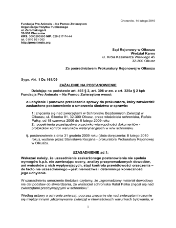 Chrzanów, 14 lutego 2010 Fundacja Pro Animals – Na Pomoc Zwierzętom Organizacja Pożytku Publicznego ul. Żeromskiego 6 32-500 Chrzanów KRS: 0000293995 NIP: 628-217-74-44 tel. 0 510 921 063 http://proanimals.org Sąd Rejonowy w Olkuszu Wydział Karny ul. Króla Kazimierza Wielkiego 45 32-300 Olkusz Za pośrednictwem Prokuratury Rejonowej w Olkuszu Sygn. Akt. 1 Ds 161/09 ZAŻALENIE NA POSTANOWIENIE Działając na podstawie art. 465 § 2, art. 306 w zw. z art. 325a § 2 kpk Fundacja Pro Animals – Na Pomoc Zwierzętom wnosi: o uchylenie i ponowne przekazanie sprawy do prokuratora, który zatwierdził zaskarżone postanowienie o umorzeniu śledztwa w sprawie: 1: znęcania się nad zwierzętami w Schronisku Bezdomnych Zwierząt w Olkuszu, ul. Sikorka 91, 32-300 Olkusz, przez właściciela schroniska, Rafała Pałkę, od 18 czerwca 2006 do 9 lutego 2009 roku 2: popełnienia przestępstwa przeciwko wiarygodności dokumentów protokołów kontroli warunków weterynaryjnych w w/w schronisku tj. postanowienie z dnia 31 grudnia 2009 roku (data doręczenia: 8 lutego 2010 roku), wydane przez Stanisława Kocjana - prokuratora Prokuratury Rejonowej w Olkuszu. UZASADNIENIE ad 1: Wskazać należy, że uzasadnienie zaskarżonego postanowienia nie spełnia wymogów k.p.k. nie zawierając: oceny, analizy przeprowadzonych dowodów, ani wniosków z nich wypływających, stąd kontrola prawidłowości orzeczenia – de facto nie uzasadnionego – jest niemożliwa i determinuje konieczność jego uchylenia. W uzasadnieniu umorzenia śledztwa czytamy, że „zgromadzony materiał dowodowy nie dał podstaw do stwierdzenia, że właściciel schroniska Rafał Pałka znęcał się nad zwierzętami przebywającymi w schronisku”. Według ustawy o ochronie zwierząt, poprzez znęcanie się nad zwierzętami rozumie się między innymi „utrzymywanie zwierząt w niewłaściwych warunkach bytowania, w 1 tym utrzymywanie ich w stanie rażącego niechlujstwa”, „utrzymywanie zwierząt w stanie zagłodzenia, brudu, nieleczonej choroby, w niewłaściwym pomieszczeniu i nadmiernej ciasnocie.” Niezapewnienie przyjmowanym zwierzętom odpowiednich warunków bytowania i należytej opieki weterynaryjnej przez właściciela olkuskiego schroniska, co było objawem znęcania się nad zwierzętami, potwierdzone zostało nie tylko zeznaniami świadków, wykonanymi na terenie schroniska fotografiami ale też protokołami kontroli weterynaryjnych oraz notatkami służbowymi pracowników Urzędu Miasta i Gminy Olkusz. Efektem zaniedbań Rafała Pałki – opiekuna przyjmowanych do swojej placówki zwierząt, było wydanie 6 lutego 2009 roku przez Powiatowego Lekarza Weterynarii zakazu dalszego przyjmowania psów do schroniska. 20 grudnia 2008 roku prezes Fundacji Pro Animals – Na Pomoc Zwierzętom, Jolanta Racka, otrzymała telefon z prośbą o pomoc w udzieleniu szybkiej pomocy weterynaryjnej dla dwóch z czterech psów odebranych przez Ingę Siemek, Ewelinę Głowacz oraz Bartłomieja Zielińskiego ze schroniska dla bezdomnych zwierząt w Olkuszu. Odebrane psy: suka Łatka i pies Smarczek, mimo że bardzo chore, nie były odizolowane od zdrowych zwierząt, przebywały w boksach ogólnych. Zostały wydane bez wymaganego rozporządzeniem wypisu z wykazu, który to wypis powinien był zawierać dokładny opis zabieranego zwierzęcia, informacje dotyczące kwarantanny i jej wyniki, a także dane dotyczące przeprowadzonych szczepień i ewentualnych zabiegów weterynaryjnych. Razem z przedstawicielką fundacji, Anną Siata, psy zostały przewiezione do Kliniki Weterynaryjnej ARKA w Krakowie, gdzie lekarz weterynarii Przemysław Baran udzielił im natychmiastowej pomocy weterynaryjnej i podjął decyzję o hospitalizacji. Dowody (patrz: akta sprawy): 1. Karty informacyjne leczenia suki Łatki, psa Smarczka. 2. Fotografie dokumentujące stan psów w jakim zabrane zostały ze schroniska. 3. Zeznania Jolanty Rackiej, Ingi Siemek, Eweliny Głowacz, Bartłomieja Zielińskiego oraz lek. wet. Przemysława Barana. Fundacja, zaalarmowana przekazami o nieodpowiednich warunkach panujących w schronisku i bardzo złym stanem zabranych stamtąd psów, podjęła decyzję o osobistej wizycie w w/w schronisku. Dnia 23 grudnia Prezes Fundacji Jolanta Racka wraz z członkiem Zarządu Fundacji Urszulą Sołtysik udały się do w/w schroniska. Urszula Sołtysik wykonała zdjęcia bezdomnych, wychudzonych, brudnych, przemoczonych psów przebywających w warunkach rażącego niechlujstwa. Fotografie te wykonywane były z ukrycia z uwagi na zdecydowany sprzeciw pracowników schroniska wobec faktu wykonywania zdjęć na jego terenie. Tego dnia przedstawicielki Fundacji zabrały ze schroniska cztery psy: mieszańca długowłosego rudego Czekusia, czarnego pudla Bolusia oraz mieszańca Amstaffa Zeusa i mieszańca Bullteriera Zulusa. Psy te, mimo że chore, nie były odizolowane od zdrowych zwierząt, przebywały w boksach ogólnych. Mieszaniec Amstaffa oraz mieszaniec Bullteriera (a więc ras uznawanych za agresywne), zamieszkiwały jedna małą klatkę z jedną budą (przebywały tam razem od co najmniej 20 grudnia – w tym 2 dniu widziane były razem w tej klatce przez Ingę Siemek). Świeże rany na ich głowach i pyskach świadczyły o tym, że dochodziło między nimi do walk o pokarm i miejsce w budzie (co potwierdzone zostało w hoteliku dla zwierząt w Wieliczce, gdzie przewiezione zostały po odbyciu hospitalizacji – początkowo umieszczone w jednym boksie gryzły się, musiały więc zostać odseparowane i umieszczone w osobnych boksach). Wszystkie cztery psy zostały wydane bez wymaganego rozporządzeniem wypisu z wykazu zwierząt przebywających w schronisku. Psy zostały przewiezione do Kliniki Weterynaryjnej ARKA w Krakowie, gdzie lekarz weterynarii Przemysław Baran udzielił im natychmiastowej pomocy weterynaryjnej i podjął decyzję o hospitalizacji Dowody (patrz: akta sprawy): 1. Fotografie z 23 grudnia wykonane na terenie schroni
