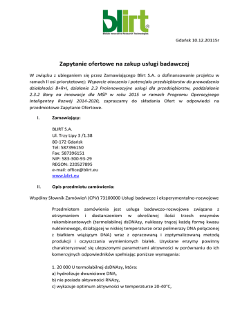 Gdańsk 10.12.20115r Zapytanie ofertowe na zakup usługi badawczej W związku z ubieganiem się przez Zamawiającego Blirt S.A. o dofinansowanie projektu w ramach II osi priorytetowej: Wsparcie otoczenia i potencjału przedsiębiorstw do prowadzenia działalności B+R+I, działanie 2.3 Proinnowacyjne usługi dla przedsiębiorstw, poddziałanie 2.3.2 Bony na innowacje dla MŚP w roku 2015 w ramach Programu Operacyjnego Inteligentny Rozwój 2014-2020, zapraszamy do składania Ofert w odpowiedzi na przedmiotowe Zapytanie Ofertowe. I. Zamawiający: BLIRT S.A. Ul. Trzy Lipy 3 /1.38 80-172 Gdańsk Tel: 587396150 Fax: 587396151 NIP: 583-300-93-29 REGON: 220527895 e-mail: [email protected] www.blirt.eu II. Opis przedmiotu zamówienia: Wspólny Słownik Zamówień (CPV) 73100000 Usługi badawcze i eksperymentalno-rozwojowe Przedmiotem zamówienia jest usługa badawczo-rozwojowa związana z otrzymaniem i dostarczeniem w określonej ilości trzech enzymów rekombinantowych (termolabilnej dsDNAzy, nukleazy tnącej każdą formę kwasu nukleinowego, działającej w niskiej temperaturze oraz polimerazy DNA połączonej z białkiem wiążącym DNA) wraz z opracowaną i zoptymalizowaną metodą produkcji i oczyszczania wymienionych białek. Uzyskane enzymy powinny charakteryzować się ulepszonymi parametrami aktywności w porównaniu do ich komercyjnych odpowiedników spełniając poniższe wymagania: 1. 20 000 U termolabilnej dsDNAzy, która: a) hydrolizuje dwuniciowe DNA, b) nie posiada aktywności RNAzy, c) wykazuje optimum aktywności w temperaturze 20-40°C, d) ulega inaktywacji w temperaturze 45-55°C. 2. 80 000 U nukleazy, która: a) hydrolizuje każdą formę kwasu nukleinowego (RNA, DNA, jednoniciowe, dwuniciowe, liniowe, koliste), b) wykazuje optymalną temperaturę aktywności poniżej 20°C. 3. 20 000 U polimerazy fuzyjnej, która: - jest polimerazą DNA Pyrococcus woesei połączoną z białkiem wiążącym DNA innym niż Sso7d (białko użyte w fuzji nie może wykazywać podobieństwa większego niż 50% w stosunku do białka Sso7d) - posiada zbliżone właściwości do fuzyjnej polimerazy Pfu z białkiem Sso7d wiążącym dwuniciowe DNA pochodzącym z hipertermofilnej archeabakterii Sulfolobus solfataricus. Analiza porównawcza uwzględniać powinna takie użytkowe cechy enzymów jak procesywność, termostabilność, wydajność reakcji PCR oraz pracę z trudnymi matrycami (bogatymi w pary GC). Usługa zakończona zostanie dostarczeniem wyżej wymienionych białek rekombinantowych wraz z opracowaną metodą produkcji i oczyszczania, a także pisemnego raportu z wykonanej usługi. Zamawiający nie przewiduje składania ofert częściowych. III. Sposób przygotowania oferty: 1. Złożona oferta powinna zawierać: a. nazwę i adres oferenta, b. datę sporządzenia oferty i termin ważności oferty ( wymagane minimum 30 dni ważność oferty), c. wartość usługi badawczej w PLN (netto oraz brutto), d. zakres i szczegółowy opis oferowanych usług/i badawczej/ych w ramach oferty, e. wyszczególnienie materiałów i odczynników niezbędnych do przeprowadzenia usługi jakie Zamawiający musi zakupić celem realizacji zamówienia wraz z podaniem ich kosztu (do 15% całkowitej kwoty wartości usługi), f. maksymalny czas realizacji usługi, g. warunki płatności i dostawy, h. dane osoby do kontaktu (imię nazwisko, numer telefonu, adres email), i. podpis osoby upoważnionej do wystawienia oferty, j. oferta powinna być sporządzona na papierze firmowym oferenta lub opatrzona pieczątką firmową. Oferty, które nie będą odpowiadać wymogom określonym w niniejszym Zaproszeniu/Ogłoszeniu zostaną odrzucone, pozostałe oferty zostaną dopuszczone do oceny punktowej. 2. Oferta powinna zawierać dodatkowe informacje: a. dorobek publikacyjny w czasopismach zagranicznych Kierownika Badań/ Głównego Wykonawcy potwierdzający doświadczenie w produkcji białek rekombinantowych, głównie polimeraz, nukleaz, białek oddziałujących z DNA) - wykaz 5 publikacji przedstawionych do oceny doświadczenia Wykonawcy. IV. Wykaz oświadczeń lub dokumentów, jakie muszą dostarczyć wykonawcy: 1. Pisemne oświadczenie oferenta o tym, że posiada niezbędną wiedzę i doświadczenie do wykonania zamówienia oraz, że znajduje się w sytuacji ekonomicznej i finansowej zapewniającej wykonanie zamówienia. 2. Pisemne oświadczenie o spełnieniu kryterium kwalifikowalności uczelni w ramach poddziałania (siedziba na terytorium Rzeczypospolitej Polskiej oraz przyznana kategoria naukowa A+, A lub B). 3. Pisemne oświadczenie o dysponowaniu odpowiednim potencjałem technicznym w zakresie aparatury badawczej niezbędnej do należytego wykonania przedmiotu zamówienia. 4. Pisemne oświadczenie o dysponowaniu zasobami ludzkimi zdolnymi do prowadzenia prac badawczych w przedmiocie prac badawczych. Zespół badawczy nie powinien liczyć mniej niż dwóch pracowników naukowych, w tym jednego z tytułem co najmniej doktora. 5. Pisemne oświadczenie o braku powiązań osobowo - kapitałowych z Zamawiającym zgodnie z art. 6c ust. 2 ustawy z dnia 9 listopada 2000 r. o utworzeniu Polskiej Agencji Rozwoju Przedsiębiorczości (Dz.U. z 2014 r., poz. 1804) przez co należy rozumieć kapitałowe lub osobowe powiązanie, polegające na: a. uczestniczeniu w spółce jako wspólnik spółki cywilnej lub spółki osobowej, b. posiadaniu udziałów lub co najmniej 5% akcji, c. pełnieniu funkcji członka organu nadzorczego lub zarządzającego, prokurenta, pełnomocnika, d. pozostawaniu w takim stosunku prawnym lub faktycznym, który może budzić uzasadnione wątpliwości, co do bezstronności w wyborze wykonawcy, w szczególności pozostawanie w związku małżeńskim, w stosunku pokrewieństwa lub powinowactwa w linii prostej, pokrewieństwa lub powinowactwa w linii bocznej do drugiego stopnia lub w stosunku przysposobienia, opieki lub kurateli. V. Zapytania o przedmiot zamówienia: 1. Wszelkich informacji dotyczących prze