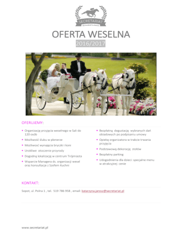 OFERTA WESELNA 2016/2017 OFERUJEMY: Organizację przyjęcia weselnego w Sali do 120 osób Bezpłatną degustację wybranych dań obiadowych po podpisaniu umowy Możliwość ślubu w plenerze Opiekę organizatora w trakcie trwania przyjęcia Możliwosć wynajęcia bryczki i koni Urokliwe otoczenie przyrody Dogodną lokalizację w centrum Trójmiasta Wsparcie Managera ds. organizacji wesel oraz konsultacje z Szefem Kuchni Podstawową dekorację stołów Bezpłatny parking Udogodnienia dla dzieci: specjalne menu w atrakcyjnej cenie KONTAKT: Sopot, ul. Polna 1 , tel. 519 786 958 , email: [email protected] www.secretariat.pl MENU WESELNE I Powitanie Młodej Pary chlebem i solą oraz wino musujące dla gości PRZYSTAWKA ZIMNA Pierś kaczki na plastrach marynowanej pomarańczy z sosem malinowym i musem z gruszek i imbiru podanym w ciastku francuskim ZUPA Krem z dyni z oliwą borowikową, grzankami i natką pietruszki DANIE GŁÓWNE Pierś kurczaka faszerowana wędzoną gęsiną z sosem ze świeżego majeranku, zapiekanką ziemniaczaną oraz gotowanymi brokułami i marchwią DESER Kawowa panna cotta z sosem czekoladowym BUFET Śledź w oleju z suszonymi podgrzybkami Terrina z dorsza z mięsem małż w grillowanej cukinii Tatar z wędzonego pstrąga i zielonego ogórka w ciastku francuskim Klopsiki z sandacza w zalewie octowej z czerwoną cebulą i gorczycą Pasztet z grzybami i tymiankiem Roladka z indyka z serem brie i suszonej moreli Pieczona karkówka marynowana w czosnku i świeżym majeranku Szynka pieczona w miodzie z goździkami Schab faszerowany suszoną śliwką zapiekany w wędzonym boczku Kruche sałaty z fetą, smażoną papryką, www.secretariat.pl czarnymi oliwkami i oregano Sałatka z kiełków i wędzonego łososia z pomidorami suszonymi i mozzarellą Pieczywo, masło smakowe Marynaty, sosy BUFET SŁODKI Szarlotka aromatyzowana żubrówką Mus z białej czekolady z malinami Sernik z polewą czekoladową Owoce filetowane KOLACJA Plastry karkówki na lekko pikantnym sosie z papryki i czerwonej fasoli z grzanką czosnkową DANIE PO PÓŁNOCY Barszcz czerwony w aromacie majeranku NAPOJE ZIMNE Kawa Herbata Woda niegazowana z cytryną Sok owocowy CENA 195,00 zł /osoby MENU WESELNE II Powitanie Młodej Pary chlebem i solą oraz wino musujące dla gości PRZYSTAWKA ZIMNA Roladka z rostbefu z warzywami w przyprawach orientalnych z sosem sezamowym i sałatką z roszponki i mandarynek ZUPA Bulion z pieczonej kaczki z makaronem, warzywami i suszonymi borowikami DANIE GŁÓWNE Polędwiczka wieprzowa ze śliwką suszoną zapiekana w wędzonym boczku na sosie pietruszkowym z grillowaną cukinią, pieczoną marchwią oraz kopytkami DESER Ciastko czekoladowe z gałką loda z orzechów włoskich z syropem klonowym BUFET Filet dorsza w lekko pikantnej marynacie z pomidorów i prażonej cebuli Tatar ze śledzia z korniszonem, buraczkami i gorczycą Łosoś wędzony z pomidorem suszonym, oliwkami i rukolą w kruchym cieście Roladka z pstrąga z warzywami Tradycyjny pasztet pieczony w cieście francuskim Pierś kurczaka z musem grzybowym i natką pietruszki Plastry karkówki przekładane porem duszonym w białym winie i śmietanie Tortilla z grillowanym indykiem, pikantnym serem i warzywami Sałatka ryżowa z krewetkami, warzywami i przyprawami orientalnymi www.secretariat.pl Sałata lodowa z serem pleśniowym, pomidorkami cherry, orzechami włoskimi z sosem żurawinowym Pieczywo, masło smakowe Marynaty, sosy BUFET DESEROWY Kawowa panna cotta z sosem z białej czekolady Krem brulee Ciasto czekoladowe z orzechami włoskimi Owoce filetowane KOLACJA Pieczone żeberka w BBQ na kapuście z grzybami i pieczonymi ziemniakami PO PÓŁNOCY Barszcz czerwony z pasztecikiem NAPOJE ZIMNE Kawa Herbata Woda niegazowana z cytryną Sok owocwy CENA 215,00 zł /osoby MENU III Powitanie Młodej Pary chlebem i solą oraz wino musujące dla gości PRZYSTAWKA ZIMNA Łosoś wędzony z delikatnym musem wasabi podany na plastrach zielonego ogórka z kruchą sałatą i marynowaną rzodkwią ZUPA Zupa borowikowa w aromacie tymianku z warzywami i kluseczkami ziołowymi DANIE GŁÓWNE Pierś kaczki z sosem pomarańczowym przyprawiona zielonym pieprzem, podana z czerwoną kapustą i suszonymi żurawinami oraz ziemniakami hasselback DESER Mus śliwkowy aromatyzowany śliwowicą i trawą cytrynową, mascarpone z chrupiącym miodem i ciastkiem cygaretkowym BUFET Roladki z łososia wędzonego z pomidorem suszonym, mozzarellą i rukolą Śledź opiekany w zalewie octowej z estragonem Terrina z halibuta w algach morskich z prażonym sezamem na orientalnych warzywach Klopsiki z dorsza w aromatycznym sosie pomidorowym Pasztet pieczony w wiejskim boczku Roladki ze schabu z suszonymi owocami marynowanymi w winiaku Plastry wędzonej gęsiny przekładane pomarańczami z sosem żurawinowym Roladki z rostbefu z pieczoną papryką i fetą z oregano Sałata rzymska z grillowanym www.secretariat.pl kurczakiem, chipsami boczku i grzankami Sałatka orientalna z bambusem i krewetkami marynowanymi w chili Pieczywo, masło smakowe Marynaty, sosy BUFET DESEROWY Mascarpone z cukrem miętowym w sosie śliwkowym z przyprawami korzennymi Babeczki z musem czekoladowym podane z karmelizowanymi orzechami laskowymi Ciasto kokosowe Owoce filetowane KOLACJA Szynka pieczona w miodzie i goździkach z pęczakiem, prażoną cebulą i sałatką z ogórka kiszonego PO PÓŁNOCY Flaczki cielęce z warzywami NAPOJE ZIMNE Kawa Herbata Woda niegazowana z cytryną Sok owocowy CENA 240,00 zł /osoby DODATKOWO POLECAMY STÓŁ WIEJSKI Stół mały 10kg wyrobów (max 30 osób) 1000 zł Stół średni 20kg wyrobów (max 60 osób) 1500 zł Stół duży 30kg wyrobów (max 120 osób) 2200 zł STÓŁ MORSKI Stół mały 15kg wyrobów (max 50 osób) 2000 zł Stół duży 25kg wyrobów ( max 100 osób) 2500 zł DESKA SERÓW z owocami 10zł / osobę DZICZYZNA/ Dania podawane w całości Szynka z dzika pieczona (max 40 osób) 1000 zł Indyk faszerowany w całości (max 40 osób) 800 z