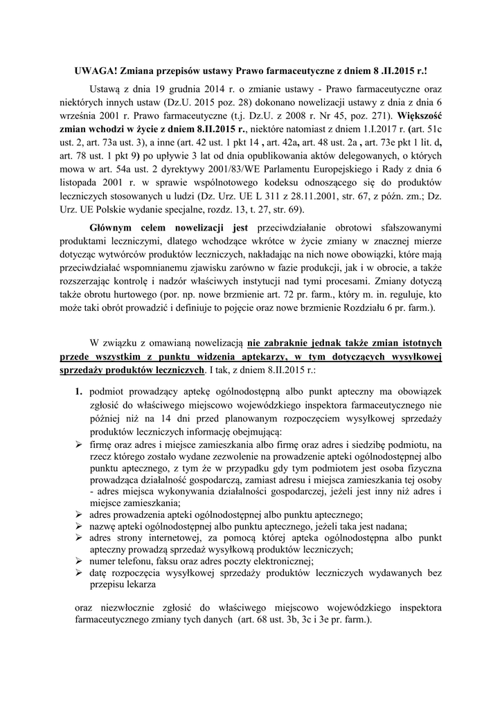 Zmiana przepisów ustawy Prawo farmaceutyczne z dniem 8 .II.2015 r.!