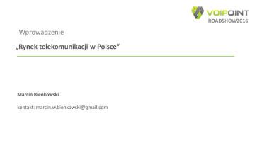 ROADSHOW2016 Wprowadzenie „Rynek telekomunikacji w Polsce” Marcin Bieńkowski kontakt: [email protected] Rynek telekomunikacyjny w Polsce • W 2014 r. łączna wartość polskiego rynku telekomunikacyjnego wyniosła 39,21 mld zł – spadek o 2,6%, głównie za sprawą telefonii stacjonarnej (12,7%) • Wzrost zanotował jedynie rynek usług dostępu do Internetu – wzrost przychodów o 11,5% • Wartość rynku Internetu w Polsce ukształtowała się na poziomie 5,1 mld zł. 90% gospodarstw domowych miało dostęp do sieci (13 mln abonentów) • Ponad 7,2 mln abonentów było podłączonych do Internetu za pośrednictwem usług stacjonarnego dostępu do sieci, a bisko 6 mln osób korzystało z dostępu mobilnego. • Wg wstępnych szacunków wartość rynku telekomunikacyjnego w Polsce w 2015 r. wyniosła 44,5 mld zł Na podstawie: UKE – Raport o stanie rynku telekomunikacyjnego w Polsce w 2014 roku ROADSHOW2016 Rynek telekomunikacyjny w Polsce ROADSHOW2016 „Z roku na rok zmniejsza się liczba użytkowników telefonii stacjonarnej, zwiększeniu uległa natomiast liczba osób korzystających z usługi VoIP.” źródło: UKE Struktura abonentów Internetu ze względu na wykorzystywaną technologię dostępową ROADSHOW2016 źródło: UKE Przepustowość łączy (I) ROADSHOW2016 Ponad 45% użytkowników korzystało z Internetu o przepustowości od 2 Mb/s do 10 Mb/s. Blisko 24% abonentów miało dostęp do sieci o szybkości od 10 Mb/s do 30 Mb/s. Liczba łączy o prędkości ponad 100 Mb/s w okresie od 2013 r. do 2014 r. wzrosła o 126%. Internet stacjonarny w Europie – Średnio w Unii Europejskiej 30,9% mieszkańców posiada dostęp do Internetu stacjonarnego. Penetracja w Dani i Holandii wynosi ponad 41%. W przypadku Polski penetracja w 2014 r. kształtowała się na poziomie 22,7% źródło: UKE Przepustowość łączy (II) ROADSHOW2016 Udział łączy według przepływności źródło: UKE Klienci instytucjonalni (I) ROADSHOW2016 Wg UKE wśród klientów instytucjonalnych najbardziej rozpowszechnioną usługą telekomunikacyjną jest telefonia komórkowa – korzysta z niej 97% firm. Dostęp do Internetu posiada 80% przedsiębiorstw. Telefonię stacjonarną wykorzystuje jedynie 30% firm. Jej udział w małych firmach jest niewielki. Wykorzystywana jest ona głównie w większych firmach i sektorze publicznym Połowa polskich firm (53%) wykorzystuje telefonię komórkową i dostęp do Internetu. Jedna czwarta przedsiębiorstw (24%) korzysta z trzech usług jednocześnie – telefonii stacjonarnej, telefonii komórkowej i Internetu. Jedna szósta firm (17%) korzysta tylko z telefonu komórkowego. Korzystanie z telekomunikacyjnych usług stacjonarnych (telefon i Internet) jest związane z wielkością przedsiębiorstwa – im większa firma, tym większy odsetek użytkowników. W przypadku telefonów komórkowych i Internetu mobilnego zależność jest odwrotna – mikrofirmy częściej są użytkownikami tych usług niż większe firmy. Klienci instytucjonalni (II) ROADSHOW2016 Wg raportu UKE, w sektorze klientów instytucjonalnych dominuje stacjonarny dostęp do Internetu – posiada go 72% ogółu firm korzystających z Sieci. 89% firm zatrudniających 50 i więcej pracowników, posiada stałe łącze. Dostęp mobilny jest używany znacznie rzadziej – jego użytkownicy stanowią 31% podmiotów z Internetem, częściej korzystają z niego mikrofirmy. Najczęstszym powodem posiadania Internetu mobilnego jest potrzeba korzystania z sieci poza siedzibą firmy (51%) oraz atrakcyjniejsza oferta w stosunku do Internetu stacjonarnego (47%). Internet w firmach jest narzędziem służącym głównie do zdobywania niezbędnych informacji związanych z działalnością (77%) oraz komunikacji z klientami (76%). W dużych firmach służy on także do komunikacji wewnętrznej. Dwa najważniejsze czynniki wyboru dostawcy Internetu stacjonarnego wśród klientów instytucjonalnych to: atrakcyjność cenowa oferty (58%) oraz prędkość łącza (49%). Zadowolenie klientów biznesowych z dostępu stacjonarnego jest wysokie – najwyżej oceniana jest stabilność połączenia, Prawie połowa (45%) badanych podmiotów byłaby gotowa zrezygnować z usługi Internetu stacjonarnego na rzecz mobilnego. Dotyczy to głównie najmniejszych firm, firmy średnie i duże nie deklarują dużej gotowości do takiej zmiany. Rynek rozwiązań VoIP (I) ROADSHOW2016 Wartość rynku VoIP w Polsce szacowana jest obecnie na ok. 350-450 mln zł. Usługi VoIP świadczone są użytkownikom zarówno w oparciu o własną sieć telekomunikacyjną, jak również za pośrednictwem sieci innych operatorów. Wg UKE w 2014 r. przychód operatorów telefonii IP z tytułu świadczenia usługi połączeń głosowych wyniósł 92,2 mln zł Wśród operatorów posiadających własną sieć dostępową największy udział pod względem liczby abonentów ma Orange (57,1%). Wśród firm świadczących usługi telefonii IP w oparciu o sieć innego operatora widać duże rozdrobnienie udziałów. Liderem jest Easycall.pl, który posiada 24,6% udziałów w rynku. Rynek rozwiązań VoIP (II) ROADSHOW2016 Udziały operatorów pod względem liczby abonentów Udziały operatorów pod względem liczby abonentów usług świadczonych we własnej sieci usług świadczonych w sieci dostępowej innego operatora źródło: UKE Rynek rozwiązań VoIP (III) ROADSHOW2016 Wg UKE klienci instytucjonalni wskazują trzy zasadnicze powody korzystania z telefonu stacjonarnego – przekonanie, że nadaje on większej wiarygodności firmie (60%), utrzymywanie linii z przyzwyczajenia (40%) oraz posiadanie telefonu stacjonarnego w pakiecie z Internetem (35)%. Średnio na jedną firmę przypada 1,39 linii telefonicznych, jednak liczba ta zdecydowanie zależy od wielkości podmiotu. Większość mikroprzedsiębiorstw korzysta z jednej linii (91%), w firmach zatrudniających 10-49 pracowników odsetek ten wynosi - 63%, a w przedsiębiorstwach zatrudniają