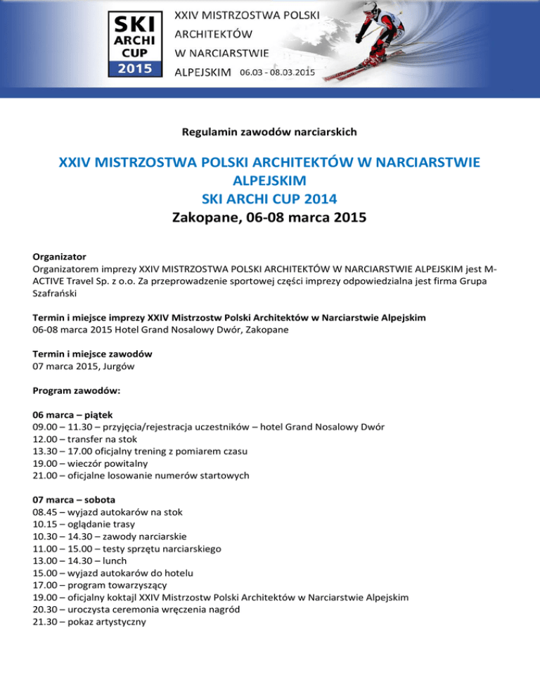 Regulamin zawodów narciarskich XXIV MISTRZOSTWA POLSKI ARCHITEKTÓW W NARCIARSTWIE ALPEJSKIM SKI ARCHI CUP 2014 Zakopane, 06-08 marca 2015 Organizator Organizatorem imprezy XXIV MISTRZOSTWA POLSKI ARCHITEKTÓW W NARCIARSTWIE ALPEJSKIM jest MACTIVE Travel Sp. z o.o. Za przeprowadzenie sportowej części imprezy odpowiedzialna jest firma Grupa Szafrański Termin i miejsce imprezy XXIV Mistrzostw Polski Architektów w Narciarstwie Alpejskim 06-08 marca 2015 Hotel Grand Nosalowy Dwór, Zakopane Termin i miejsce zawodów 07 marca 2015, Jurgów Program zawodów: 06 marca – piątek 09.00 – 11.30 – przyjęcia/rejestracja uczestników – hotel Grand Nosalowy Dwór 12.00 – transfer na stok 13.30 – 17.00 oficjalny trening z pomiarem czasu 19.00 – wieczór powitalny 21.00 – oficjalne losowanie numerów startowych 07 marca – sobota 08.45 – wyjazd autokarów na stok 10.15 – oglądanie trasy 10.30 – 14.30 – zawody narciarskie 11.00 – 15.00 – testy sprzętu narciarskiego 13.00 – 14.30 – lunch 15.00 – wyjazd autokarów do hotelu 17.00 – program towarzyszący 19.00 – oficjalny koktajl XXIV Mistrzostw Polski Architektów w Narciarstwie Alpejskim 20.30 – uroczysta ceremonia wręczenia nagród 21.30 – pokaz artystyczny 08 marca – niedziela 08.00 – 09.30 – śniadanie dla gości hotelowych 09.00 – 10.00 – wykwaterowanie z pokojów 10.30 – 13.00 – Akademia Narciarska 14.00 – 15.00 – wyjazdy uczestników Zgłoszenia: tylko za pośrednictwem formularza na stronie skiarchicup.pl Liczba miejsc jest ograniczona. Organizator zastrzega sobie prawo do nieprzyjęcia zgłoszenia. O przyjęciu na listę startujących decyduje kolejność zgłoszeń. Warunki uczestnictwa: W Mistrzostwach mogą wziąć udział tylko amatorzy, czynni zawodowo architekci, którzy nie mają jakiegokolwiek zawodowego kontaktu z tą dyscypliną sportu. Każdy uczestnik zawodów akceptując regulamin, jednocześnie oświadcza o braku przeciwwskazań zdrowotnych do uprawiania narciarstwa. Każdy uczestnik zawodów startuje na własną odpowiedzialność. Organizatorzy zalecają wykupienie ubezpieczenia od NNW. Opłata startowa Opłata startowa wynosi 80 zł. Wpłaty na poczet opłaty startowej dokonywać należy przelewem na konto podając w tytule: „SKI ARCHI CUP”, imię i nazwisko. M-Active Travel Sp. z o.o. ul. Wenedów 11 61-614 Poznań 62 1090 1463 0000 0001 1106 0229 Wpłata opłaty startowej do 14 dni od daty rejestracji. Dokonanie wpłaty jest równoznaczne z potwierdzeniem uczestnictwa w zawodach. W przypadku braku wpłaty w wyznaczonym terminie, organizator zastrzega sobie prawo do wykreślenia zgłoszenia. Opłata startowa zawiera: uczestnictwo w zawodach - slalom gigant start w slalomie równoległym wyżywienie karnet na wyciągi w piątek oraz sobotę udział w programie towarzyszącym Opłata nie zawiera: ubezpieczenia od NNW Rezygnacja ze startu W przypadku rezygnacji ze startu w zawodach do 10 dni przez imprezą istnieje możliwość zwrotu opłaty startowej. W przypadku rezygnacji w późniejszym terminie, opłata przepada. Numery startowe Losowanie numerów startowych odbywa się w piątek. Odbiór koszulek startowych możliwe będzie w biurze zawodów bezpośrednio po losowaniu oraz dnia następnego, u przedstawicieli Organizatora. Sposób przeprowadzenia zawodów Zawody rangi Mistrzostw Polski przeprowadzone zostaną w określonych kategoriach wiekowych w slalomie gigancie. Start w slalomie gigancie odbywa się według wylosowanej kolejności numerów startowych w poszczególnych kategoriach. Slalom równoległy jest imprezą towarzyszącą. Odbywa się z podziałem na kategorię kobiet i mężczyzn. Grupy wiekowe Mistrzostw Polski Architektów w Narciarstwie Alpejskim slalom gigant: - mężczyźni open, mężczyźni 35+, mężczyźni 45+, mężczyźni 55+ - kobiety open, kobiety 35+, kobiety 45+ snowboard gigant: - mężczyźni open, mężczyźni 45+ - kobiety open W kategorii OPEN klasyfikowani będą wszyscy uczestnicy Imprezy. Kolejność startu Pierwszy i drugi przejazd: snowboard: kobiety open, snowboard mężczyźni 45+, snowboard mężczyźni open slalom gigant: kobiety 45+, kobiety 35+, kobiety open, mężczyźni 55+, mężczyźni 45+, mężczyźni 35+, mężczyźni open. Drugi przejazd w każdej kategorii odbywa się w odwrotnej kolejności do zajętego miejsca po pierwszym przejeździe. Klasyfikacja Mistrzostw Polski Architektów w Narciarstwie Alpejskim O zwycięstwie i kolejności w poszczególnych kategoriach decydować będzie suma czasów dwóch prawidłowo ukończonych przejazdów. Nagrody puchary, medale i dyplomy, nagrody rzeczowe za pierwsze trzy miejsca w każdej kategorii Mistrzostw puchary i dyplomy w klasyfikacji slalomu równoległego Dekoracja zwycięzców w slalomie równoległym odbędzie się w piątkowy wieczór. Główna dekoracja Mistrzostw Polski Architektów w Narciarstwie Alpejskim odbędzie się podczas sobotniego koktajlu. Biuro, sędziowie i kierownictwo zawodów Przez cały czas trwania imprezy oraz zawodów, w przypadku jakichkolwiek pytań lub wątpliwości do dyspozycji uczestników będą przedstawiciele organizatorów. Zawody narciarskie zostaną przeprowadzone przez przedstawicieli Tatrzańskiego Związku Narciarskiego. Za prawidłowy przebieg zawodów odpowiedzialny będzie sędzia, który będzie rozstrzygać ewentualne kwestie sporne. Postanowienia ogólne Organizator zastrzega sobie prawo decydowania o wszystkich elementach związanych z przeprowadzaną imprezą nie objętych niniejszym regulaminem.