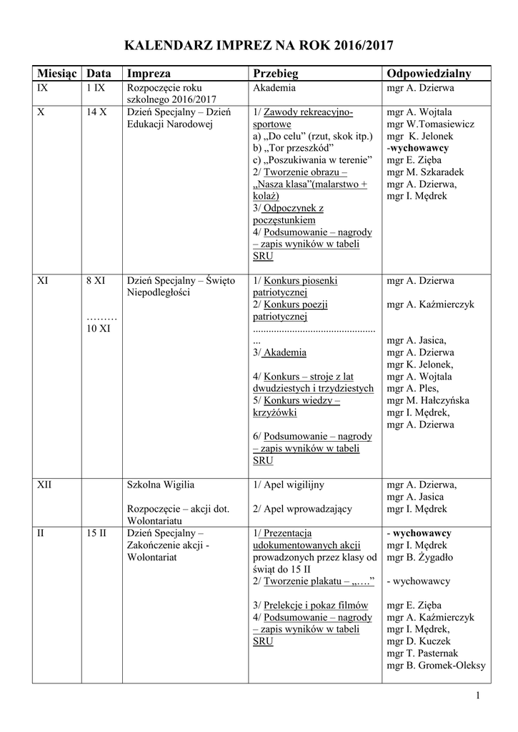 KALENDARZ IMPREZ NA ROK 2016/2017 Miesiąc Data Impreza Przebieg Odpowiedzialny IX 1 IX Akademia mgr A. Dzierwa X 14 X Rozpoczęcie roku szkolnego 2016/2017 Dzień Specjalny – Dzień Edukacji Narodowej 1/ Zawody rekreacyjnosportowe a) „Do celu” (rzut, skok itp.) b) „Tor przeszkód” c) „Poszukiwania w terenie” 2/ Tworzenie obrazu – „Nasza klasa”(malarstwo + kolaż) 3/ Odpoczynek z poczęstunkiem 4/ Podsumowanie – nagrody – zapis wyników w tabeli SRU mgr A. Wojtala mgr W.Tomasiewicz mgr K. Jelonek -wychowawcy mgr E. Zięba mgr M. Szkaradek mgr A. Dzierwa, mgr I. Mędrek XI 8 XI Dzień Specjalny – Święto Niepodległości 1/ Konkurs piosenki patriotycznej 2/ Konkurs poezji patriotycznej ............................................... ... 3/ Akademia mgr A. Dzierwa ……… 10 XI 4/ Konkurs – stroje z lat dwudziestych i trzydziestych 5/ Konkurs wiedzy – krzyżówki mgr A. Kaźmierczyk mgr A. Jasica, mgr A. Dzierwa mgr K. Jelonek, mgr A. Wojtala mgr A. Ples, mgr M. Hałczyńska mgr I. Mędrek, mgr A. Dzierwa 6/ Podsumowanie – nagrody – zapis wyników w tabeli SRU XII Szkolna Wigilia 1/ Apel wigilijny 2/ Apel wprowadzający II Rozpoczęcie – akcji dot. Wolontariatu Dzień Specjalny – Zakończenie akcji Wolontariat 15 II mgr A. Dzierwa, mgr A. Jasica mgr I. Mędrek 1/ Prezentacja udokumentowanych akcji prowadzonych przez klasy od świąt do 15 II 2/ Tworzenie plakatu – „….” - wychowawcy mgr I. Mędrek mgr B. Żygadło 3/ Prelekcje i pokaz filmów 4/ Podsumowanie – nagrody – zapis wyników w tabeli SRU mgr E. Zięba mgr A. Kaźmierczyk mgr I. Mędrek, mgr D. Kuczek mgr T. Pasternak mgr B. Gromek-Oleksy - wychowawcy 1 V 2V Święto Konstytucji 3 Maja 1/ Akademia mgr M. Hałczyńska mgr I. Balon V/VI 31V Festiwal Sztuki - 1/ Prezentacje artystyczne i podsumowanie osiągnięć artystycznych – 1 godz. lekcyjna mgr A. Dzierwa Festiwal Nauki Dzień zabawy i sportu 1/ Prezentacja najciekawszych projektów – „Subkultury” i podsumowanie osiągnięć uczniów w dziedzinie nauki (konkursy, olimpiady) 2/ Zabawa - „Subkultury” i zabawy sportowe 3/ Piknik 1/ Zakończenie dla klas 1 i 2 mgr A. Jasica, mgr J. Woźniak 1 VI 22 VI Zakończenie roku szkolnego 2/ Pożegnanie klas 3 mgr K. Jelonek, mgr W. Skiba wychowawcy mgr A. Kaźmierczyk, mgr A. Wojtala - wychowawcy klas trzecich 2