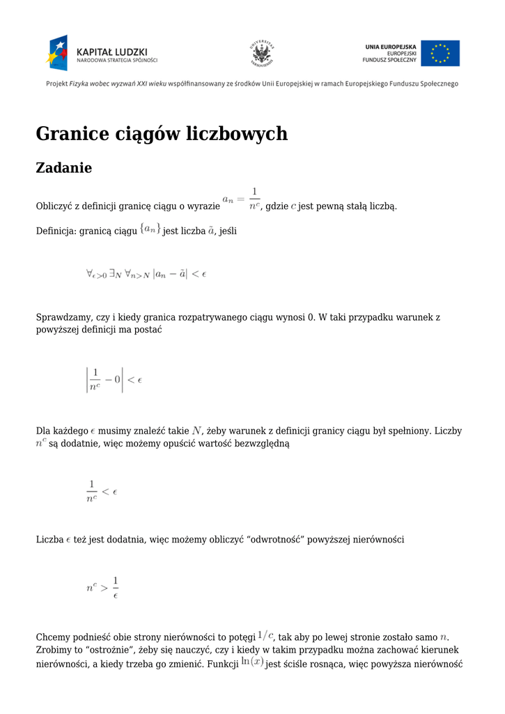Granice ciągów liczbowych Zadanie Obliczyć z definicji granicę ciągu o wyrazie Definicja: granicą ciągu , gdzie jest pewną stałą liczbą. jest liczba , jeśli Sprawdzamy, czy i kiedy granica rozpatrywanego ciągu wynosi 0. W taki przypadku warunek z powyższej definicji ma postać Dla każdego musimy znaleźć takie , żeby warunek z definicji granicy ciągu był spełniony. Liczby są dodatnie, więc możemy opuścić wartość bezwzględną Liczba też jest dodatnia, więc możemy obliczyć “odwrotność” powyższej nierówności Chcemy podnieść obie strony nierówności to potęgi , tak aby po lewej stronie zostało samo . Zrobimy to “ostrożnie”, żeby się nauczyć, czy i kiedy w takim przypadku można zachować kierunek nierówności, a kiedy trzeba go zmienić. Funkcji jest ściśle rosnąca, więc powyższa nierówność jest zachowana, jeśli policzymy logarytm z każdej z jej stron Następnym krokiem jest podzieleniu obu stron nierówności prze . Musimy rozważyć osobno przypadek każdego znaku stałej : W taki przypadku znak nierówności się nie zmienia Korzystają znów z monotoniczności funkcji Każda liczba dostajemy spełniająca warunek może być użyta w definicji granicy ciągu. : W taki przypadku znak nierówności się zmienia co po analogicznych jak uprzednio przekształceniach daje Nie ma więc takiej liczby , dla której byłby spełniony warunek z definicji granicy ciągu. Pokazaliśmy, że dla dodatnich ciąg ma granicę równą 0. Dla ciąg też ma granicę, ale tym razem wynosi ona 1. Dowód jest niezwykle prosty: dla każdy wyraz ciąg jest równy . Jest to ciąg stały, dla którego dowolnych i . i warunek z definicji granicy ciągu jest spełniony dla Dla ujemnych ciąg nie ma granicy. Nie wydaje się, żeby celowe było przeprowadzanie rygorystycznego dowodu. Znaleźć granice następujących ciągów Zadanie Zadanie Zadanie Ta granica nie istnieje, ponieważ , czyli Zadanie Ten ostatni wynik można udowodnić w sposób następujący: Zadanie Zadanie , . Zadanie Obliczyć granicę dla Wyrażenie pod pierwiastkiem spełnia warunek Prawa nierówność wynika z tego, że ciąg Możemy zdefiniować dwa ciągi, i jest malejący. , które spełniają warunki Granice tych nowych ciągów są znane z wykładu. Dla każdej stałej dodatniej Korzystając z twierdzeniach o trzech ciągach dostajemy mamy . Liczba Eulera Omawiamy ciąg o wyrazach postaci Podajemy wartości liczbowe kilku pierwszych wyrazów Następnie definiujemy liczbę Eulera Jest to liczba niewymierna, której rozwinięcie dziesiętne zaczyna się od Robimy kilka prostych zadań, w których pojawia się liczba Zadanie Zadanie Gramy razy, za każdym razem mając prawdopodobieństwo wygranej równe prawdopodobieństwo, że nie wygramy ani razu? Przy bardzo dużej liczbie prób, to prawdopodobieństwo dąży do . Jakie jest . Zadanie Lokata jest oprocentowana na %. Jeśli kapitalizacja jest po roku, oszczędności po roku będą razy większe niż początkowy kapitał. Jak to się zmienia ze zmianą okresu kapitalizacji, jeśli oprocentowanie przy -krotnej kapitalizacji wynosi ? Przy -krotnej kapitalizacji, po n takich okresach (czyli po roku) oszczędności wzrosną razy. Jaka jest granica efektywnego oprocentowania, przy coraz częstszej kapitalizacji? Musimy obliczyć Warto zilustrować to przykładami liczbowymi. To pokazuje, że częstość kapitalizacji nie ma istotnego znaczenia przy niskich stopach procentowych (wzrost z 5% tylko do 5.13%, a z 10% do około 10.5%). Dopiero przy stopie procentowej 20%, (nieskończenie) częsta kapitalizacja daje istotny efekt: efektywna stopa procentowa wzrasta z 20% do nieco ponad 22%. Nominalna stopa procentowa 40% rośnie efektywnie już do ponad 49%. Zadanie Ze względów bardzo praktycznych warto przedyskutować różnice przy spłacaniu kredytów w zależności od rodzaju rat. Popularne są dwa rodzaje rat: stałe raty i raty malejące przy stałej spłacie kapitału. Oprocentowanie kredytu w skali roku wynosi . Raty są płacone co miesiąc, a kredyt w wysokości należy spłacić w ratach. Obliczenia dla rat malejących są proste. Pierwsza rata wynosi Przy drugiej racie odsetki płacimy tylko od niespłaconej części kwoty kredytu Rata numer wynosi Obliczamy całkowitą spłatę , jako sumę poszczególnych rat Korzystając ze wzoru na sumę szeregu arytmetycznego, otrzymujemy Obliczenia dla przypadku stałych rat są bardziej skomplikowane. Na początek trzeba wyliczyć wysokość poszczególnych rat. -ta rata jest sumą -tej części kwoty kredytu i oprocentowania obliczonego od jeszcze niespłaconej kwoty Stałość wysokości rat oznacza, że To daje -szą ratę kapitałową w funkcji -tej raty kapitałowej: Iterując ten wzór dostajemy Suma wszystkich rat kapitałowych musi dać całą kwotę kredytu Kolejne raty kapitałowe tworzą ciąg geometryczny z pierwszym wyrazem równym kolejnych wyrazów równym i z ilorazem . Korzystamy ze wzoru na sumę ciągu geometrycznego To pozwala obliczyć pierwszą ratę kapitałową i pierwszą pełną ratę razem z odsetkami Wszystkie raty są z definicji równe, więc ich suma jest bardzo prosta do obliczenia Porównujemy teraz sumę wszystkich rat w obu rodzajach kredytu. Ich różnica wynosi Dla małej liczby rat dostajemy odpowiednio 1 0 2 3 Różnica między i jest nieujemna i wiodące wyrazy są drugiego rzędu w . Zwracając kredyt w równych ratach zapłacimy więcej niż spłacając ten sam kredyt przy takiej samej stopie procentowej ale w ratach malejących. Różnica nie jest zbyt istotna w przypadku niezbyt dużych wartości i . Jeśli natomiast lub nie jest małe, różnica może być bardzo znacząca. Zróbmy obliczenia dla kredytu hipotecznego o stopie procentowe 6% w skali roku udzielonego na 30 lat. Mamy więc i . Wyliczamy Różnica to ponad 25% kwoty pożyczki. Dla stopy procentowej równej 9% w skali roku, ta różnica wzrasta do około 55% kwoty pożyczki ( , ). t