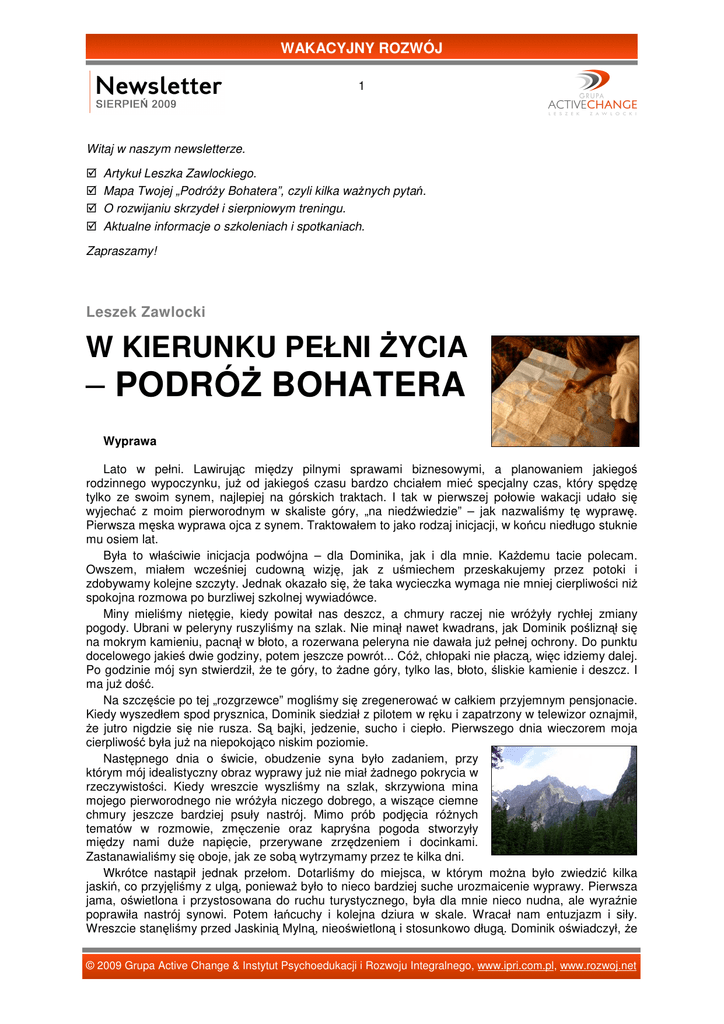 WAKACYJNY ROZWÓJ 1 Witaj w naszym newsletterze. Artykuł Leszka Zawlockiego. Mapa Twojej „Podróży Bohatera”, czyli kilka ważnych pytań. O rozwijaniu skrzydeł i sierpniowym treningu. Aktualne informacje o szkoleniach i spotkaniach. Zapraszamy! Leszek Zawlocki W KIERUNKU PEŁNI ŻYCIA – PODRÓŻ BOHATERA Wyprawa Lato w pełni. Lawirując między pilnymi sprawami biznesowymi, a planowaniem jakiegoś rodzinnego wypoczynku, już od jakiegoś czasu bardzo chciałem mieć specjalny czas, który spędzę tylko ze swoim synem, najlepiej na górskich traktach. I tak w pierwszej połowie wakacji udało się wyjechać z moim pierworodnym w skaliste góry, „na niedźwiedzie” – jak nazwaliśmy tę wyprawę. Pierwsza męska wyprawa ojca z synem. Traktowałem to jako rodzaj inicjacji, w końcu niedługo stuknie mu osiem lat. Była to właściwie inicjacja podwójna – dla Dominika, jak i dla mnie. Każdemu tacie polecam. Owszem, miałem wcześniej cudowną wizję, jak z uśmiechem przeskakujemy przez potoki i zdobywamy kolejne szczyty. Jednak okazało się, że taka wycieczka wymaga nie mniej cierpliwości niż spokojna rozmowa po burzliwej szkolnej wywiadówce. Miny mieliśmy nietęgie, kiedy powitał nas deszcz, a chmury raczej nie wróżyły rychłej zmiany pogody. Ubrani w peleryny ruszyliśmy na szlak. Nie minął nawet kwadrans, jak Dominik pośliznął się na mokrym kamieniu, pacnął w błoto, a rozerwana peleryna nie dawała już pełnej ochrony. Do punktu docelowego jakieś dwie godziny, potem jeszcze powrót... Cóż, chłopaki nie płaczą, więc idziemy dalej. Po godzinie mój syn stwierdził, że te góry, to żadne góry, tylko las, błoto, śliskie kamienie i deszcz. I ma już dość. Na szczęście po tej „rozgrzewce” mogliśmy się zregenerować w całkiem przyjemnym pensjonacie. Kiedy wyszedłem spod prysznica, Dominik siedział z pilotem w ręku i zapatrzony w telewizor oznajmił, że jutro nigdzie się nie rusza. Są bajki, jedzenie, sucho i ciepło. Pierwszego dnia wieczorem moja cierpliwość była już na niepokojąco niskim poziomie. Następnego dnia o świcie, obudzenie syna było zadaniem, przy którym mój idealistyczny obraz wyprawy już nie miał żadnego pokrycia w rzeczywistości. Kiedy wreszcie wyszliśmy na szlak, skrzywiona mina mojego pierworodnego nie wróżyła niczego dobrego, a wiszące ciemne chmury jeszcze bardziej psuły nastrój. Mimo prób podjęcia różnych tematów w rozmowie, zmęczenie oraz kapryśna pogoda stworzyły między nami duże napięcie, przerywane zrzędzeniem i docinkami. Zastanawialiśmy się oboje, jak ze sobą wytrzymamy przez te kilka dni. Wkrótce nastąpił jednak przełom. Dotarliśmy do miejsca, w którym można było zwiedzić kilka jaskiń, co przyjęliśmy z ulgą, ponieważ było to nieco bardziej suche urozmaicenie wyprawy. Pierwsza jama, oświetlona i przystosowana do ruchu turystycznego, była dla mnie nieco nudna, ale wyraźnie poprawiła nastrój synowi. Potem łańcuchy i kolejna dziura w skale. Wracał nam entuzjazm i siły. Wreszcie stanęliśmy przed Jaskinią Mylną, nieoświetloną i stosunkowo długą. Dominik oświadczył, że © 2009 Grupa Active Change & Instytut Psychoedukacji i Rozwoju Integralnego, www.ipri.com.pl, www.rozwoj.net WAKACYJNY ROZWÓJ 2 koniecznie chce wejść. Niestety nie mieliśmy żadnego przenośnego źródła światła (wcześniej jakiś tutejszy usiłował wcisnąć nam latareczkę za „pindziesiont złotych”, ale wydawało mi się to naciąganiem ceprów). Staliśmy więc chwilę przed jaskinią, aż pojawiła się jakaś sympatyczna parka studentów. Zerknęli do środka, wahając się, czy warto się ubłocić, kiedy mój syn zapytał, czy mają latarkę. Kiedy padła odpowiedź twierdząca, zaproponowaliśmy eskapadę w głąb skały we czwórkę. I zaczęło się. Latarka była tylko jedna, nas czworo, sporo wody po deszczach i ciasne, ciemne korytarze. Przygoda. Po pół godzinie byliśmy po drugiej stronie – brudni, przemoczeni i absolutnie szczęśliwi. Choć później było jeszcze kilka kryzysów, tego dnia Dominik maszerował szybciej ode mnie, a oczy błyszczały mu z przejęcia. Nie miał powodów, żeby wlec nogę za nogą – jeszcze tyle było do odkrycia! Doświadczenie rozwoju Przytoczyłem ową osobistą historię wycieczki z synem, ponieważ dobrze ilustruje pewien proces. Proces ten, w coachingu znany również jako „Podróż Bohatera”*, jest metaforą wielu naszych wysiłków w kierunku zmiany różnych aspektów życia. Jest to schemat uniwersalny dla każdego człowieka każdej epoki. Tak jak mitologiczny bohater (który zwykle na początku wcale nie jest żadnym „Bohaterem”) decyduje się wyjść ze swego domu, pokonać trudności, znaleźć skarb (tudzież uwolnić księżniczkę) oraz żyć długo i szczęśliwie po powrocie – tak i my decydujemy się czasem wyjść poza swój aktualny stan, zmierzyć się z problemami, pokonać swoje słabości i nabrać doświadczenia. Doświadczenia, które sprawi, że czujemy się w czymś kompetentni, które nas określi. Mam doświadczenie chodzenia do szkoły i uczenia się, co określa mnie jako ucznia. Mam doświadczenie warsztatowej pracy z ludźmi, co określa mnie jako trenera. Mam doświadczenie obrony pracy magisterskiej – mogę się tytułować. Każde doświadczenie w jakiś sposób poszerza czy pogłębia nasze „ja”. I tak wiele zmian, które wprowadzamy, aby zbudować pomyślną przyszłość, nosi znamiona pewnej „podróży bohatera”. Począwszy od tego, że „wędrówką jedną życie jest człowieka...” – jak śpiewa Stare Dobre Małżeństwo, aż po codzienne decyzje, w których ujawnia się nasza tożsamość i charakter. Umiejętność spojrzenia na swoją egzystencję z perspektywy wyzwania, czy też powołania, podnosi poziom motywacji, pomaga uporać się z trudnościami i prowadzi do tego, co określam w tytule jako „pełnia życia”. Wewnętrzny boh