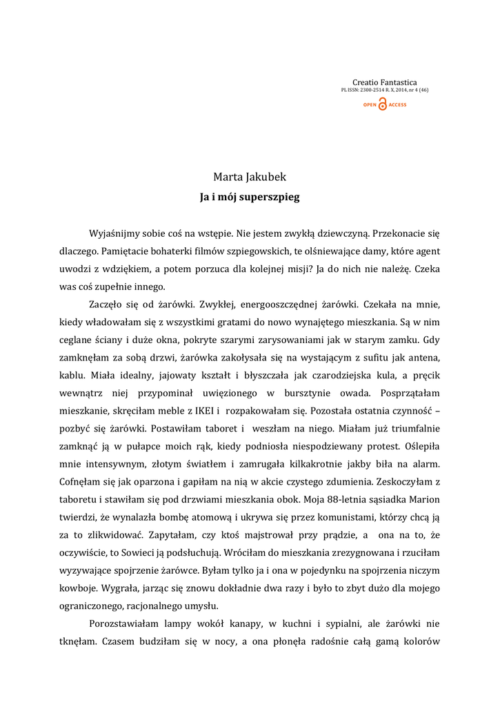 Creatio Fantastica PL ISSN: 2300-2514 R. X, 2014, nr 4 (46) Marta Jakubek Ja i mój superszpieg Wyjaśnijmy sobie coś na wstępie. Nie jestem zwykłą dziewczyną. Przekonacie się dlaczego. Pamiętacie bohaterki filmów szpiegowskich, te olśniewające damy, które agent uwodzi z wdziękiem, a potem porzuca dla kolejnej misji? Ja do nich nie należę. Czeka was coś zupełnie innego. Zaczęło się od żarówki. Zwykłej, energooszczędnej żarówki. Czekała na mnie, kiedy władowałam się z wszystkimi gratami do nowo wynajętego mieszkania. Są w nim ceglane ściany i duże okna, pokryte szarymi zarysowaniami jak w starym zamku. Gdy zamknęłam za sobą drzwi, żarówka zakołysała się na wystającym z sufitu jak antena, kablu. Miała idealny, jajowaty kształt i błyszczała jak czarodziejska kula, a pręcik wewnątrz niej przypominał uwięzionego w bursztynie owada. Posprzątałam mieszkanie, skręciłam meble z IKEI i rozpakowałam się. Pozostała ostatnia czynność – pozbyć się żarówki. Postawiłam taboret i weszłam na niego. Miałam już triumfalnie zamknąć ją w pułapce moich rąk, kiedy podniosła niespodziewany protest. Oślepiła mnie intensywnym, złotym światłem i zamrugała kilkakrotnie jakby biła na alarm. Cofnęłam się jak oparzona i gapiłam na nią w akcie czystego zdumienia. Zeskoczyłam z taboretu i stawiłam się pod drzwiami mieszkania obok. Moja 88-letnia sąsiadka Marion twierdzi, że wynalazła bombę atomową i ukrywa się przez komunistami, którzy chcą ją za to zlikwidować. Zapytałam, czy ktoś majstrował przy prądzie, a ona na to, że oczywiście, to Sowieci ją podsłuchują. Wróciłam do mieszkania zrezygnowana i rzuciłam wyzywające spojrzenie żarówce. Byłam tylko ja i ona w pojedynku na spojrzenia niczym kowboje. Wygrała, jarząc się znowu dokładnie dwa razy i było to zbyt dużo dla mojego ograniczonego, racjonalnego umysłu. Porozstawiałam lampy wokół kanapy, w kuchni i sypialni, ale żarówki nie tknęłam. Czasem budziłam się w nocy, a ona płonęła radośnie całą gamą kolorów niczym kula dyskotekowa, rzucając na ściany refleksy świateł, czułam się jak w planetarium. Nie wiedziałam, o co jej chodzi. To znaczy, czasami wiedziałam. To dzięki niej wpadłam na pomysł narysowania komiksu o Marsjance, która hipnotyzuje mężczyzn jednym pocałunkiem i podporządkowuje swojej woli. Żarówka zapaliła się raz na rubinowo i kiedy wpatrywałam się w nią długo, przyszedł mi do głowy ten pomysł. Po to przecież przyjechałam do Nowego Jorku - tworzyć komiksy i zbić fortunę - jak Frank Miller. Rysowałam bez wytchnienia, a żarówka zmieniała kolor, w zależności, jakie tło akurat rysowałam. Marion wrzeszczała na mnie, że nawet Stalin widzi takie światła ze swojej siedziby na Kremlu i grozi to jej bezpieczeństwu. Bałam się, że dostanie zawału, więc kupiłam grube zasłony. Zaniosłam komiks do agencji i codziennie, uparcie czekałam w poczekalni na dyrektora. Nie ufałam sekretarce na tyle, by zostawić jej moje dzieło, poza tym po tygodniu nazwała mnie natrętną wszą. Po jakimś czasie przyniosłam jej komiks o wszy, która mieszka pod pachą wrednej sekretarki. Spojrzała na mnie wilkiem, po czym sięgnęła po słuchawkę, żeby mnie umówić. Dyrektor to wąsaty, przyjemny tłuścioch, który zawsze przy biurku trzyma Snickersa. Rano Snickers, po południu Snickers, wieczorem Snickers, pewnie też myje nim sobie zęby. Ale docenił mnie, kupił komiks, dał zlecenie na kolejny i wręczył pierwszą wypłatę. Połowę przepuściłam na nocne świętowanie z przyjaciółkami, zalałam się w trupa i obudziłam rano na podejrzanej stacji kolejowej na pustkowiu przekonana, że UFO jest prawdziwe i właśnie mnie porwało. Żarówka odzywała się do mnie rzadziej. Kiedy miałam z czymś problem, znowu budziła mnie w nocy tańcem kolorów i wtedy życie stawało się lepsze. Był z niej raczej ugodowy lokator. W końcu poznałam jego. Wychodziłam ze spotkania od Pana Snickersa, mijałam już sekretarkę i zmierzałam do schodów. Facet pojawił się znikąd, wpadł na mnie, zaczął strzelać z karabinu i kazał wszystkim paść na ziemię. Wpadł do gabinetu dyrektora i zaryglował się w środku. W ślad za nim przybył drugi, kopniakiem godnym Conana Barbarzyńcy rozwalił drzwi i dwoma strzałami w głowę zabrał tamtego ze świata żywych. Za oknami wyły syreny, kroki bębniły zewsząd jak echo. Nieznajomy schował spluwę, rozejrzał się czujnie, uciekł przejściem przeciwpożarowym i tyle go widziałam. Policjanci znaleźli jedynie ciało, które po sobie zostawił. Pan Snickers doznał nagłego skoku poziomu cukru i trafił do szpitala, a sekretarka złamała sobie dwa tipsy. Zaś mnie tylko wysłuchali - opowiedziałam, co się stało i puścili mnie do domu. Serce waliło mi w piersi jak dzwon i uspokoiłam się dopiero, kiedy zamknęłam drzwi na klucz i usiadłam na własnej kanapie. Żarówka przyglądała mi się z ciekawością. Ktoś zapukał do drzwi. Otworzyłam je i stanęłam twarzą w twarz z nieznajomym. Zajęło mi chwilę, żeby go rozpoznać, w trakcie strzelaniny nie zdążyłam mu się nawet przyjrzeć. A był boski jak Apollo. Wysoki, brunet, ta wyniosłość czająca się w niebieskich jak niebo oczach. Nic, tylko rodzić takiemu jego własne miniaturki. Ale żarówce się nie spodobał. Zaczęła rozrabiać, spluwać iskrami światła i wywijać harce na kablu. Walnęłam w nią gazetą i przestała. Skupiłam znów uwagę na moim obiekcie zainteresowania. Idealna postura, skrojony garnitur (no, mógłby mieć szersze ramiona), choć jego dołeczki w policzkach robiły wrażenie. Zapytał o torbę, którą miałam przy sobie na spotkaniu z dyrektorem. Poprosiłam go grzecznie o nakaz, a on na to, że może wejść do środka bez mojego pozwolenia, więc lepiej bym dała mu torbę dobrowolnie. Staliśmy w drzwiach z dziesięć minut i częstow