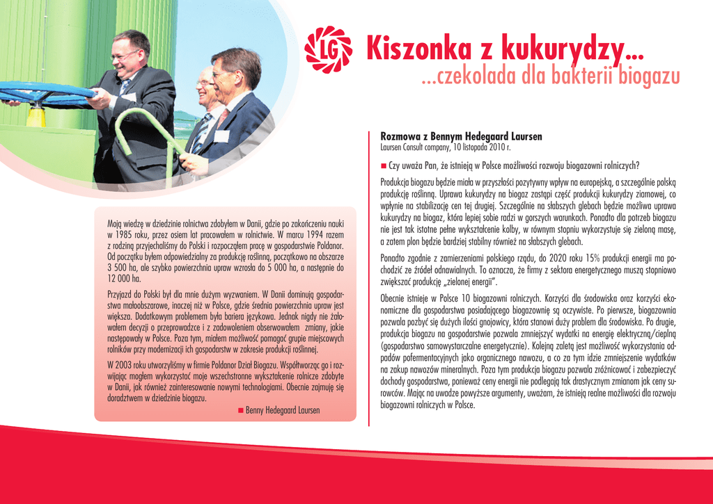 Kiszonka z kukurydzy... ...czekolada dla bakterii biogazu Rozmowa z Bennym Hedegaard Laursen Laursen Consult company, 10 listopada 2010 r. Czy uważa Pan, że istnieją w Polsce możliwości rozwoju biogazowni rolniczych? Moją wiedzę w dziedzinie rolnictwa zdobyłem w Danii, gdzie po zakończeniu nauki w 1985 roku, przez osiem lat pracowałem w rolnictwie. W marcu 1994 razem z rodziną przyjechaliśmy do Polski i rozpocząłem pracę w gospodarstwie Poldanor. Od początku byłem odpowiedzialny za produkcję roślinną, początkowo na obszarze 3 500 ha, ale szybko powierzchnia upraw wzrosła do 5 000 ha, a następnie do 12 000 ha. Przyjazd do Polski był dla mnie dużym wyzwaniem. W Danii dominują gospodarstwa małoobszarowe, inaczej niż w Polsce, gdzie średnia powierzchnia upraw jest większa. Dodatkowym problemem była bariera językowa. Jednak nigdy nie żałowałem decyzji o przeprowadzce i z zadowoleniem obserwowałem zmiany, jakie następowały w Polsce. Poza tym, miałem możliwość pomagać grupie miejscowych rolników przy modernizacji ich gospodarstw w zakresie produkcji roślinnej. W 2003 roku utworzyliśmy w firmie Poldanor Dział Biogazu. Współtworząc go i rozwijając mogłem wykorzystać moje wszechstronne wykształcenie rolnicze zdobyte w Danii, jak również zainteresowanie nowymi technologiami. Obecnie zajmuję się doradztwem w dziedzinie biogazu. Benny Hedegaard Laursen Produkcja biogazu będzie miała w przyszłości pozytywny wpływ na europejską, a szczególnie polską produkcję roślinną. Uprawa kukurydzy na biogaz zastąpi część produkcji kukurydzy ziarnowej, co wpłynie na stabilizację cen tej drugiej. Szczególnie na słabszych glebach będzie możliwa uprawa kukurydzy na biogaz, która lepiej sobie radzi w gorszych warunkach. Ponadto dla potrzeb biogazu nie jest tak istotne pełne wykształcenie kolby, w równym stopniu wykorzystuje się zieloną masę, a zatem plon będzie bardziej stabilny również na słabszych glebach. Ponadto zgodnie z zamierzeniami polskiego rządu, do 2020 roku 15% produkcji energii ma pochodzić ze źródeł odnawialnych. To oznacza, że firmy z sektora energetycznego muszą stopniowo zwiększać produkcję „zielonej energii”. Obecnie istnieje w Polsce 10 biogazowni rolniczych. Korzyści dla środowiska oraz korzyści ekonomiczne dla gospodarstwa posiadającego biogazownię są oczywiste. Po pierwsze, biogazownia pozwala pozbyć się dużych ilości gnojowicy, która stanowi duży problem dla środowiska. Po drugie, produkcja biogazu na gospodarstwie pozwala zmniejszyć wydatki na energię elektryczną/cieplną (gospodarstwo samowystarczalne energetycznie). Kolejną zaletą jest możliwość wykorzystania odpadów pofermentacyjnych jako organicznego nawozu, a co za tym idzie zmniejszenie wydatków na zakup nawozów mineralnych. Poza tym produkcja biogazu pozwala zróżnicować i zabezpieczyć dochody gospodarstwa, ponieważ ceny energii nie podlegają tak drastycznym zmianom jak ceny surowców. Mając na uwadze powyższe argumenty, uważam, że istnieją realne możliwości dla rozwoju biogazowni rolniczych w Polsce. rady przekazałby Pan rolnikom, którzy chcieliby rozpocząć budowę biogazowni na swoim gospodarstwie? nie jest stosunkowo łatwe i pozwala na stałe zasilanie biogazowni. Poza tym silos jest najtańszym sposobem magazynowania energii. Kukurydzę można nazwać produktem kompleksowym: może być wykorzystywana jako pasza dla bydła, jako źródło energii dla biogazowni, a także na sprzedaż do innych biogazowni. Uprawa kukurydzy kiszonkowej na biogaz zapewnia stabilny i stały dochód. Zanim rozpoczniemy inwestycję trzeba odpowiedzieć sobie na kilka pytań: czy jesteśmy przygotowani poświęcić niezbędny dla zrealizowania tego projektu czas oraz czy jesteśmy naprawdę zainteresowani produkcją biogazu czy tylko liczymy na łatwy zarobek? Czy posiadamy niezbędny kapitał – bank może zapewnić tylko część środków, a wszelkie wsparcie finansowe ze strony Państwa jest wypłacane po zakończeniu budowy. Czy posiadamy wystarczającą ilość surowca oraz ziemi, na którą możemy wywozić odpady pofermentacyjne? Czy nasza biogazownia nie będzie stanowić problemu dla sąsiadujących gospodarstw, i czy miejsce, gdzie chcemy utworzyć biogazownię nie znajduje sie na terenach objętych ochroną jak np. tereny z programu Natura 2000. Do zasilania biogazowni można także wykorzystywać odpady, jednakże chciałbym przestrzec rolników przed opieraniem biogazowni tylko na odpadach. Trudno jest określić i kontrolować ich ilość w gospodarstwie. Poza tym definicja „odpadów” jest pojęciem delikatnym i zmienia się, dziś znaczy już co innego niż kilka lat temu. Na jakie właściwości powinni zwrócić uwagę rolnicy wybierający odmiany kukurydzy do produkcji biogazu? Kiedy już odpowiemy sobie na te pytania, najlepiej skontaktować się z doradcą ds. budowy biogazowni rolniczych, jak również z właścicielami innych biogazowni. Budowa biogazowni rolniczej to skomplikowany projekt, wymagający wielu umiejętności i wiedzy, szczególnie od strony technicznej, finansowej oraz w kwestiach dotyczących ochrony środowiska. Lubię mówić, że dla bakterii znajdujących się w komorze fermentacyjnej kiszonka z kukurydzy powinna być tym, czym dla nas czekolada: źródłem energii spożywanym z przyjemnością. W procesie fermentacji kukurydza jest poddawana podobnym procesom jak w żołądku krowy. Dlatego strawność i wysoka wartość energetyczna są podstawowymi parametrami. Nie polecam na przykład sorgo, które zawiera zbyt dużo nie strawnych włókien (ligniny). Poza tym trzeba wziąć pod uwagę, że ilości niestrawne trzeba usunąć z komory fermentacyjnej. A to zabiera wiele czasu i energii. Jakie uprawy są najlepsze na biogaz? Istnieją trzy podstawowe surowce nadające się do uprawy na biogaz: burak cukrowy, trawa, kukurydza. Burak cukrowy: dostarcza plon o wysokiej wa