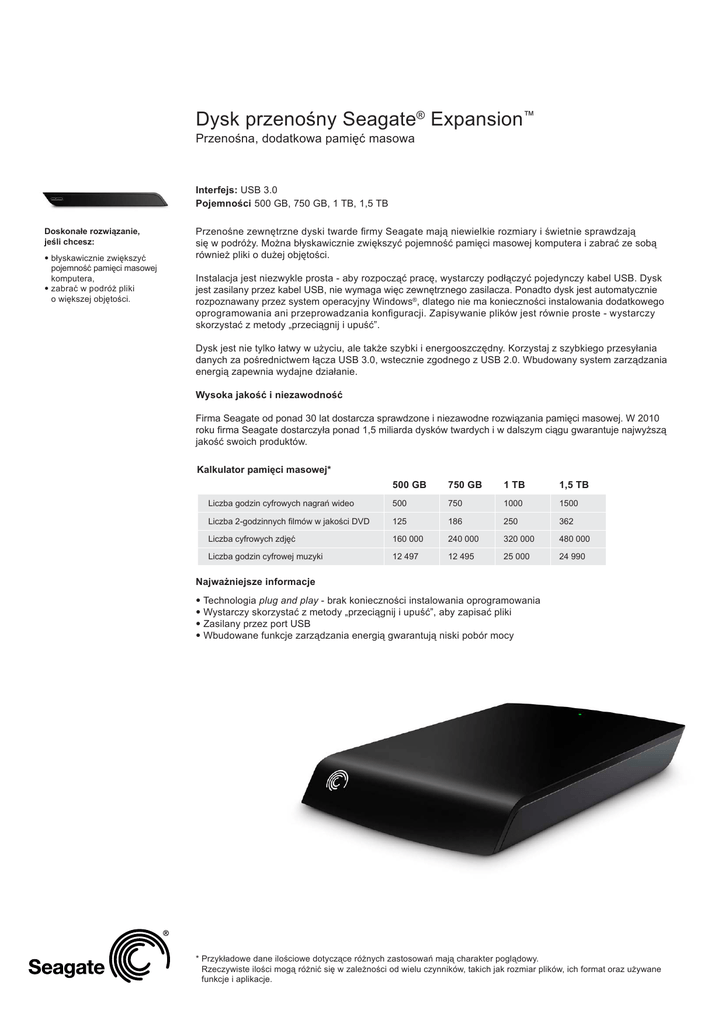 Dysk przenośny Seagate® Expansion™ Przenośna, dodatkowa pamięć masowa Interfejs: USB 3.0 Pojemności 500 GB, 750 GB, 1 TB, 1,5 TB Doskonałe rozwiązanie, jeśli chcesz: • błyskawicznie zwiększyć pojemność pamięci masowej komputera, • z abrać w podróż pliki o większej objętości. Przenośne zewnętrzne dyski twarde firmy Seagate mają niewielkie rozmiary i świetnie sprawdzają się w podróży. Można błyskawicznie zwiększyć pojemność pamięci masowej komputera i zabrać ze sobą również pliki o dużej objętości. Instalacja jest niezwykle prosta - aby rozpocząć pracę, wystarczy podłączyć pojedynczy kabel USB. Dysk jest zasilany przez kabel USB, nie wymaga więc zewnętrznego zasilacza. Ponadto dysk jest automatycznie rozpoznawany przez system operacyjny Windows®, dlatego nie ma konieczności instalowania dodatkowego oprogramowania ani przeprowadzania konfiguracji. Zapisywanie plików jest równie proste - wystarczy skorzystać z metody „przeciągnij i upuść”. Dysk jest nie tylko łatwy w użyciu, ale także szybki i energooszczędny. Korzystaj z szybkiego przesyłania danych za pośrednictwem łącza USB 3.0, wstecznie zgodnego z USB 2.0. Wbudowany system zarządzania energią zapewnia wydajne działanie. Wysoka jakość i niezawodność Firma Seagate od ponad 30 lat dostarcza sprawdzone i niezawodne rozwiązania pamięci masowej. W 2010 roku firma Seagate dostarczyła ponad 1,5 miliarda dysków twardych i w dalszym ciągu gwarantuje najwyższą jakość swoich produktów. Kalkulator pamięci masowej* 500 GB 750 GB 1 TB 1,5 TB Liczba godzin cyfrowych nagrań wideo 500 750 1000 1500 Liczba 2-godzinnych filmów w jakości DVD 125 186 250 362 Liczba cyfrowych zdjęć 160 000 240 000 320 000 480 000 Liczba godzin cyfrowej muzyki 12 497 12 495 25 000 24 990 Najważniejsze informacje • Technologia plug and play - brak konieczności instalowania oprogramowania • Wystarczy skorzystać z metody „przeciągnij i upuść”, aby zapisać pliki • Zasilany przez port USB • Wbudowane funkcje zarządzania energią gwarantują niski pobór mocy * Przykładowe dane ilościowe dotyczące różnych zastosowań mają charakter poglądowy. Rzeczywiste ilości mogą różnić się w zależności od wielu czynników, takich jak rozmiar plików, ich format oraz używane funkcje i aplikacje. Dysk przenośny Seagate® Expansion™ Przenośna, dodatkowa pamięć masowa Wymiary produktu 80,01 mm x 17,53 mm x 136,65 mm Waga: 0,16 kg Wymiary produktu (1 TB, 1,5 TB) 84,07 mm x 26,92 mm x 151,64 mm Waga: 0,31 kg Dane dotyczące opakowania w ofercie detalicznej Wymiary opakowania: 132,08 mm x 43,94 mm x 166,12 mm Waga opakowania: 0,29 kg Wymiary kartonu zbiorczego: 287,02 mm x 189,99 mm x 153,92 mm Waga kartonu zbiorczego: 2 kg Liczba opakowań w kartonie zbiorczym: 6 Liczba kartonów zbiorczych na palecie: 140 Wymiary palety: 1150,11 mm x 1000 mm x 1230,12 mm Waga palety: 308,36 kg Liczba warstw palety: 7 Dane dotyczące opakowania w ofercie detalicznej (1 TB, 1,5 TB) Wymiary opakowania: (132,08 mm x 55,88 mm x 173,99 mm) Waga opakowania: 0,47 kg Wymiary kartonu zbiorczego: 231,9 mm x 201,93 mm x 140,97 mm Waga kartonu zbiorczego: 2,11 kg Liczba opakowań w kartonie zbiorczym: 4 Liczba kartonów zbiorczych na palecie: 140 Wymiary palety: 1218,95 mm x 1016 mm x 1210,06 mm Waga palety: 317,48 kg Liczba warstw palety: 7 Wymagania względem oprogramowania • Zgodność z systemem operacyjnym Windows® 7, Windows Vista®, Windows® XP Zawartość opakowania • przenośny zewnętrzny dysk twardy, • kabel USB 3.0, • instrukcja szybkiej instalacji, • roczna gwarancja (AMER) • 2-letnia gwarancja (EMEA) • 3-letnia gwarancja (APAC) Region Pojemność Numer modelu Kod UPC AMER 500 GB STAX500102 763649030370 10763649030377 AMER 750 GB STAX750102 763649030707 10763649030704 AMER 1 TB STAX1000102 763649030714 10763649030711 AMER 1,5 TB STAX1500102 763649030721 EMEA 500 GB STAX500202 7636490029295 10763649030742 EMEA 750 GB STAX750202 7636490029301 10763649030759 EMEA 1 TB STAX1000202 7636490029318 10763649030766 7636490029325 10763649030773 EMEA Kod EAN Kod UPC opakowania zbiorczego 10763649030728 1,5 TB STAX1500202 APAC 500 GB STAX500302 763649030790 10763649030797 APAC 750 GB STAX750302 763649030806 10763649030803 APAC 1 TB STAX1000302 763649030813 10763649030810 APAC 1,5 TB STAX1500302 763649030820 10763649030827 © 2011 Seagate Technology LLC. Wszelkie prawa zastrzeżone. Seagate, Seagate Technology, logo Wave i Expansion są znakami towarowymi lub zastrzeżonymi znakami towarowymi firmy Seagate Technology LLC lub jednej z jej firm zależnych w Stanach Zjednoczonych i/lub innych krajach. Wszystkie pozostałe znaki towarowe i zastrzeżone znaki towarowe należą do odpowiednich właścicieli. W przypadku oznaczania pojemności dysków, jeden gigabajt (oznaczany także jako „GB”) jest równy jednemu miliardowi bajtów; jeden terabajt (oznaczany także jako „TB”) jest równy jednemu bilionowi bajtów. W systemie operacyjnym komputera mogą być używane różne standardy pomiarowe i raportowana pojemność może być mniejsza. Ponadto część podanej pojemności jest używana do formatowania oraz w innych celach i może nie być dostępna do przechowywania danych. Eksport i reeksport sprzętu lub oprogramowania szyfrującego może podlegać regulacjom prawnym Biura Przemysłu i Bezpieczeństwa Departamentu Handlu Stanów Zjednoczonych (więcej informacji znajduje się w witrynie www.bis.doc.gov), a import do krajów i użytkowanie poza terenem Stanów Zjednoczonych może podlegać ograniczeniom. Firma Seagate zastrzega sobie prawo do wprowadzania zmian w ofercie produktów lub w ich parametrach bez powiadomienia. Seagate Technology LLC, 920 Disc Drive, Scotts Valley CA 95066, USA www.seagate.com DS1674.1-0311PL