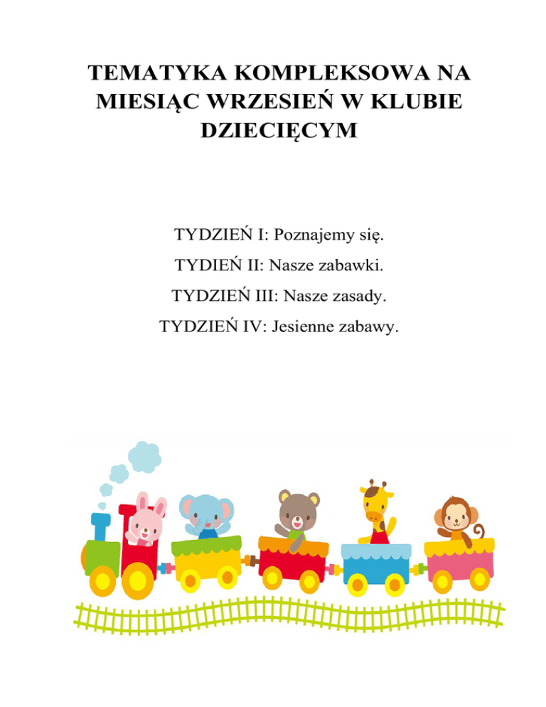 TEMATYKA KOMPLEKSOWA NA MIESIĄC WRZESIEŃ W KLUBIE DZIECIĘCYM TYDZIEŃ I: Poznajemy się. TYDIEŃ II: Nasze zabawki. TYDZIEŃ III: Nasze zasady. TYDZIEŃ IV: Jesienne zabawy. PIOSENKI I ZABAWY RUCHOWE ZE ŚPIEWEM „DZIEN DOBRY” Dzień dobry, dzień dobry, wszyscy się witamy. Dzień dobry, dzień dobry, dobry humor mamy. Dzień dobry, dzień dobry, słonko jasno świeci. Dzień dobry, dzień dobry, witam wszystkie dzieci. „WSZYSCY SĄ” Wszyscy są, witam Was, Zaczynamy- już czas! Jestem ja, jesteś Ty, raz, dwa, trzy! „KÓŁKO RANIASTE” Kółko graniaste, czworokanciaste, Kółko nam się połamało, Cztery grosze kosztowało, A my wszyscy bęc! WIERSZE I RYMOWANKI Ty masz klocek, ja mam też, Potrzebny nam trzeci. Zbudujemy dom wspaniały, Zaprosimy dzieci. Fiku, miku, Fiku, miku, Poskacz z nami, pajacyku. Skacze Krysia, skaczę ja! Poskacz z nami hop sa-sa! „JEŻYK” Na dywanie siedzi jeż, Co on robi to my też. Co robisz jeżu w kolczastym kołnierzu?