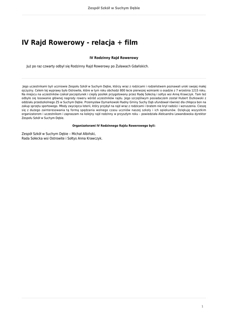 Zespół Szkół w Suchym Dębie IV Rajd Rowerowy - relacja + film IV Rodzinny Rajd Rowerowy Już po raz czwarty odbył się Rodzinny Rajd Rowerowy po Żuławach Gdańskich. Jego uczestnikami byli uczniowie Zespołu Szkół w Suchym Dębie, którzy wraz z rodzicami i rodzeństwem poznawali uroki swojej małej ojczyzny. Celem tej wyprawy było Ostrowite, które w tym roku obchodzi 800 lecie pierwszej wzmianki o osadzie z 7 września 1215 roku. Na miejscu na uczestników czekał poczęstunek i ciepły posiłek przygotowany przez Radę Sołecką i sołtys wsi Annę Krawczyk. Tam też odbyło się losowanie głównej nagrody roweru wśród uczestników rajdu. Jego szczęśliwym posiadaczem został Hubert Dutkowski z oddziału przedszkolnego ZS w Suchym Dębie. Przemysław Dymarkowski Radny Gminy Suchy Dąb ufundował również dla chłopca bon na zakup sprzętu sportowego. Młody zwycięzca loterii, który przybył na rajd wraz z rodzicami i bratem nie krył radości i wzruszenia. Cieszę się z dużego zainteresowania tą formą spędzania wolnego czasu uczniów naszej szkoły i ich opiekunów. Dziękuję wszystkim organizatorom i uczestnikom i zapraszam na kolejny rajd rodzinny w przyszłym roku – powiedziała Aleksandra Lewandowska dyrektor Zespołu Szkół w Suchym Dębie. Organizatorami IV Rodzinnego Rajdu Rowerowego byli: Zespół Szkół w Suchym Dębie – Michał Albiński, Rada Sołecka wsi Ostrowite i Sołtys Anna Krawczyk. 1