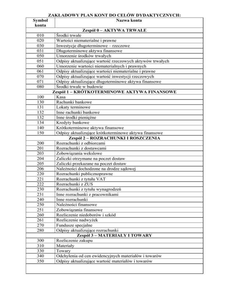 ZAKŁADOWY PLAN KONT DO CELÓW DYDAKTYCZNYCH: Symbol Nazwa konta konta Zespół 0 – AKTYWA TRWAŁE 010 Środki trwałe 020 Wartości niematerialne i prawne 030 Inwestycje długoterminowe – rzeczowe 031 Długoterminowe aktywa finansowe 050 Umorzenie środków trwałych 051 Odpisy aktualizujące wartość rzeczowych aktywów trwałych 060 Umorzenie wartości niematerialnych i prawnych 061 Odpisy aktualizujące wartości niematerialne i prawne 070 Odpisy aktualizujące wartość inwestycji rzeczowych 071 Odpisy aktualizujące długoterminowe aktywa finansowe 080 Środki trwałe w budowie Zespół 1 – KRÓTKOTERMINOWE AKTYWA FINANSOWE 100 Kasa 130 Rachunki bankowe 131 Lokaty terminowe 132 Inne rachunki bankowe 132 Inne środki pieniężne 134 Kredyty bankowe 140 Krótkoterminowe aktywa finansowe 150 Odpisy aktualizujące krótkoterminowe aktywa finansowe Zespół 2 – ROZRACHUNKI I ROSZCZENIA 200 Rozrachunki z odbiorcami 201 Rozrachunki z dostawcami 203 Zobowiązania wekslowe 204 Zaliczki otrzymane na poczet dostaw 205 Zaliczki przekazane na poczet dostaw 206 Należności dochodzone na drodze sądowej 220 Rozrachunki publicznoprawne 221 Rozrachunki z tytułu VAT 222 Rozrachunki z ZUS 230 Rozrachunki z tytułu wynagrodzeń 231 Inne rozrachunki z pracownikami 240 Inne rozrachunki 250 Należności finansowe 251 Zobowiązania finansowe 260 Rozliczenie niedoborów i szkód 261 Rozliczenie nadwyżek 270 Fundusze specjalne 280 Odpisy aktualizujące rozrachunki Zespół 3 – MATERIAŁY I TOWARY 300 Rozliczenie zakupu 310 Materiały 330 Towary 340 Odchylenia od cen ewidencyjnych materiałów i towarów 350 Odpisy aktualizujące wartość materiałów i towarów 401 402 403 404 405 406 409 490 500 509 523 524 530 550 580 600 620 640 650 660 670 700 701 730 731 750 751 760 761 770 771 780 781 790 800 801 802 803 820 830 840 850 Zespół 4 – KOSZTY WEDŁUG RODZAJU Amortyzacja Zużycie materiałów i energii Usługi obce Wynagrodzenia Ubezpieczenia społeczne i inne świadczenia Podatki i opłaty Pozostałe koszty rodzajowe Rozliczenie kosztów rodzajowych Zespół 5 – KOSZTY WEDŁUG TYPÓW DZIAŁALNOŚCI Koszty działalności podstawowej Braki Koszty zakupu Koszty sprzedaży Koszty działalności pomocniczej i socjalnej Koszty zarządu Rozliczenie kosztów działalności Zespół 6 – PRODUKTY I ROZLICZENIA MIĘDZYOKRESOWE Produkty Odchylenia od cen ewidencyjnych produktów Rozliczenia międzyokresowe kosztów operacyjnych Rozliczenia międzyokresowe kosztów finansowych Aktywa z tytułu odroczonego podatku dochodowego Odpisy aktualizujące wartość produktów gotowych i produkcji w toku Zespół 7 – PRZYCHODY I KOSZTY ICH OSIĄGNIĘCIA Przychody ze sprzedaży produktów Koszt wytworzenia sprzedanych produktów Przychody ze sprzedaży towarów i materiałów Wartość sprzedanych towarów i materiałów Przychody finansowe Koszty finansowe Pozostałe przychody operacyjne Pozostałe koszty operacyjne Zyski nadzwyczajne Straty nadzwyczajne Świadczenia na własne potrzeby jednostki Koszty wytworzenia świadczeń na własne potrzeby Podatek dochodowy i inne obowiązkowe obciążenia wyniku finansowego Zespół 8 – KAPITAŁY (FUNDUSZE) WŁASNE Kapitał (fundusz) podstawowy Kapitał (fundusz) zapasowy Kapitał (fundusz) z aktualizacji wyceny Kapitał (fundusz) rezerwowy Rozliczenie wyniku finansowego Rezerwy Rozliczenia międzyokresowe przychodów Wynik finansowy