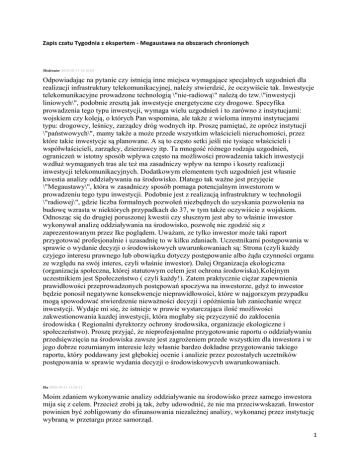 Zapis czatu Tygodnia z ekspertem ‐ Megaustawa na obszarach chronionych Moderator 2010-10-17 18:16:03 Odpowiadając na pytanie czy istnieją inne miejsca wymagające specjalnych uzgodnień dla realizacji infrastruktury telekomunikacyjnej, należy stwierdzić, że oczywiście tak. Inwestycje telekomunikacyjne prowadzone technologią \"nie-radiową\" należą do tzw.\"inwestycji liniowych\", podobnie zresztą jak inwestycje energetyczne czy drogowe. Specyfika prowadzenia tego typu inwestycji, wymaga wielu uzgodnień i to zarówno z instytucjami: wojskiem czy koleją, o których Pan wspomina, ale także z wieloma innymi instytucjami typu: drogowcy, leśnicy, zarządcy dróg wodnych itp. Proszę pamiętać, że oprócz instytucji \"państwowych\", mamy także a może przede wszystkim właścicieli nieruchomości, przez które takie inwestycje są planowane. A są to często setki jeśli nie tysiące właścicieli i współwłaścicieli, zarządcy, dzierżawcy itp. Ta mnogość różnego rodzaju uzgodnień, ograniczeń w istotny sposób wpływa często na możliwości prowadzenia takich inwestycji wzdłuż wymaganych tras ale też ma zasadniczy wpływ na tempo i koszty realizacji inwestycji telekomunikacyjnych. Dodatkowym elementem tych uzgodnień jest własnie kwestia analizy oddziaływania na środowisko. Dlatego tak ważne jest przyjęcie \"Megaustawy\", która w zasadniczy sposób pomaga potencjalnym inwestorom w prowadzeniu tego typu inwestycji. Podobnie jest z realizacją infrastruktury w technologii \"radiowej\", gdzie liczba formalnych pozwoleń niezbędnych do uzyskania pozwolenia na budowę wzrasta w niektórych przypadkach do 37, w tym także oczywiście z wojskiem. Odnosząc się do drugiej poruszonej kwestii czy słusznym jest aby to właśnie inwestor wykonywał analizę oddziaływania na środowisko, pozwolę nie zgodzić się z zaprezentowanym przez Ike poglądem. Uważam, ze tylko inwestor może taki raport przygotować profesjonalnie i uzasadnię to w kilku zdaniach. Uczestnikami postępowania w sprawie o wydanie decyzji o środowiskowych uwarunkowaniach są: Strona (czyli każdy czyjego interesu prawnego lub obowiązku dotyczy postępowanie albo żąda czynności organu ze względu na swój interes, czyli właśnie inwestor). Dalej Organizacja ekologiczna (organizacja społeczna, której statutowym celem jest ochrona środowiska).Kolejnym uczestnikiem jest Społeczeństwo ( czyli każdy!). Zatem praktycznie ciężar zapewnienia prawidłowości przeprowadzonych postępowań spoczywa na inwestorze, gdyż to inwestor będzie ponosił negatywne konsekwencje nieprawidłowości, które w najgorszym przypadku mogą spowodować stwierdzenie nieważności decyzji i opóżnienia lub zaniechanie wręcz inwestycji. Wydaje mi się, że istnieje w prawie wystarczająca ilość możliwości zakwestionowania kazdej inwestycji, która mogłaby się przyczynić do zakłocenia środowiska ( Regionalni dyrektorzy ochrony środowsika, organizacje ekologiczne i społeczeństwo). Proszę przyjąć, że nieprofesjonalne przygotowanie raportu o oddziaływaniu przedsięwzięcia na środowiska zawsze jest zagrożeniem przede wszystkim dla inwestora i w jego dobrze rozumianym interesie leży własnie bardzo dokładne przygotowanie takiego raportu, który poddawany jest głębokiej ocenie i analizie przez pozostałych uczetników postępowania w sprawie wydania decyzji o środowiskowycvh uwarunkowaniach. Ika 2010-10-15 13:24:11 Moim zdaniem wykonywanie analizy oddziaływanie na środowisko przez samego inwestora mija się z celem. Przecież zrobi ją tak, żeby udowodnić, że nie ma przeciwwskazań. Inwestor powinien być zobligowany do sfinansowania niezależnej analizy, wykonanej przez instytucję wybraną w przetargu przez samorząd. 1 Jan23 2010-10-14 12:19:02 Skupiamy się głównie na obszarach chronionych przyrodniczo, ale czy istnieją inne miejsca, na których inwestycje dot. infrastruktury teleinformatycznej wymagają specjalnych uzgodnień. np wojsko lub kolej. Moderator 2010-10-11 15:00:59 Dziękuje za Państwa opinie i uwagi. Odnosząc się do dotychczasowej głosów w dyskusj, wyjaśniam: Kwestia obszarów Natura 2000. Tereny objete przez sieć Natura 2000 postrzegane są często jako obszary ochrony ścisłej. Tak jednak nie jest. Inwestycje na tym terenie są dozwolone gdy planowane przedsięwzięcie nie będzie znacząco oddziaływać na jego obszar. Wyjątkiem są: brak rozwiązań alternatywnych+ nadrzędność interesu publicznego + działania kompensacyjne. Zatem Natura 2000 nie blokuje inwestycji w danym regionie, wymaga jedynie wykazania braku szkodliwego wpływu na te obszary i wpływu jaka dana inwestycja przyniesie dla rozwoju regionalnego. Z pewnością takie efekty zapewni dostęp do sieci szerokopasmowej. I słusznie Pan Krzysztof zauważył, że właśnie inicjatywę w tym względzie powinien mieć samorząd. Zupełnie odmienną kwestią jest sprawa czasu jaki jest niezbędny dla przeprowadzenia takiej procedury. Tu niestety jesteśmy zobligowani do przestrzegania postanowień Ustawy z 3.10.2008 o udostępnianiu informacji o środowisku, jego ochronie, udziale społeczeństwa w ochronie środowiska oraz o ocenach oddziaływania na środowisko. W praktyce nawet rok czasu może nie starczyć na załatwienie wszystkich formalności. Pamiętajmy, że mamy tutaj do czynienia z udziałem społeczeństwa. A w rozumieniu tej Ustawy \"społeczeństwem\" jest każdy, niezależnie od wieku, obywatelstwa czy miejsca zamieszkania oraz czy ma jakikolwiek interes prawny lub faktyczny związany ze sprawą, której postępowanie dotyczy. Pan Jacek z kolei odniósł się do kwestii zapisów Megaustawy, mówiących o braku zapisów nakazujących budowę światłowodów przy jednoczesnym zakazie lokalizowania stacji bazowych na terenach uzdrowisk. Istotnie Prezes UKE opiniuje projekty planów miejscowych w tym zakresie, nie może jednak nakazać tego w jaki sposób ma być dany teren objęt