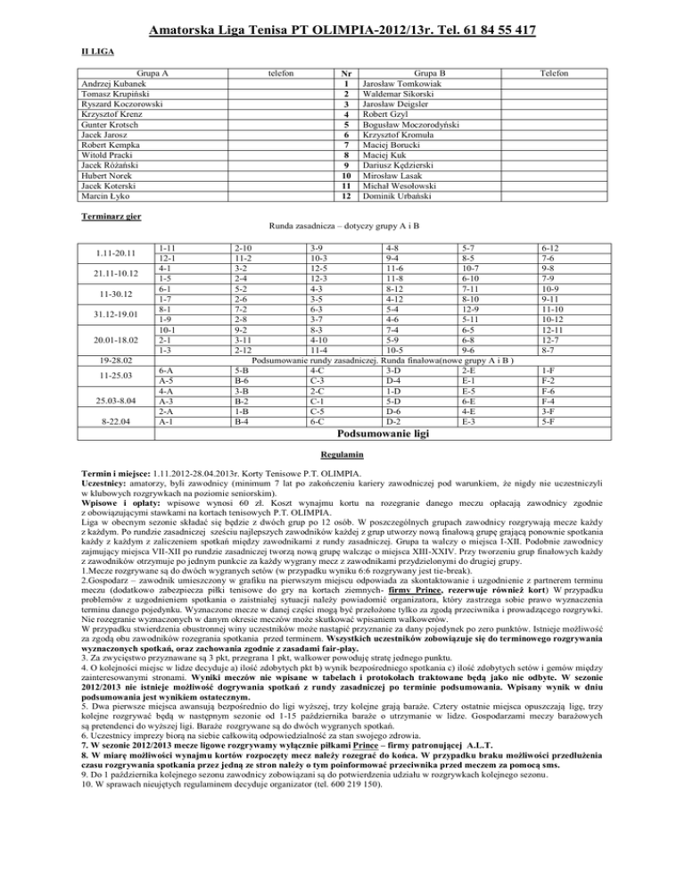 Amatorska Liga Tenisa PT OLIMPIA-2012/13r. Tel. 61 84 55 417 II LIGA Grupa A Andrzej Kubanek Tomasz Krupiński Ryszard Koczorowski Krzysztof Krenz Gunter Krotsch Jacek Jarosz Robert Kempka Witold Pracki Jacek Różański Hubert Norek Jacek Koterski Marcin Łyko telefon Nr 1 2 3 4 5 6 7 8 9 10 11 12 Grupa B Jarosław Tomkowiak Waldemar Sikorski Jarosław Deigsler Robert Gzyl Bogusław Moczorodyński Krzysztof Kromuła Maciej Borucki Maciej Kuk Dariusz Kędzierski Mirosław Lasak Michał Wesołowski Dominik Urbański Telefon Terminarz gier Runda zasadnicza – dotyczy grupy A i B 1.11-20.11 21.11-10.12 11-30.12 31.12-19.01 20.01-18.02 1-11 12-1 4-1 1-5 6-1 1-7 8-1 1-9 10-1 2-1 1-3 2-10 11-2 3-2 2-4 5-2 2-6 7-2 2-8 9-2 3-11 2-12 6-A A-5 4-A A-3 2-A A-1 5-B B-6 3-B B-2 1-B B-4 19-28.02 11-25.03 25.03-8.04 8-22.04 3-9 4-8 5-7 10-3 9-4 8-5 12-5 11-6 10-7 12-3 11-8 6-10 4-3 8-12 7-11 3-5 4-12 8-10 6-3 5-4 12-9 3-7 4-6 5-11 8-3 7-4 6-5 4-10 5-9 6-8 11-4 10-5 9-6 Podsumowanie rundy zasadniczej. Runda finałowa(nowe grupy A i B ) 4-C 3-D 2-E C-3 D-4 E-1 2-C 1-D E-5 C-1 5-D 6-E C-5 D-6 4-E 6-C D-2 E-3 6-12 7-6 9-8 7-9 10-9 9-11 11-10 10-12 12-11 12-7 8-7 1-F F-2 F-6 F-4 3-F 5-F Podsumowanie ligi Regulamin Termin i miejsce: 1.11.2012-28.04.2013r. Korty Tenisowe P.T. OLIMPIA. Uczestnicy: amatorzy, byli zawodnicy (minimum 7 lat po zakończeniu kariery zawodniczej pod warunkiem, że nigdy nie uczestniczyli w klubowych rozgrywkach na poziomie seniorskim). Wpisowe i opłaty: wpisowe wynosi 60 zł. Koszt wynajmu kortu na rozegranie danego meczu opłacają zawodnicy zgodnie z obowiązującymi stawkami na kortach tenisowych P.T. OLIMPIA. Liga w obecnym sezonie składać się będzie z dwóch grup po 12 osób. W poszczególnych grupach zawodnicy rozgrywają mecze każdy z każdym. Po rundzie zasadniczej sześciu najlepszych zawodników każdej z grup utworzy nową finałową grupę grającą ponownie spotkania każdy z każdym z zaliczeniem spotkań między zawodnikami z rundy zasadniczej. Grupa ta walczy o miejsca I-XII. Podobnie zawodnicy zajmujący miejsca VII-XII po rundzie zasadniczej tworzą nową grupę walcząc o miejsca XIII-XXIV. Przy tworzeniu grup finałowych każdy z zawodników otrzymuje po jednym punkcie za każdy wygrany mecz z zawodnikami przydzielonymi do drugiej grupy. 1.Mecze rozgrywane są do dwóch wygranych setów (w przypadku wyniku 6:6 rozgrywany jest tie-break). 2.Gospodarz – zawodnik umieszczony w grafiku na pierwszym miejscu odpowiada za skontaktowanie i uzgodnienie z partnerem terminu meczu (dodatkowo zabezpiecza piłki tenisowe do gry na kortach ziemnych- firmy Prince, rezerwuje również kort) W przypadku problemów z uzgodnieniem spotkania o zaistniałej sytuacji należy powiadomić organizatora, który zastrzega sobie prawo wyznaczenia terminu danego pojedynku. Wyznaczone mecze w danej części mogą być przełożone tylko za zgodą przeciwnika i prowadzącego rozgrywki. Nie rozegranie wyznaczonych w danym okresie meczów może skutkować wpisaniem walkowerów. W przypadku stwierdzenia obustronnej winy uczestników może nastąpić przyznanie za dany pojedynek po zero punktów. Istnieje możliwość za zgodą obu zawodników rozegrania spotkania przed terminem. Wszystkich uczestników zobowiązuje się do terminowego rozgrywania wyznaczonych spotkań, oraz zachowania zgodnie z zasadami fair-play. 3. Za zwycięstwo przyznawane są 3 pkt, przegrana 1 pkt, walkower powoduję stratę jednego punktu. 4. O kolejności miejsc w lidze decyduje a) ilość zdobytych pkt b) wynik bezpośredniego spotkania c) ilość zdobytych setów i gemów między zainteresowanymi stronami. Wyniki meczów nie wpisane w tabelach i protokołach traktowane będą jako nie odbyte. W sezonie 2012/2013 nie istnieje możliwość dogrywania spotkań z rundy zasadniczej po terminie podsumowania. Wpisany wynik w dniu podsumowania jest wynikiem ostatecznym. 5. Dwa pierwsze miejsca awansują bezpośrednio do ligi wyższej, trzy kolejne grają baraże. Cztery ostatnie miejsca opuszczają ligę, trzy kolejne rozgrywać będą w następnym sezonie od 1-15 października baraże o utrzymanie w lidze. Gospodarzami meczy barażowych są pretendenci do wyższej ligi. Baraże rozgrywane są do dwóch wygranych spotkań. 6. Uczestnicy imprezy biorą na siebie całkowitą odpowiedzialność za stan swojego zdrowia. 7. W sezonie 2012/2013 mecze ligowe rozgrywamy wyłącznie piłkami Prince – firmy patronującej A.L.T. 8. W miarę możliwości wynajmu kortów rozpoczęty mecz należy rozegrać do końca. W przypadku braku możliwości przedłużenia czasu rozgrywania spotkania przez jedną ze stron należy o tym poinformować przeciwnika przed meczem za pomocą sms. 9. Do 1 października kolejnego sezonu zawodnicy zobowiązani są do potwierdzenia udziału w rozgrywkach kolejnego sezonu. 10. W sprawach nieujętych regulaminem decyduje organizator (tel. 600 219 150).