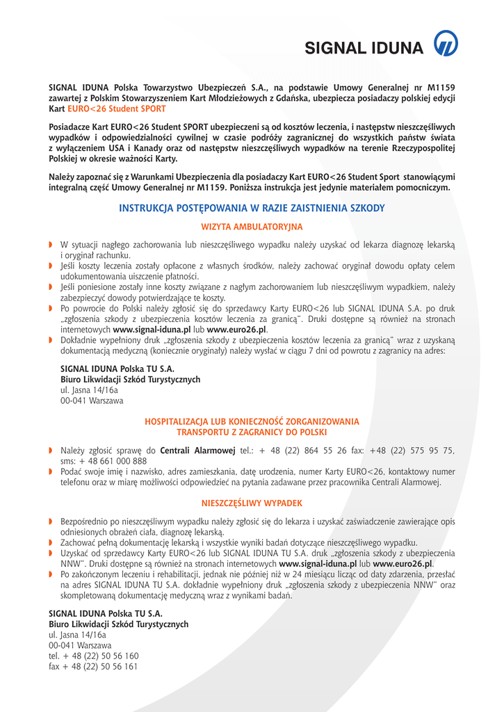 SIGNAL IDUNA Polska Towarzystwo Ubezpieczeń S.A., na podstawie Umowy Generalnej nr M1159 zawartej z Polskim Stowarzyszeniem Kart Młodzieżowych z Gdańska, ubezpiecza posiadaczy polskiej edycji Kart EURO<26 Student SPORT Posiadacze Kart EURO<26 Student SPORT ubezpieczeni są od kosztów leczenia, i następstw nieszczęśliwych wypadków i odpowiedzialności cywilnej w czasie podróży zagranicznej do wszystkich państw świata z wyłączeniem USA i Kanady oraz od następstw nieszczęśliwych wypadków na terenie Rzeczypospolitej Polskiej w okresie ważności Karty. Należy zapoznać się z Warunkami Ubezpieczenia dla posiadaczy Kart EURO<26 Student Sport stanowiącymi integralną część Umowy Generalnej nr M1159. Poniższa instrukcja jest jedynie materiałem pomocniczym. INSTRUKCJA POSTĘPOWANIA W RAZIE ZAISTNIENIA SZKODY WIZYTA AMBULATORYJNA ◗ W sytuacji nagłego zachorowania lub nieszczęśliwego wypadku należy uzyskać od lekarza diagnozę lekarską i oryginał rachunku. ◗ Jeśli koszty leczenia zostały opłacone z własnych środków, należy zachować oryginał dowodu opłaty celem udokumentowania uiszczenie płatności. ◗ Jeśli poniesione zostały inne koszty związane z nagłym zachorowaniem lub nieszczęśliwym wypadkiem, należy zabezpieczyć dowody potwierdzające te koszty. ◗ Po powrocie do Polski należy zgłosić się do sprzedawcy Karty EURO<26 lub SIGNAL IDUNA S.A. po druk „zgłoszenia szkody z ubezpieczenia kosztów leczenia za granicą”. Druki dostępne są również na stronach internetowych www.signal-iduna.pl lub www.euro26.pl. ◗ Dokładnie wypełniony druk „zgłoszenia szkody z ubezpieczenia kosztów leczenia za granicą” wraz z uzyskaną dokumentacją medyczną (koniecznie oryginały) należy wysłać w ciągu 7 dni od powrotu z zagranicy na adres: SIGNAL IDUNA Polska TU S.A. Biuro Likwidacji Szkód Turystycznych ul. Jasna 14/16a 00-041 Warszawa HOSPITALIZACJA LUB KONIECZNOŚĆ ZORGANIZOWANIA TRANSPORTU Z ZAGRANICY DO POLSKI ◗ Należy zgłosić sprawę do Centrali Alarmowej tel.: + 48 (22) 864 55 26 fax: +48 (22) 575 95 75, sms: + 48 661 000 888 ◗ Podać swoje imię i nazwisko, adres zamieszkania, datę urodzenia, numer Karty EURO<26, kontaktowy numer telefonu oraz w miarę możliwości odpowiedzieć na pytania zadawane przez pracownika Centrali Alarmowej. NIESZCZĘŚLIWY WYPADEK ◗ Bezpośrednio po nieszczęśliwym wypadku należy zgłosić się do lekarza i uzyskać zaświadczenie zawierające opis odniesionych obrażeń ciała, diagnozę lekarską. ◗ Zachować pełną dokumentację lekarską i wszystkie wyniki badań dotyczące nieszczęśliwego wypadku. ◗ Uzyskać od sprzedawcy Karty EURO<26 lub SIGNAL IDUNA TU S.A. druk „zgłoszenia szkody z ubezpieczenia NNW”. Druki dostępne są również na stronach internetowych www.signal-iduna.pl lub www.euro26.pl. ◗ Po zakończonym leczeniu i rehabilitacji, jednak nie później niż w 24 miesiącu licząc od daty zdarzenia, przesłać na adres SIGNAL IDUNA TU S.A. dokładnie wypełniony druk „zgłoszenia szkody z ubezpieczenia NNW” oraz skompletowaną dokumentację medyczną wraz z wynikami badań. SIGNAL IDUNA Polska TU S.A. Biuro Likwidacji Szkód Turystycznych ul. Jasna 14/16a 00-041 Warszawa tel. + 48 (22) 50 56 160 fax + 48 (22) 50 56 161