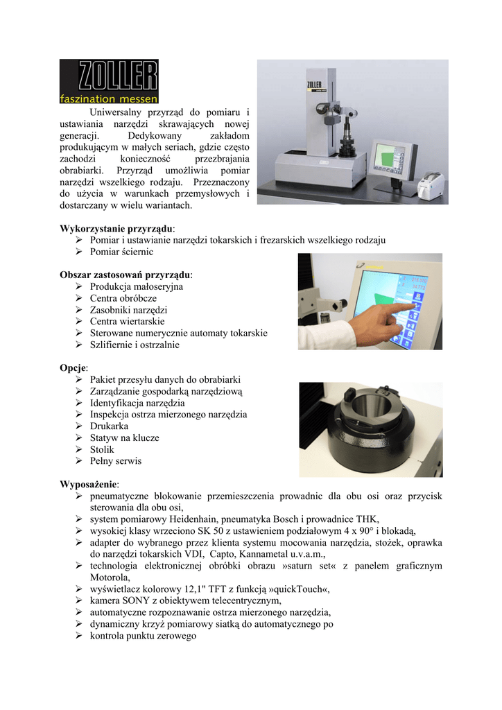 Uniwersalny przyrząd do pomiaru i ustawiania narzędzi skrawających nowej generacji. Dedykowany zakładom produkującym w małych seriach, gdzie często zachodzi konieczność przezbrajania obrabiarki. Przyrząd umożliwia pomiar narzędzi wszelkiego rodzaju. Przeznaczony do użycia w warunkach przemysłowych i dostarczany w wielu wariantach. Wykorzystanie przyrządu: ¾ Pomiar i ustawianie narzędzi tokarskich i frezarskich wszelkiego rodzaju ¾ Pomiar ściernic Obszar zastosowań przyrządu: ¾ Produkcja małoseryjna ¾ Centra obróbcze ¾ Zasobniki narzędzi ¾ Centra wiertarskie ¾ Sterowane numerycznie automaty tokarskie ¾ Szlifiernie i ostrzalnie Opcje: ¾ Pakiet przesyłu danych do obrabiarki ¾ Zarządzanie gospodarką narzędziową ¾ Identyfikacja narzędzia ¾ Inspekcja ostrza mierzonego narzędzia ¾ Drukarka ¾ Statyw na klucze ¾ Stolik ¾ Pełny serwis Wyposażenie: ¾ pneumatyczne blokowanie przemieszczenia prowadnic dla obu osi oraz przycisk sterowania dla obu osi, ¾ system pomiarowy Heidenhain, pneumatyka Bosch i prowadnice THK, ¾ wysokiej klasy wrzeciono SK 50 z ustawieniem podziałowym 4 x 90° i blokadą, ¾ adapter do wybranego przez klienta systemu mocowania narzędzia, stożek, oprawka do narzędzi tokarskich VDI, Capto, Kannametal u.v.a.m., ¾ technologia elektronicznej obróbki obrazu »saturn set« z panelem graficznym Motorola, ¾ wyświetlacz kolorowy 12,1" TFT z funkcją »quickTouch«, ¾ kamera SONY z obiektywem telecentrycznym, ¾ automatyczne rozpoznawanie ostrza mierzonego narzędzia, ¾ dynamiczny krzyż pomiarowy siatką do automatycznego po ¾ kontrola punktu zerowego Charakterystyka oprogramowania: • Automatyczne rozpoznawanie ostrza Po najechaniu kamerą na mierzony element system obróbki obrazu automatycznie rozpoznaje kontur mierzonego ostrza, Program posiada zaprogramowanych około 160 różnych ostrzy, co w znaczny sposób zwiększa szybkość i wygodę obsługi. • Dynamiczny krzyż pomiarowy Za pomocą dynamicznego krzyża pomiarowego i szablonu promieni możliwe jest przesuwanie i obrót linii krzyża oraz zmiana wielkości promienia. Ta opcja odpowiada funkcjom projektora i przeznaczona jest do pomiarów manualnych. • Pomiar największego ostrza Umożliwia pomiar każdego ostrza z osobna w narzędziach wieloostrzowych takich jak np. głowice frezarskie. Wyniki przedstawiane są w formie listy. Najważniejsze dla maszyny dane korekcyjne ostrza narzędzia są przedstawiane kolorem, a ich parametry drukowane są na etykietce. • Funkcja maksymalnego konturu ›C.R.I.S.‹ Przeznaczona dla narzędzia wieloostrzowych lub spiralnych takich jak ściernice. Funkcja w bardzo prosty sposób wyznacza i mierzy dokładny zewnętrzny kontur narzędzia uzyskiwany w wyniku jego obrotu wokół własnej osi o 360°. • Kontrola ostrza skrawającego Jako opcja, dostępna jest za pomocą kamery o powiększeniu 35x funkcja inspekcji ostrza umożliwiająca kontrolę zużycia, i jego stan obecny. Dzięki jednocześnie graficznemu interfejsowi obsługi i funkcjonalności oprogramowania, a także zastosowania panelu dotykowego Touch–Screen, cały pomiar odbywa się w sposób wygodny, szybki i prosty bez konieczności znajomości od obsługującego fachowej wiedzy. Poniżej zamieszczono specyfikację techniczną przyrządu ZOLER ›smile‹. Dane techniczne: Oś X Oś Z Powtarzalność Dokładność ustawienia Rozdzielczość Bicie promieniowe Max. masa przedmiotu 400, 600 mm – Ø szczęk 100 mm 400, 600, 800 mm ± 0,002 mm 2 µm 0,001 mm 0,002 mm 300N
