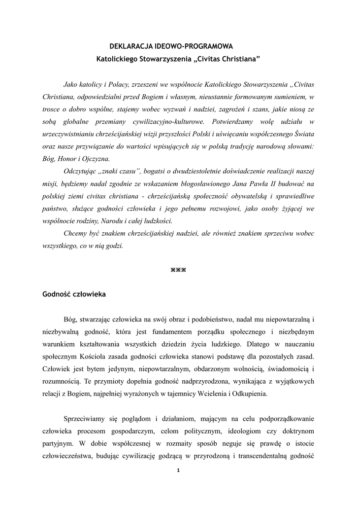 DEKLARACJA IDEOWO-PROGRAMOWA Katolickiego Stowarzyszenia „Civitas Christiana” Jako katolicy i Polacy, zrzeszeni we wspólnocie Katolickiego Stowarzyszenia „Civitas Christiana, odpowiedzialni przed Bogiem i własnym, nieustannie formowanym sumieniem, w trosce o dobro wspólne, stajemy wobec wyzwań i nadziei, zagrożeń i szans, jakie niosą ze sobą globalne przemiany cywilizacyjno-kulturowe. Potwierdzamy wolę udziału w urzeczywistnianiu chrześcijańskiej wizji przyszłości Polski i uświęcaniu współczesnego Świata oraz nasze przywiązanie do wartości wpisujących się w polską tradycję narodową słowami: Bóg, Honor i Ojczyzna. Odczytując „znaki czasu”, bogatsi o dwudziestoletnie doświadczenie realizacji naszej misji, będziemy nadal zgodnie ze wskazaniem błogosławionego Jana Pawła II budować na polskiej ziemi civitas christiana - chrześcijańską społeczność obywatelską i sprawiedliwe państwo, służące godności człowieka i jego pełnemu rozwojowi, jako osoby żyjącej we wspólnocie rodziny, Narodu i całej ludzkości. Chcemy być znakiem chrześcijańskiej nadziei, ale również znakiem sprzeciwu wobec wszystkiego, co w nią godzi. Godność człowieka Bóg, stwarzając człowieka na swój obraz i podobieństwo, nadał mu niepowtarzalną i niezbywalną godność, która jest fundamentem porządku społecznego i niezbędnym warunkiem kształtowania wszystkich dziedzin życia ludzkiego. Dlatego w nauczaniu społecznym Kościoła zasada godności człowieka stanowi podstawę dla pozostałych zasad. Człowiek jest bytem jedynym, niepowtarzalnym, obdarzonym wolnością, świadomością i rozumnością. Te przymioty dopełnia godność nadprzyrodzona, wynikająca z wyjątkowych relacji z Bogiem, najpełniej wyrażonych w tajemnicy Wcielenia i Odkupienia. Sprzeciwiamy się poglądom i działaniom, mającym na celu podporządkowanie człowieka procesom gospodarczym, celom politycznym, ideologiom czy doktrynom partyjnym. W dobie współczesnej w rozmaity sposób neguje się prawdę o istocie człowieczeństwa, budując cywilizację godzącą w przyrodzoną i transcendentalną godność 1 osoby ludzkiej. W sposób szczególny niepokój budzą koncepcje indywidualistyczne, kolektywistyczne, absolutyzujące wolność, a relatywizujące prawdę. Dlatego pragniemy w duchu nauczania społecznego Kościoła nadal podejmować refleksję nad zagadnieniem godności ludzkiej, zwłaszcza w aspektach: przestrzegania naturalnych i przyrodzonych praw, świętości i integralności życia, chrześcijańskiej koncepcji rodziny oraz godności człowieka jako obywatela i pracownika. Chcemy podejmować działania, których celem i podmiotem zawsze jest człowiek. Takiego rozumienia wypełniania misji działalności publicznej będziemy wymagać od władz państwowych i samorządowych. Kultura Kultura obejmuje ”wszystko, czym człowiek doskonali i rozwija wielorakie uzdolnienia swego ducha i ciała; stara się drogą poznania i pracy poddać sam świat pod swoją władzę; czyni bardziej ludzkim życie społeczne tak w rodzinie, jak i w całej społeczności państwowej przez postęp obyczajów i instytucji; wreszcie w dziełach swoich w ciągu wieków, wyraża, przekazuje i zachowuje wielkie doświadczenia duchowe i dążenia w tym celu, aby służyły one postępowi wielu, a nawet całej ludzkości” (KDK 53). Zarówno kultura osobista każdego człowieka, jak i wszelka działalność kulturotwórcza: indywidualna i zbiorowa, a także kultura społeczna rozumiana jako stan zbiorowej świadomości – powinny sprzyjać integralnemu rozwojowi osoby ludzkiej i dobru wspólnemu. Główne narzędzia i zjawiska globalizacji: pieniądz, rynek, środki przekazu, oświata i polityka wykorzystywane są często do kwestionowania bądź ośmieszania wartości kultury chrześcijańskiej oraz duchowych i materialnych fundamentów kultur narodowych. Niepokoją również działania, które sprzyjają negowaniu prawdy, z towarzyszącym mu relatywizmem poznawczym, etycznym i religijnym. Szczególne znaczenie mają media, które nie wykorzystują swoich możliwości oddziaływania do propagowania wartości kulturowych, inspirowanych ewangelicznym przesłaniem. Uznając, że kultura jest głównym polem ewangelizacji i ważnym nurtem działalności katolicko-społecznej, chcemy poprzez różne formy swej aktywności, umacniać i wzbogacać jej narodowy i regionalny wymiar. Inspirowani Dobrą Nowiną i nauką Kościoła, będziemy nadal działać na rzecz ochrony i rozwoju dziedzictwa kulturowego narodu. 2 Rodzina Małżeństwo i rodzina stanowią naturalną wspólnotę życia i miłości. To trwała i niezbywalna instytucja i środowisko człowieka oraz konstytutywny pierwiastek wspólnoty narodowej. Rodzina jest również najważniejszym ośrodkiem wychowawczym i szkołą życia społecznego. Wymaga więc szacunku i współdziałania wielu podmiotów, w tym społeczeństwa, państwa i Kościoła w wypełnianiu jej wielowymiarowych zadań. Przestrzeganie praw rodziny, respektowanie jej systemu wartości i troska o najmłodszych obywateli, a także pomoc w wykonywaniu wielorakich funkcji rodziny, są naczelną powinnością państwa. Obserwujemy działania różnych instytucji i środowisk tworzących ideologie, które wspierają hedonistyczny styl życia, prowadzący do braku szacunku dla godności osoby ludzkiej od poczęcia do naturalnej śmierci. Poprzez środki masowego przekazu kwestionuje się trwałość małżeństwa – kobiety i mężczyzny – pomniejszając wartość odpowiedzialnego rodzicielstwa. Szkoła w swoich założeniach przestaje być miejscem kształtowania postaw i środowiskiem wspomagającym rodziców w wypełnianiu ich funkcji „pierwszego i najważniejszego wychowawcy”. Kwestionowany jest model rodziny wielopokoleniowej, autorytet pokoleń przodków i wartość dziedzictwa kultury polskiej. Niepokojącym zjawiskiem jest polityka edukacyjna m.in. ograniczająca n