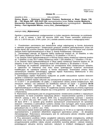 Załącznik nr 3 Projekt umowy Umowa Nr …........................ zawarta w dniu …............................... roku pomiędzy Gminą Słupia – Gminnym Ośrodkiem Pomocy Społecznej w Słupi, Słupia 136, 96 – 128 Słupia NIP: 836-16-87-324 reprezentowaną przez Panią Lucynę Masłocha – Kierownika Gminnego Ośrodka Pomocy Społecznej przy kontrasygnacie - Skarbnika Gminy – Pani Agnieszki Mikina, zwaną dalej ,,Zamawiającym" a ….............................................................................................................................................. zwanym dalej „Wykonawcą” Zgodnie z przeprowadzonym postępowaniem w trybie zapytania ofertowego na podstawie art. 4 pkt 8 ustawy z dnia 29 stycznia 2004 roku Prawo zamówień publicznych (Dz. U. z 2015 roku poz. 2164 z późn. zm.) została zawarta umowa o następującej treści: §1 1. Przedmiotem zamówienia jest świadczenie usługi cateringowej w formie dożywiania w zakresie przygotowywania i dostarczania gorących posiłków jednodaniowych (zupa lub drugie danie) dla uczniów Zespołu Szkół Ogólnokształcących w Winnej Górze oraz uczniów Zespołu Szkół Ogólnokształcących w Słupi, tj. Szkoły Podstawowej i Gimnazjum. 2. Zamawiający planuje, że dziennie należy dostarczyć średnio ok. 33 obiadów, w roku 2017 należy dostarczyć około 5 775 obiadów, tj. 33 obiadów x 175 dni; tj: 1) do Zespołu Szkół ogólnokształcących w Winnej Górze należy dostarczyć dziennie średnio ok. 7 obiadów, w roku 2017 należy dostarczyć około 1 225 obiadów, tj. 7 obiadów x 175 dni; 2) do Zespołu Szkół ogólnokształcących w Słupi należy dostarczyć dziennie średnio ok. 26 obiadów, w roku 2017 należy dostarczyć około 4 550 obiadów, tj. 26 obiadów x 175 dni; 3. Zastrzega się możliwość zwiększenia lub zmniejszenia ilości dostarczanych obiadów, w zależności od frekwencji oraz ilości dzieci spełniających kryterium dochodowe kwalifikujące do udzielenia pomocy w formie dożywiania. Ewentualne zmiany ilości zamawianych obiadów Zamawiający zgłaszać będzie Wykonawcy telefonicznie w dniu poprzedzającym transport do godziny 15.00. 4. Zamawiający zapłaci Wykonawcy wyłącznie za posiłki rzeczywiście wydane dzieciom zgodnie z codziennym zapotrzebowaniem. 5. Dostawa posiłków będzie odbywać się sukcesywnie począwszy od dnia 02.01.2017 r. do 31.12.2017 r. od poniedziałku do piątku, z wyłączeniem okresu przerw świątecznych, ferii zimowych, wakacji i dni ustawowo lub dodatkowo wolnych od nauki – o godzinie 09:30 w Zespole Szkół Ogólnokształcących w Słupi oraz 10.30 w Zespole Szkół Ogólnokształcących w Winnej Górze. W wyjątkowej sytuacji związanej ze zmianą organizacji dnia szkoły, dostawa posiłków odbędzie się o innej godzinie – po wcześniejszym uzgodnieniu z Wykonawcą. 6. Wykonawca zobowiązany jest do przygotowywania i dostarczania posiłków o najwyższym standardzie, na bazie produktów najwyższej jakości i bezpieczeństwa zgodnie z normami HACCP, ustawą z dnia 25 sierpnia 2006 roku o bezpieczeństwie żywności i żywienia (Dz. U. z 2015 roku poz. 594 z późn. zm.) oraz Rozporządzenia Ministra Zdrowia z dnia 26 lipca 2016 r. w sprawie grup środków spożywczych przeznaczonych do sprzedaży dzieciom i młodzieży w jednostkach systemu oświaty oraz wymagań, jakie muszą spełniać środki spożywcze stosowane w ramach żywienia zbiorowego dzieci i młodzieży w tych jednostkach (Dz. U. z 2016 r. poz. 1154). 7. Wykonawca będzie dostarczał jadłospis przygotowany na 10 dni (z co najmniej 3-dniowym wyprzedzeniem), z podaniem składników wagowych (gramatury) potraw – do akceptacji Zamawiającego. Wykonawca zobowiązany jest do zachowania jakości obiadów zgodnie z przedstawionym jadłospisem. 8. Przy planowaniu posiłków należy uwzględnić zalecaną wartość energetyczną, wielkość posiłków oraz normy produktów dla uczniów szkoły podstawowej i uczniów gimnazjum. Do przygotowywania posiłków należy używać produktów wysokiej jakości i zawsze świeżych posiadających aktualne terminy ważności, nabytych w źródłach działających zgodnie z obowiązującymi przepisami sanitarnymi i higienicznymi. Wyklucza się posiłki sporządzane na bazie półproduktów oraz na bazie Fast Food. Bezwzględnie należy przestrzegać norm na składniki pokarmowe i produkty spożywcze określone przez Instytut Żywienia i Żywności. Posiłki mają być przygotowane zgodnie z zasadami racjonalnego żywienia dzieci i młodzieży oraz przy bezwzględnym przestrzeganiu zaleceń Głównego Inspektora Sanitarnego. 9. Wykonawca będzie przygotowywał dziennie 1 posiłek w postaci: raz zupy z wkładką mięsną i pieczywem, raz drugiego dania. W cyklu 10-dniowym powinno być pięć zup z wkładką mięsną i pieczywem oraz pięć drugich dań. Jeżeli w pierwszym tygodniu będą trzy zupy, to w drugim dwie zupy. Jeżeli pierwszy tydzień zakończy się drugim daniem to następny tydzień powinien rozpocząć się zupą. Zamawiający wymaga, aby w cyklu 10-dniowym występowały minimum trzy posiłki mięsne. 10. Obiad musi spełniać następujące warunki ilościowe: 1) zupa: gramatura – ok. 350-400 ml i kaloryczność 200 kcal i pieczywo – 50 g; 2) drugie danie: gramatura – min. 400 g i kaloryczność nie mniej niż 700 kcal; mięso / drób / ryby – min. 110 g ziemniaki, kasza, ryż, makaron – min. 170 g surówka / warzywa gotowane – min. 120 g dania jarskie i półmięsne (pierogi, naleśniki, krokiety itp.) – min. 400 g kompot – garmatura min. 200 ml 11. Posiłki muszą spełniać następujące warunki jakościowe: 1) jadłospis dwudekadowy powinien być urozmaicony, rodzaj zupy nie może powtarzać się w tygodniu, a drugiego dania w dekadzie; 2) w dekadzie powinien być dostarczony 3 razy obiad z drugim daniem mięsnym (wołowina, drób, schab, mięso wieprzowe), w pozostałe dwa dni: danie jarskie, półmięsn