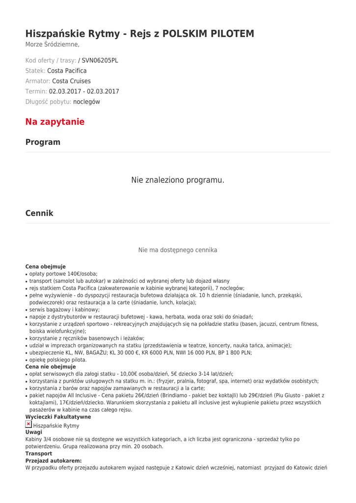 Hiszpańskie Rytmy - Rejs z POLSKIM PILOTEM Morze Śródziemne, Kod oferty / trasy: / SVN06205PL Statek: Costa Pacifica Armator: Costa Cruises Termin: 02.03.2017 - 02.03.2017 Długość pobytu: noclegów Na zapytanie Program Nie znaleziono programu. Cennik Nie ma dostępnego cennika Cena obejmuje opłaty portowe 140€/osoba; transport (samolot lub autokar) w zależności od wybranej oferty lub dojazd własny rejs statkiem Costa Pacifica (zakwaterowanie w kabinie wybranej kategorii), 7 noclegów; pełne wyżywienie - do dyspozycji restauracja bufetowa działająca ok. 10 h dziennie (śniadanie, lunch, przekąski, podwieczorek) oraz restauracja a la carte (śniadanie, lunch, kolacja); serwis bagażowy i kabinowy; napoje z dystrybutorów w restauracji bufetowej - kawa, herbata, woda oraz soki do śniadań; korzystanie z urządzeń sportowo - rekreacyjnych znajdujących się na pokładzie statku (basen, jacuzzi, centrum fitness, boiska wielofunkcyjne); korzystanie z ręczników basenowych i leżaków; udział w imprezach organizowanych na statku (przedstawienia w teatrze, koncerty, nauka tańca, animacje); ubezpieczenie KL, NW, BAGAŻU; KL 30 000 €, KR 6000 PLN, NWI 16 000 PLN, BP 1 800 PLN; opiekę polskiego pilota. Cena nie obejmuje opłat serwisowych dla załogi statku - 10,00€ osoba/dzień, 5€ dziecko 3-14 lat/dzień; korzystania z punktów usługowych na statku m. in.: (fryzjer, pralnia, fotograf, spa, internet) oraz wydatków osobistych; korzystania z barów oraz napojów zamawianych w restauracji a la carte; pakiet napojów All Inclusive - Cena pakietu 26€/dzień (Brindiamo - pakiet bez koktajli) lub 29€/dzień (Piu Giusto - pakiet z koktajlami), 17€/dzień/dziecko. Warunkiem skorzystania z pakietu all inclusive jest wykupienie pakietu przez wszystkich pasażerów w kabinie na czas całego rejsu. Wycieczki Fakultatywne ● ● ● ● ● ● ● ● ● ● ● ● ● ● ● Hiszpańskie Rytmy Uwagi Kabiny 3/4 osobowe nie są dostępne we wszystkich kategoriach, a ich liczba jest ograniczona - sprzedaż tylko po potwierdzeniu. Grupa realizowana przy min. 20 osobach. Transport Przejazd autokarem: W przypadku oferty przejazdu autokarem wyjazd następuje z Katowic dzień wcześniej, natomiast przyjazd do Katowic dzień później. Dla chętnych możliwość skorzystania z antenek do miejsca wyjazdu autokaru: z Krakowa 25€/osoba/dwie strony z Wrocławia 30€/osoba/dwie strony Przelot samolotem: Wylot w dniu rozpoczęcia rejsu, powrót wieczorny w dniu zakończenia rejsu. W cenie zawarte transfery lotnisko/port/lotnisko. Przy wylotach z Warszawy dla chętnych możliwość skorzystania z transferu na lotnisko w Warszawie (opcjonalnie) - cena 50€/os. w dwie strony * * miejsca wsiadania: Kraków, Katowice, Żory, Rybnik, Częstochowa. Możliwy transfer z Wrocławia przy minimum 6 osobach. Opublikowane informacje nie stanowią oferty handlowej w rozumieniu kodeksu cywilnego